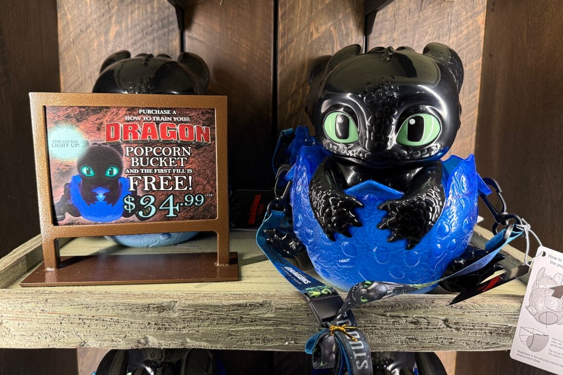 Each dragon also has a unique color and flavor of bagged popcorn. The Toothless bag is a bright blue color with a blue raspberry flavor.