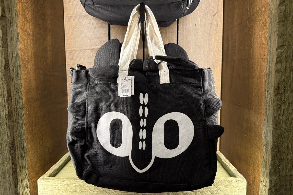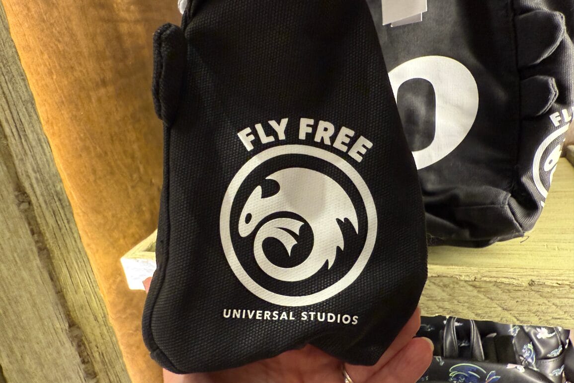 The side of the tote bag has a white Toothless emblem with the words “FLY FREE” in all capital letters above it and “UNIVERSAL STUDIOS” below it.