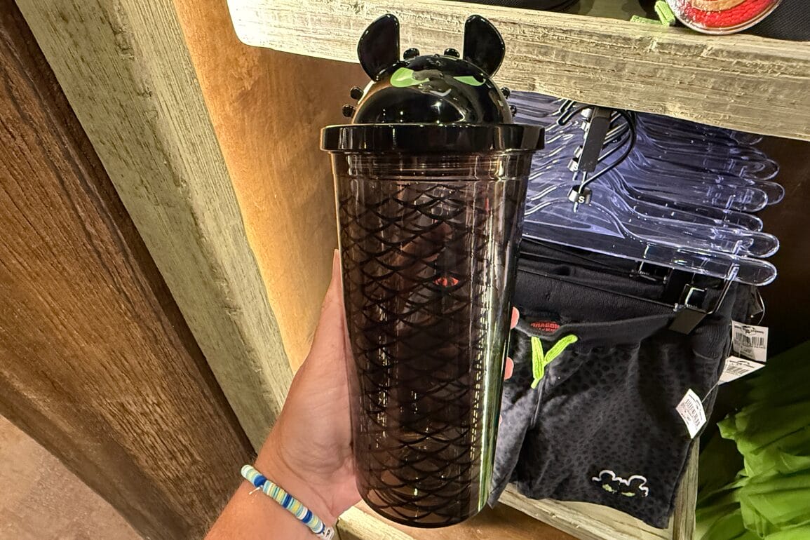 On the other hand, this plastic tumbler is ready to go on an adventure with a black plastic lid that features a Toothless-inspired dome. The tumbler itself is clear with a black scale overlay.