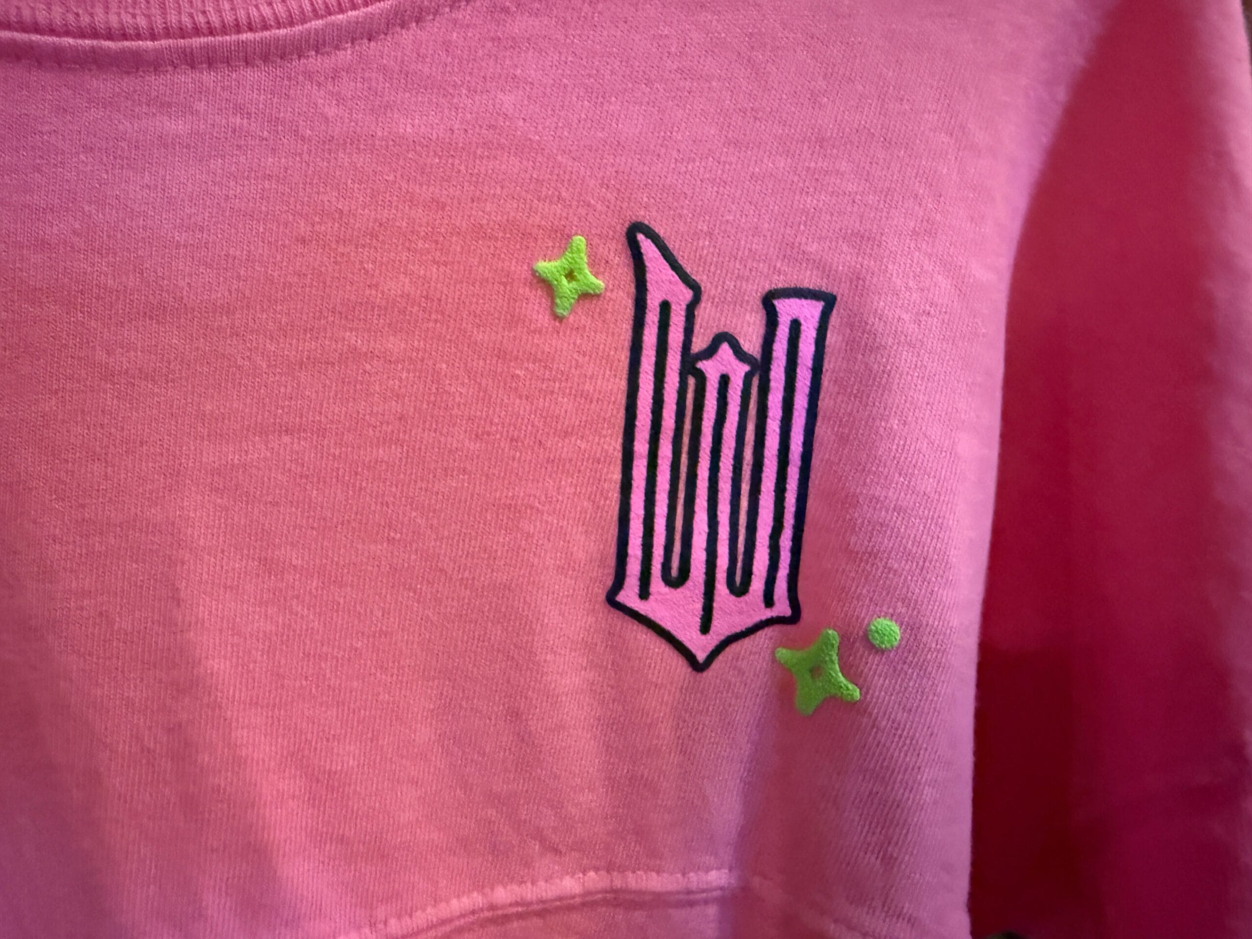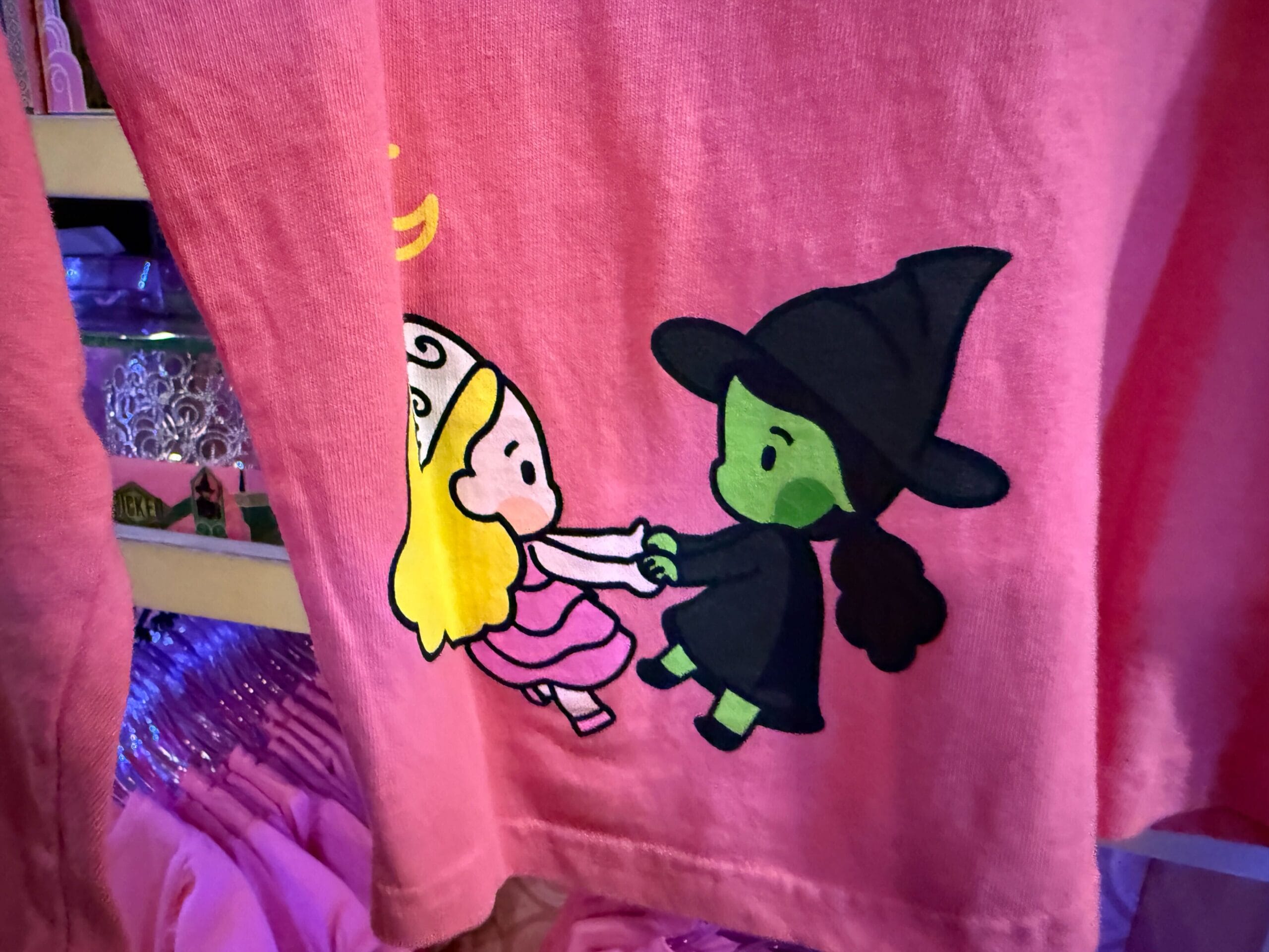 A pink “W” is on the chest with green puffy ink sparkles. Glinda and Elphaba are pictured dancing together on the lower torso.