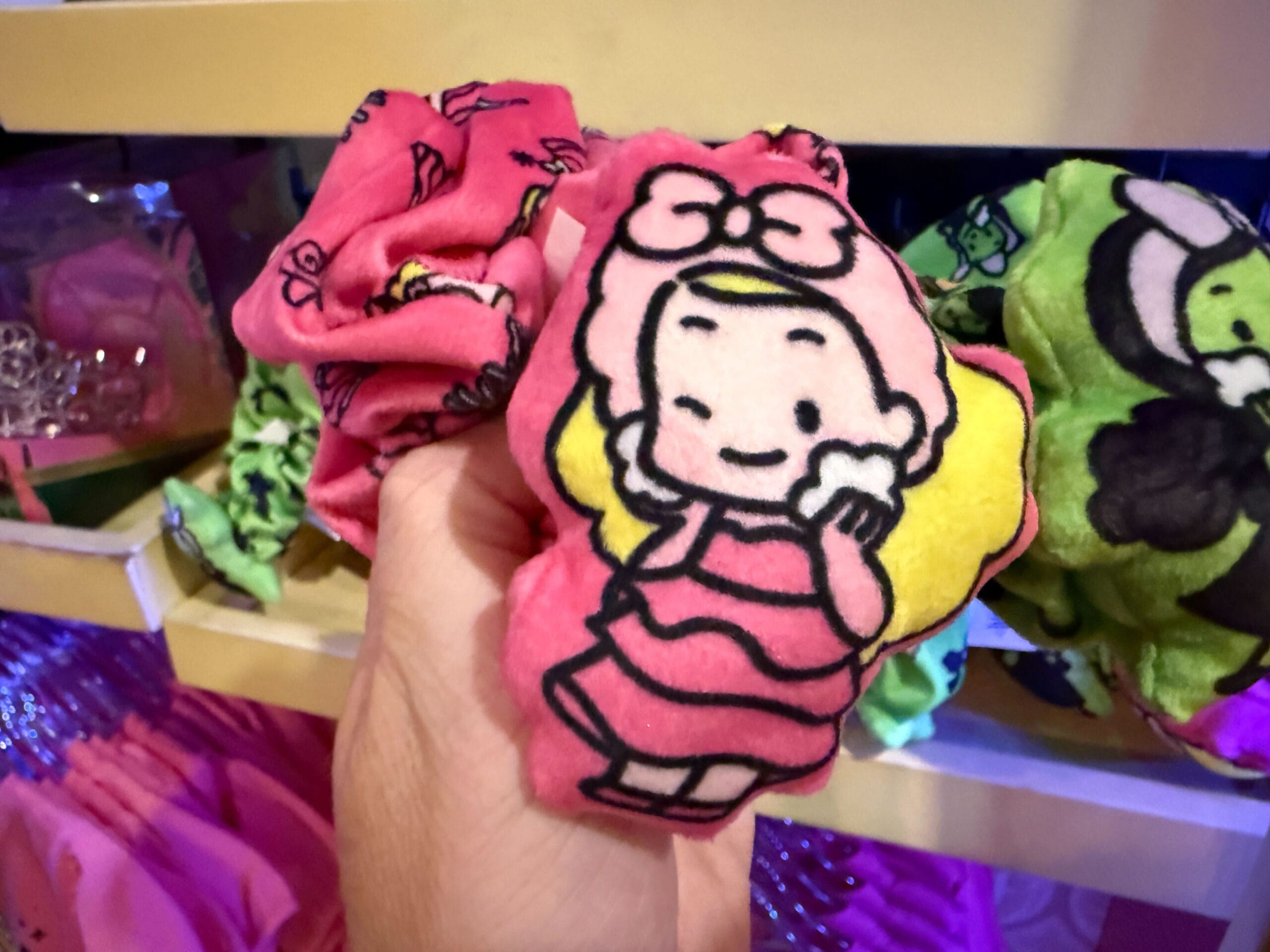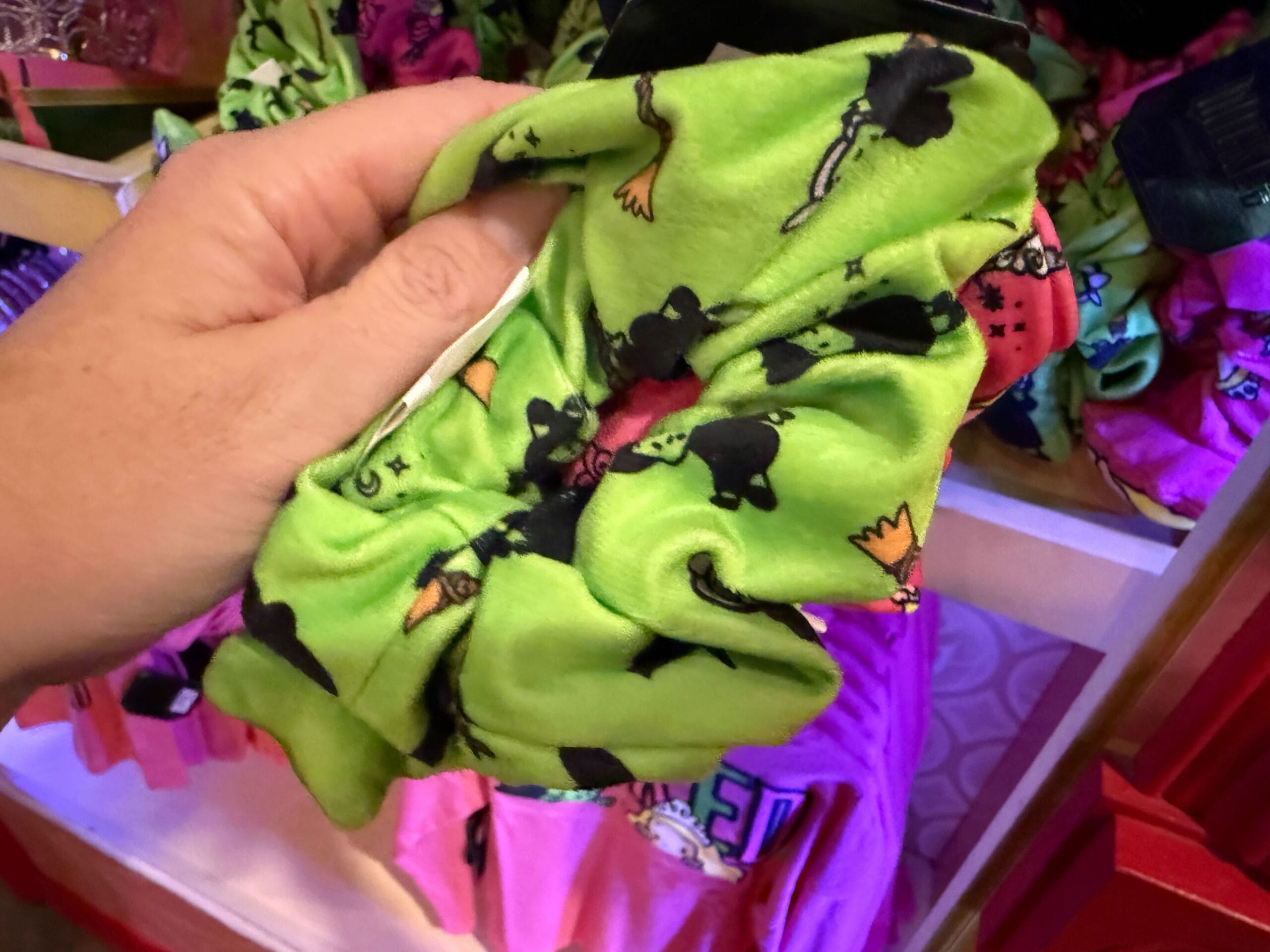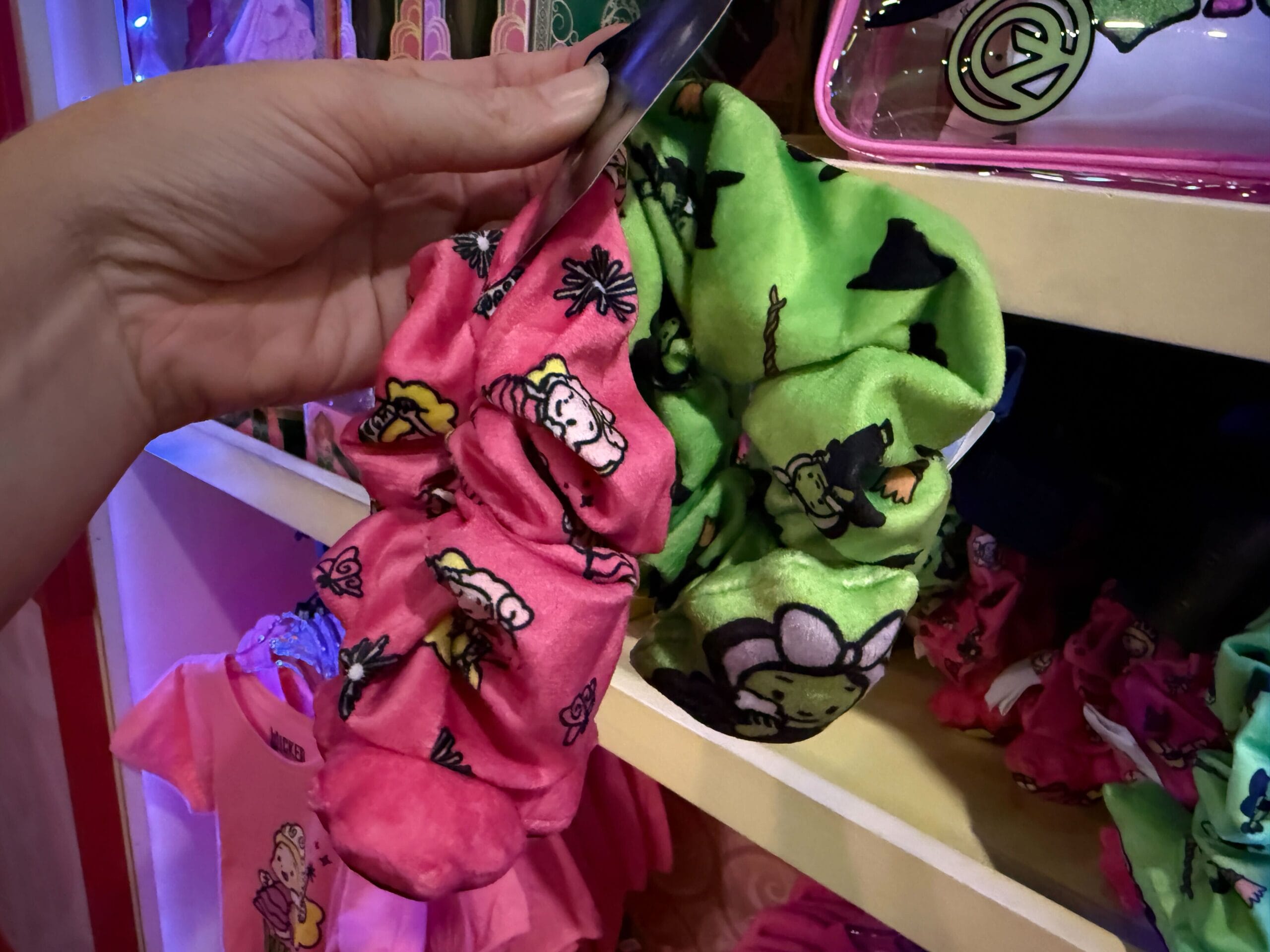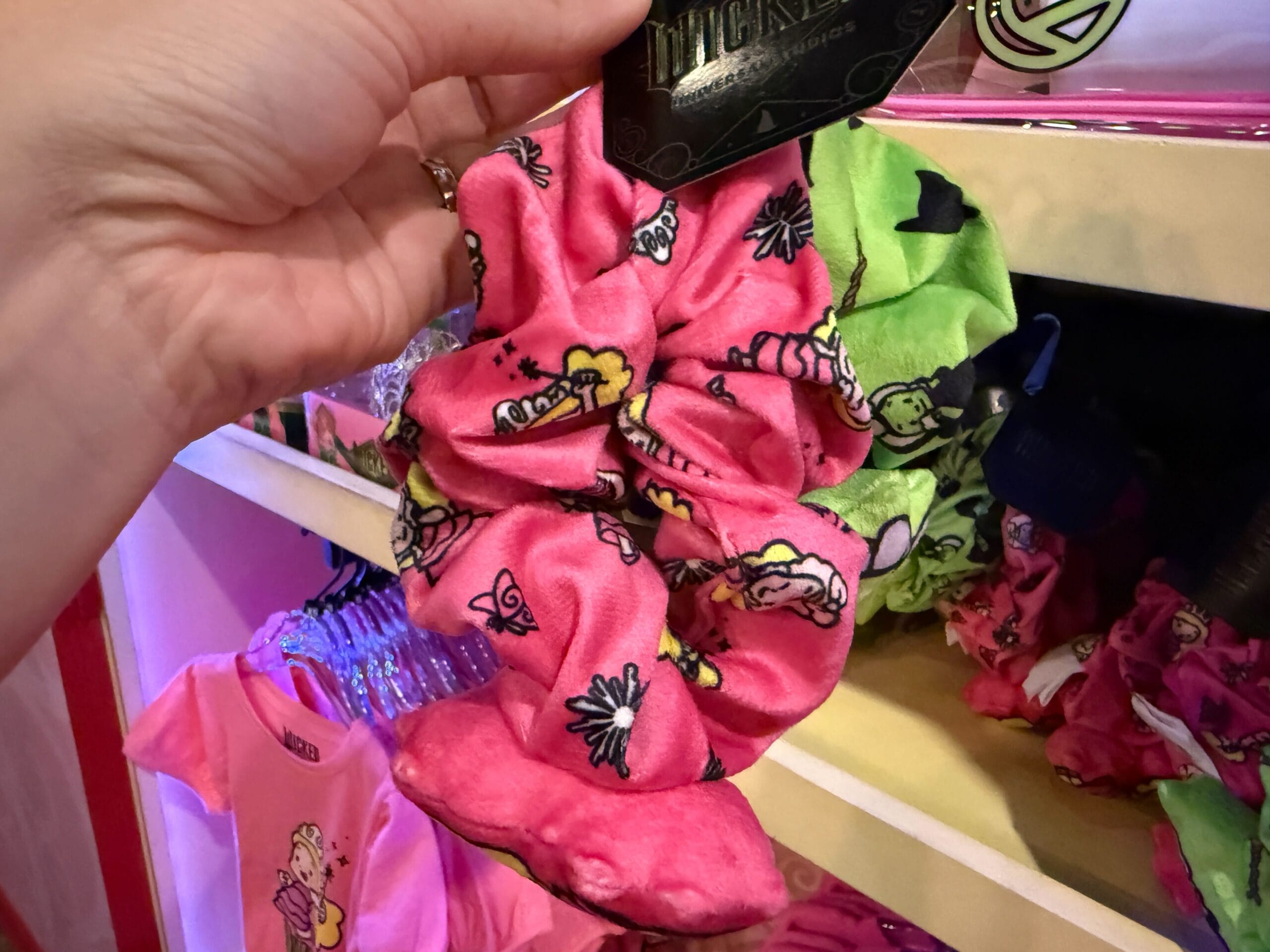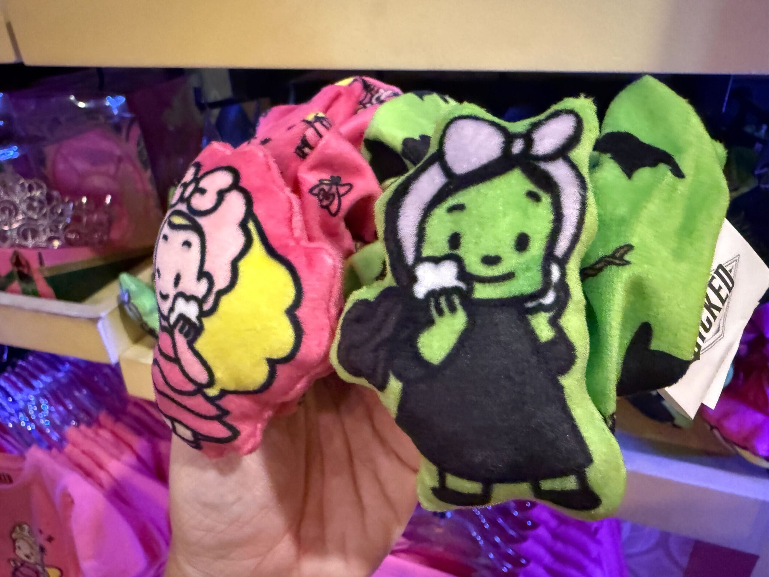 The lime green scrunchie has an Elphaba pattern and plush. The witches are pictured scrubbing their faces with their hair pulled back by bows.