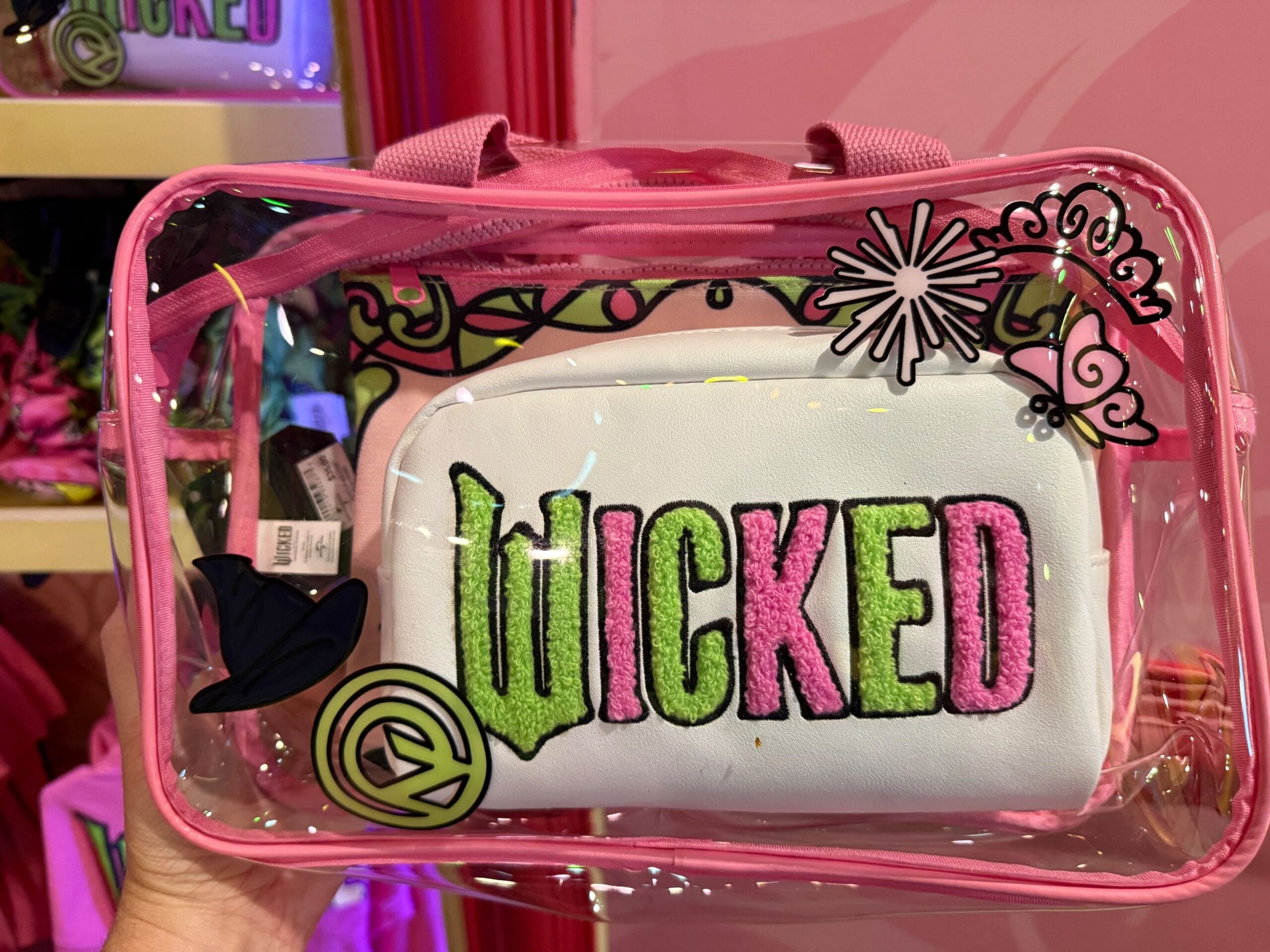 There are three pouches in this set. The largest is a clear zip case with pink trim and handles. Wicked iconography is on the front. The smallest case is white with “Wicked” in chenille green and pink. A third pouch is link pink with brighter pink and green filigree.