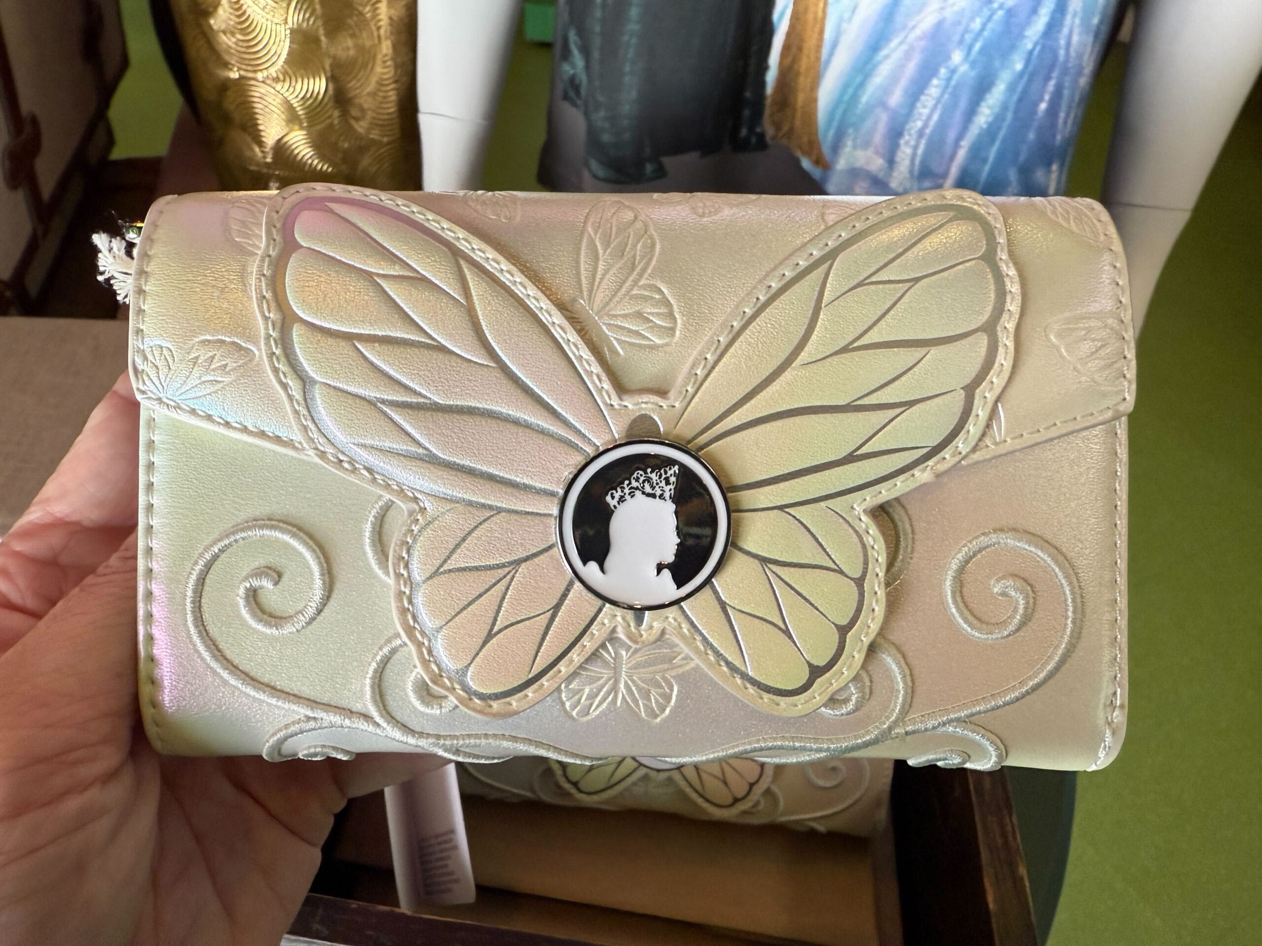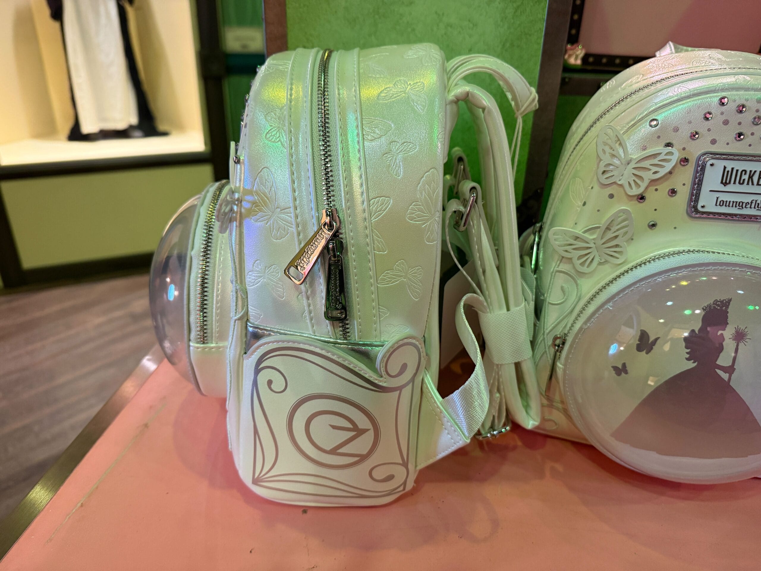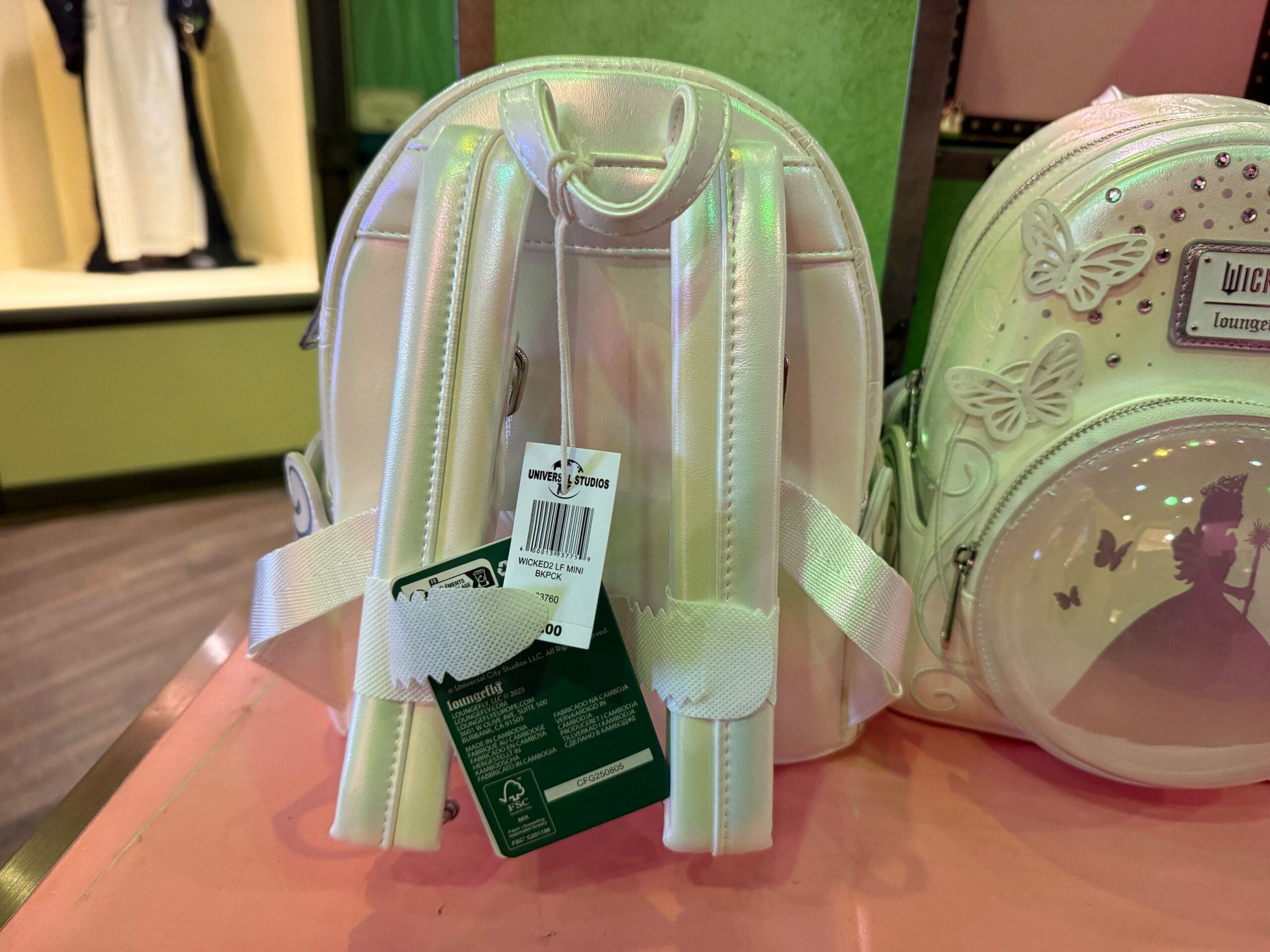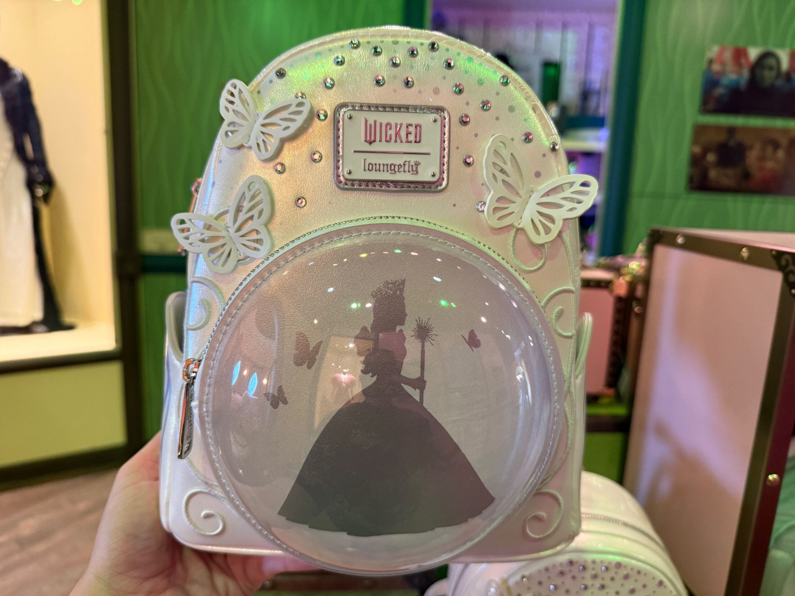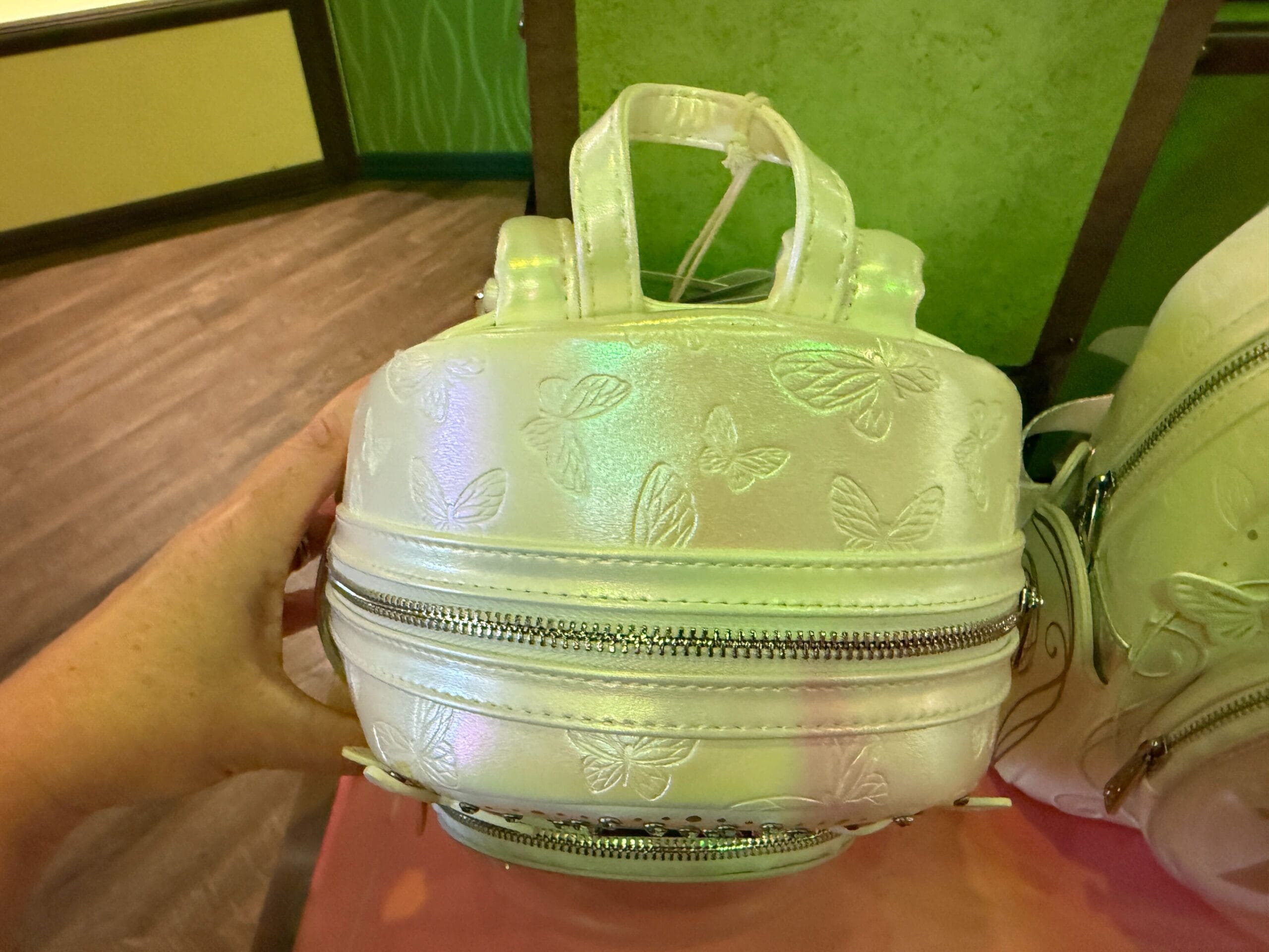 This bag is made of shiny pink-white faux leather with an iridescent finish. The front pocket is adorned with a transparent bubble over the silhouette of Glinda and butterflies. Across the front are white butterfly appliqués, embroidered filigree, and gems.