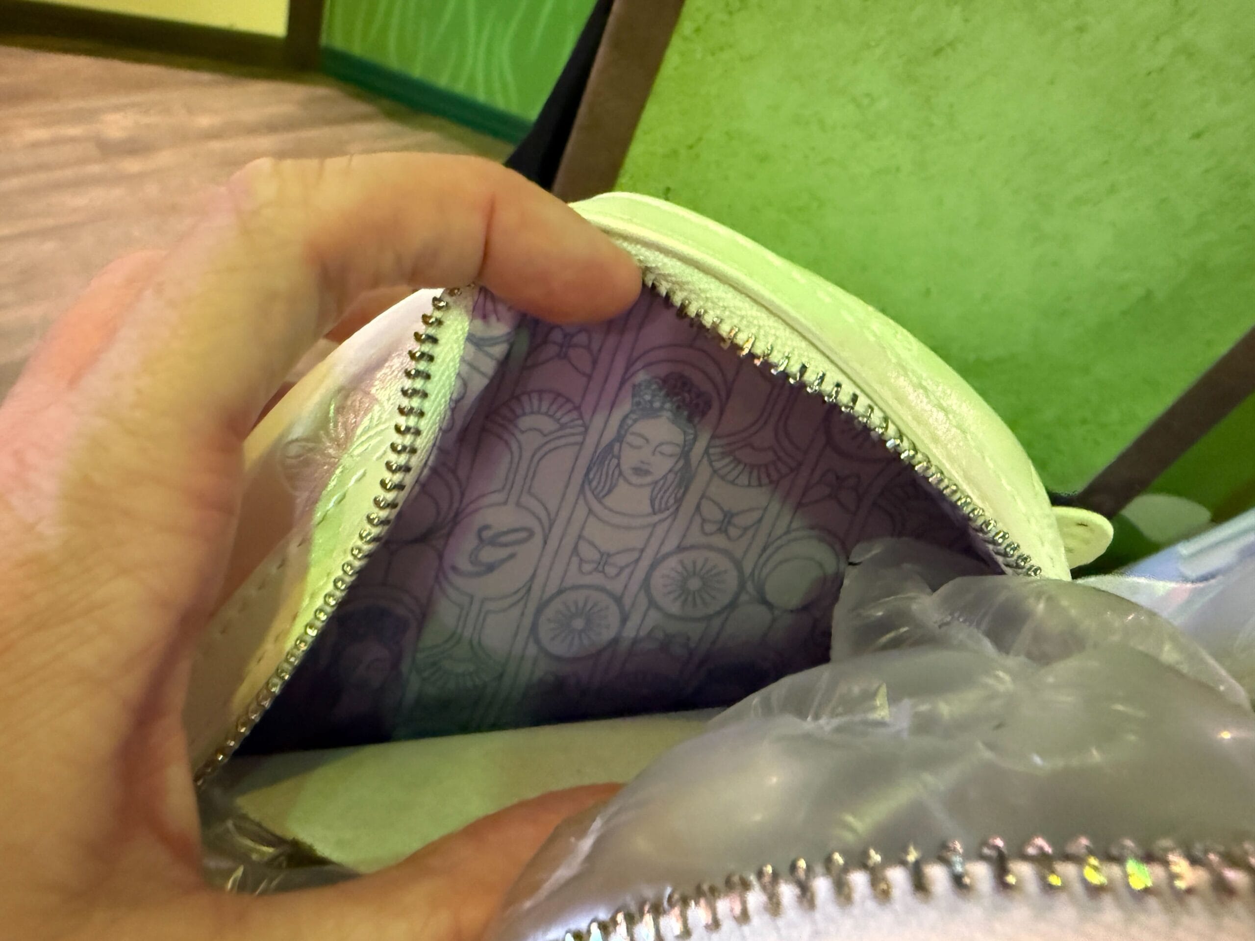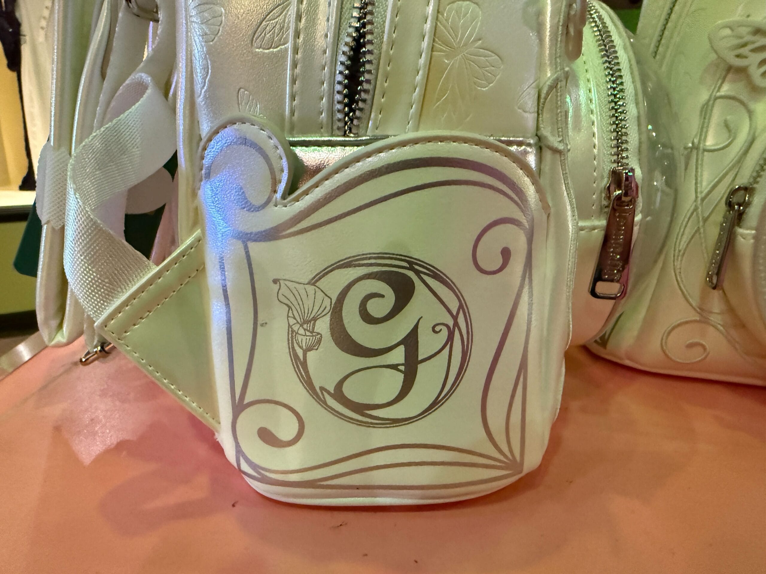 The purple interior lining features images of Glinda, the starburst of her bubble wand, butterflies, and her “G” emblem.