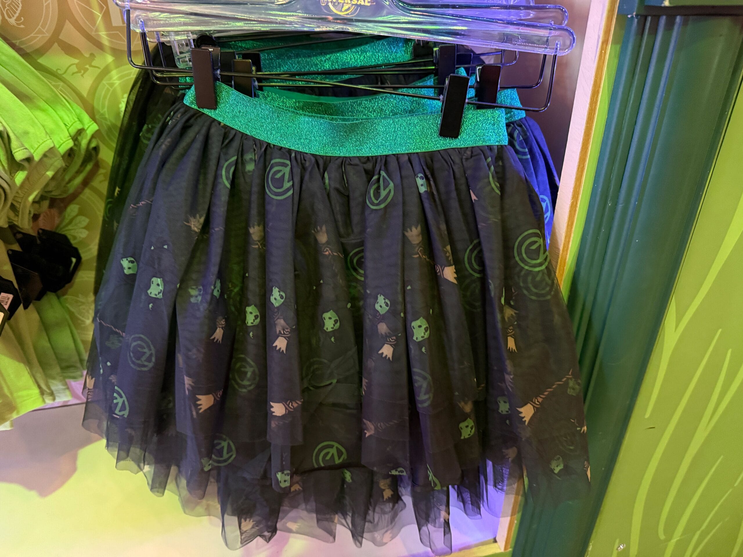 This black tulle skirt is patterned with green and brown images like Elphaba’s broom and the Oz logo. The waistband is sparkly green elastic.