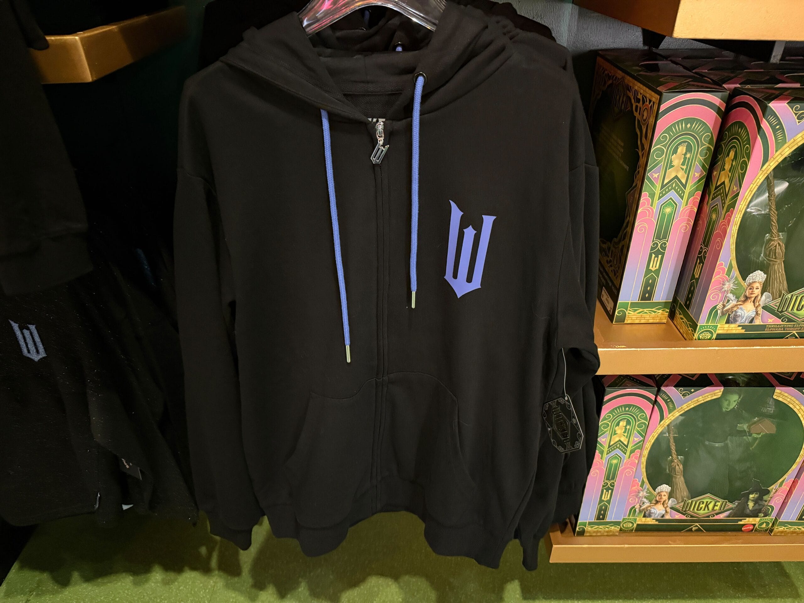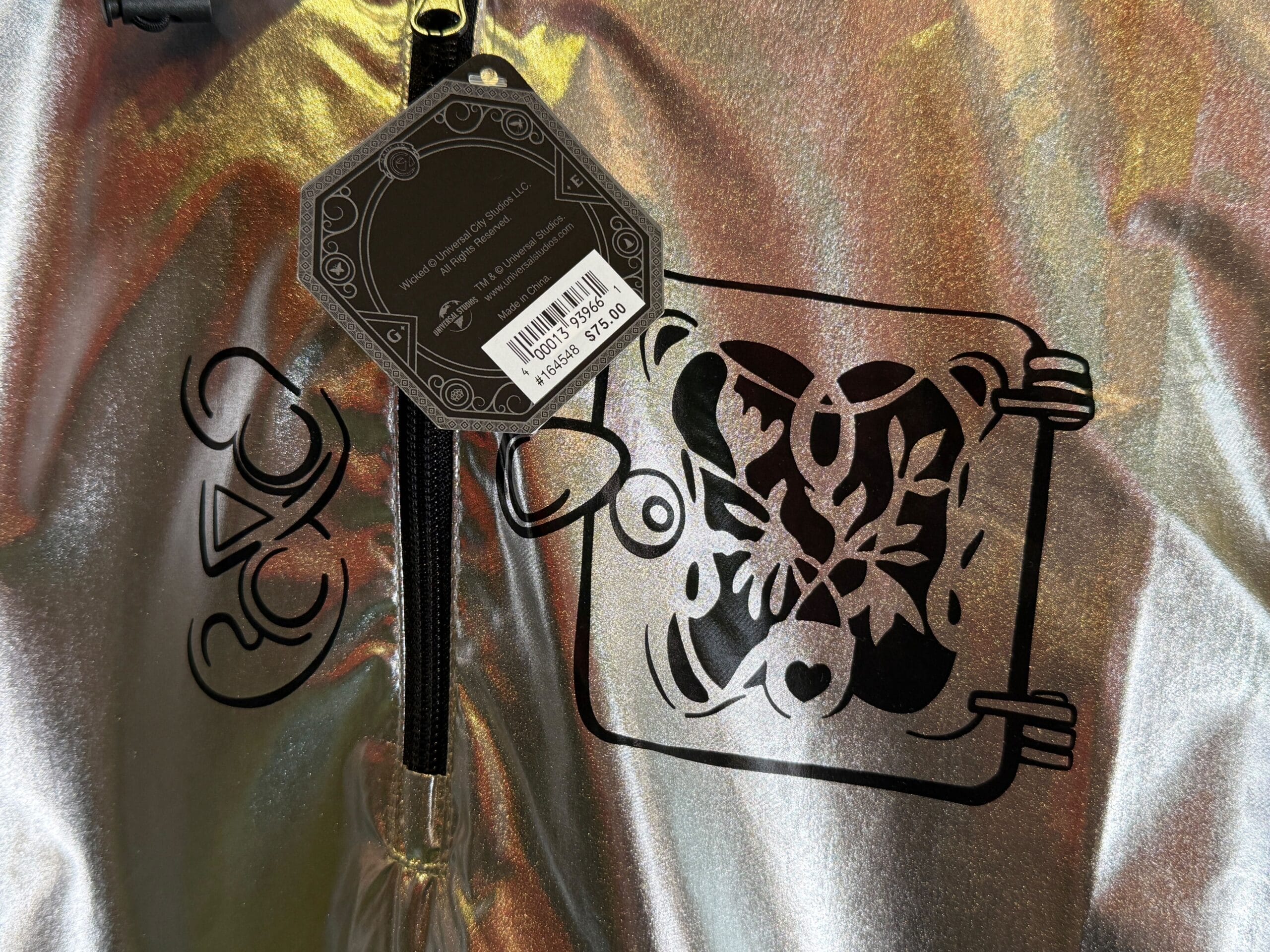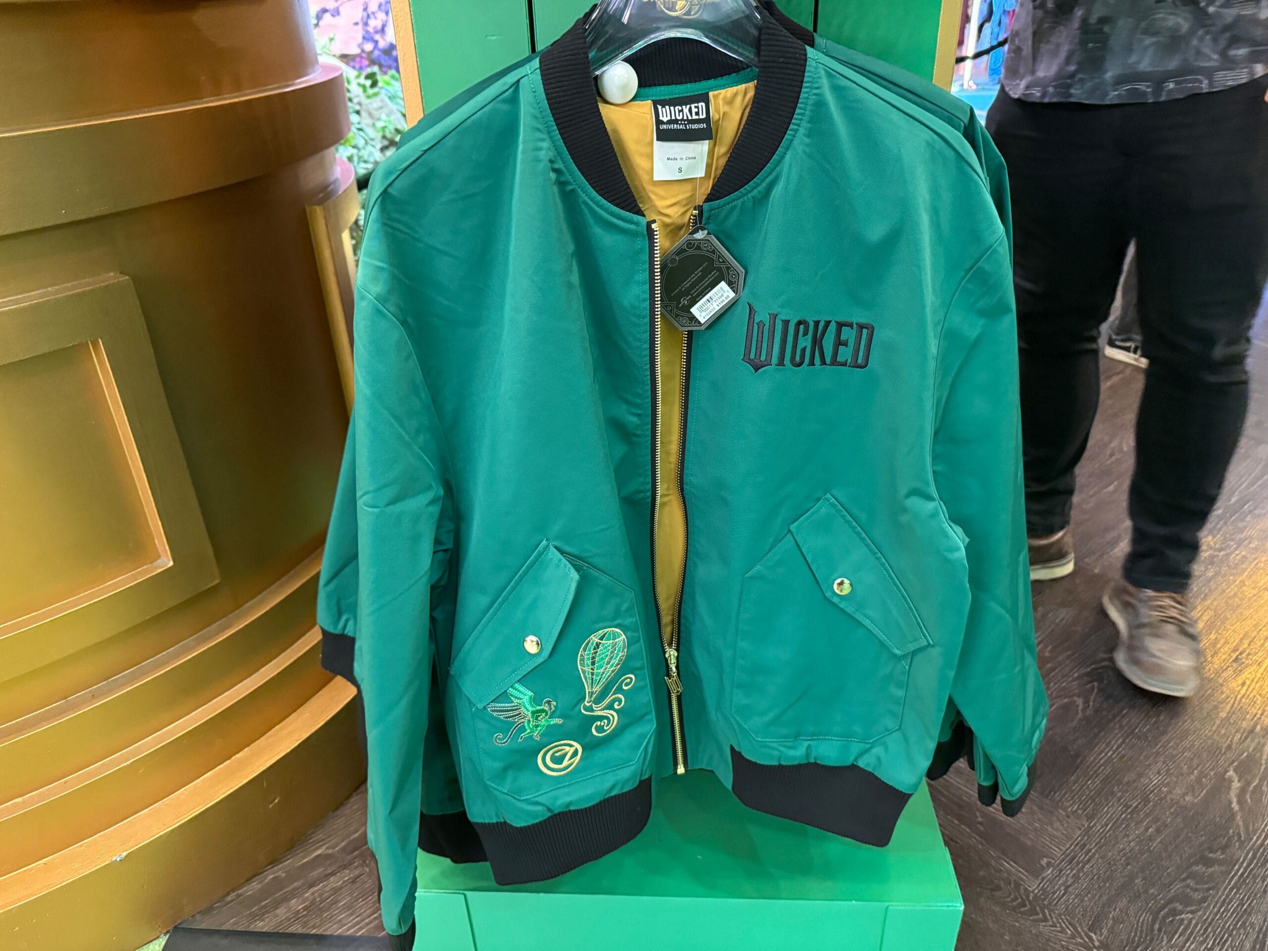 This jacket is green with yellow lining. Black ribbed fabric is on the collar, hem, and cuffs. “Wicked” is embroidered on the left chest. A flying monkey, Oz logo, and hot air balloon are embroidered on the right pocket. The zipper pull is the “W” logo.
