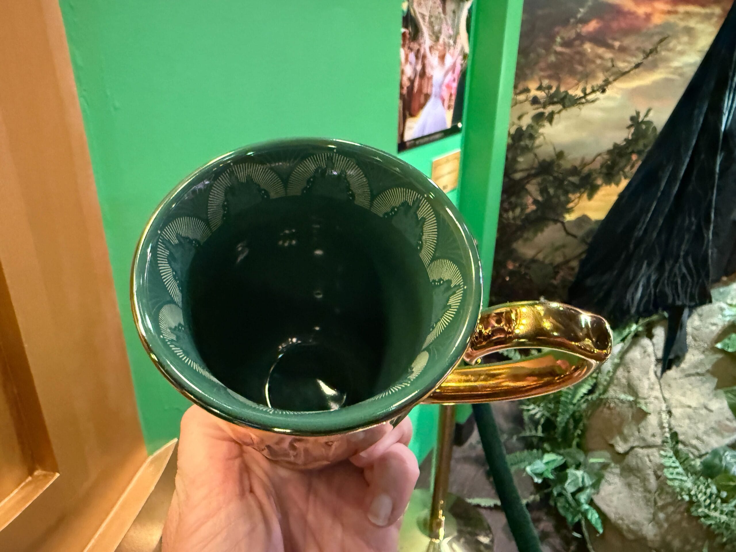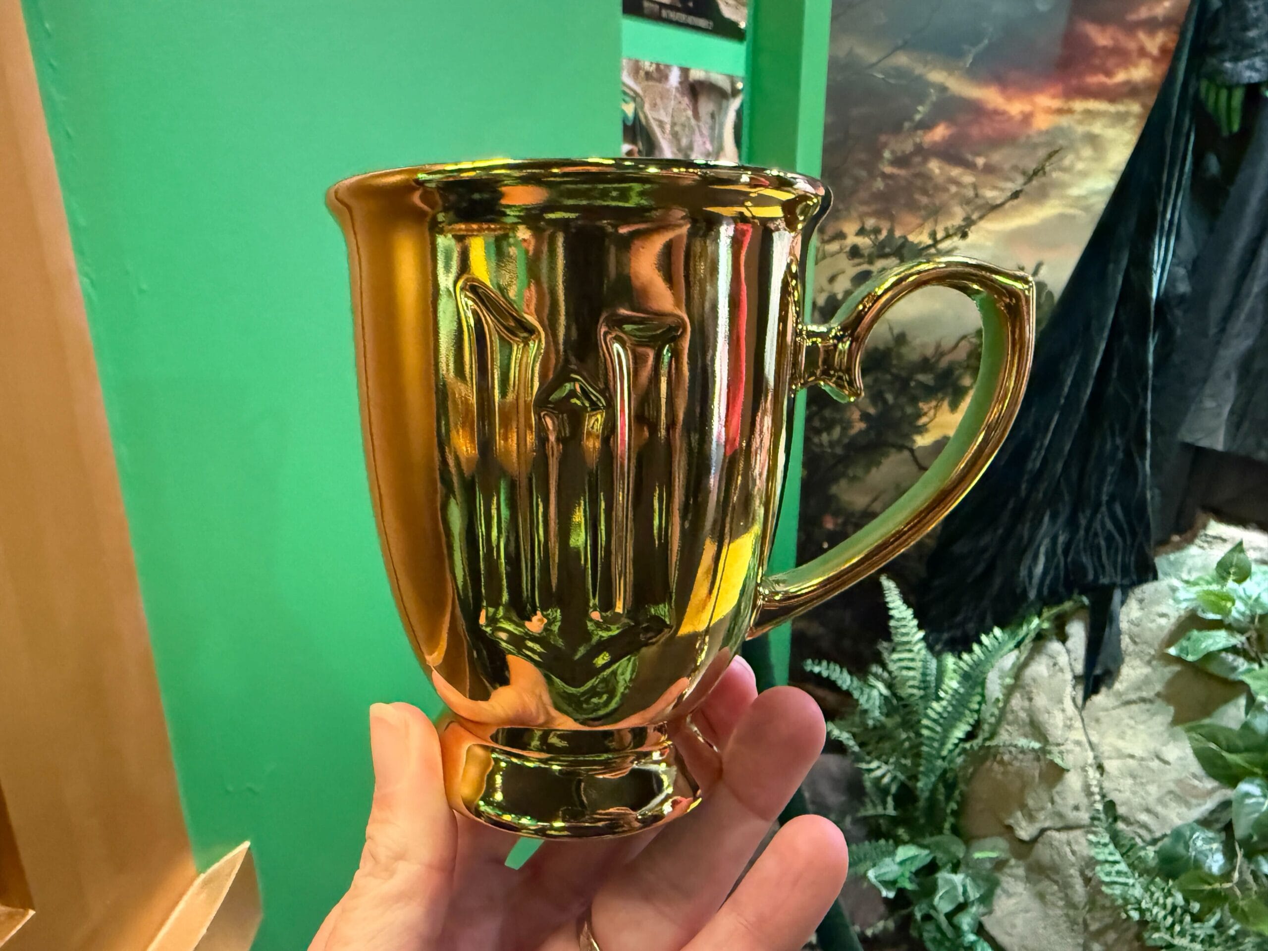 This is a shiny gold mug with a green interior The “W” logo is stamped on one side. An Emerald City design patterns the rim.