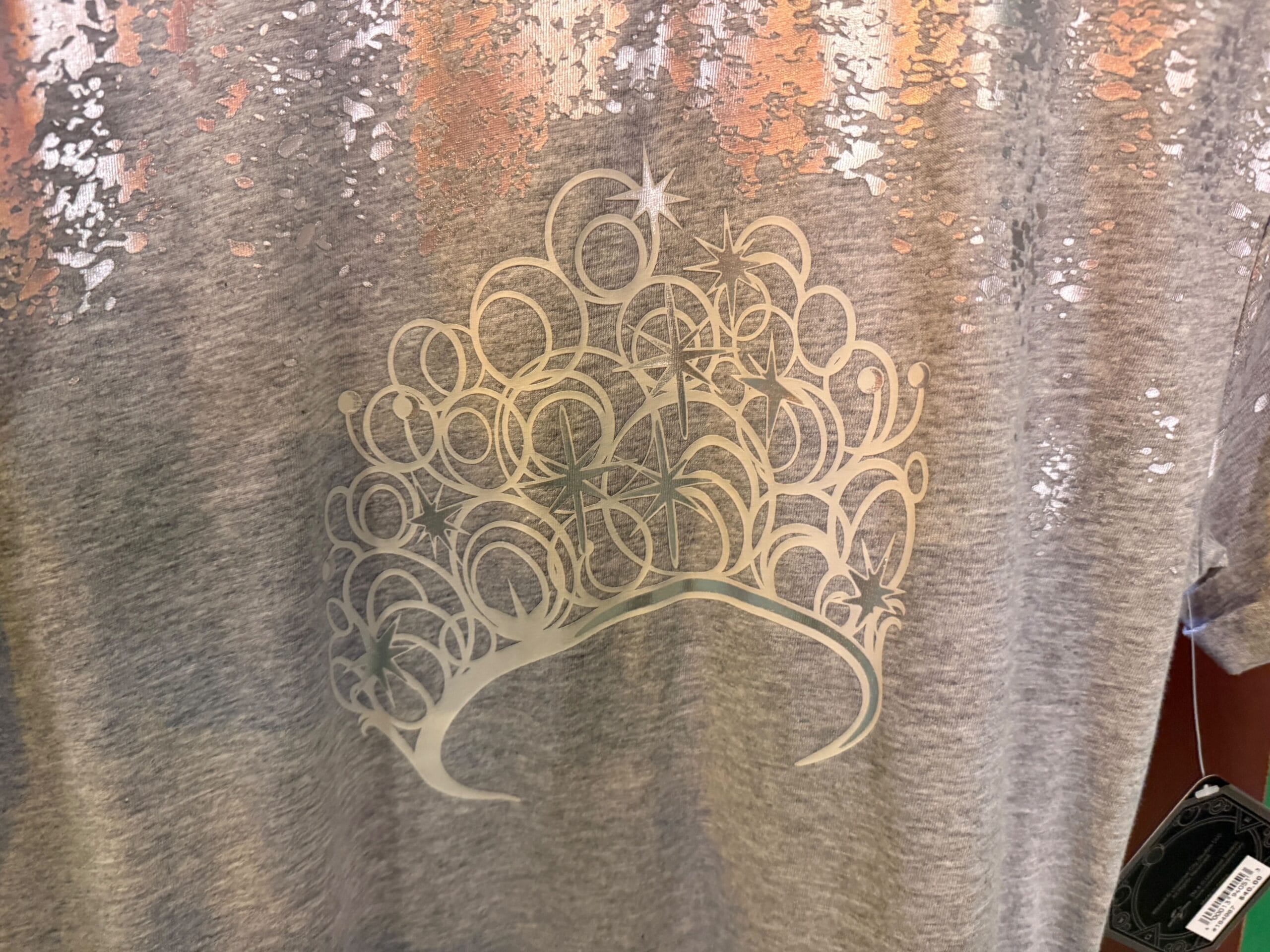 The matching Glinda t-shirt features her bubble crown in white against a heather gray background. Shiny details are across the shoulders, dripping down towards the crown.