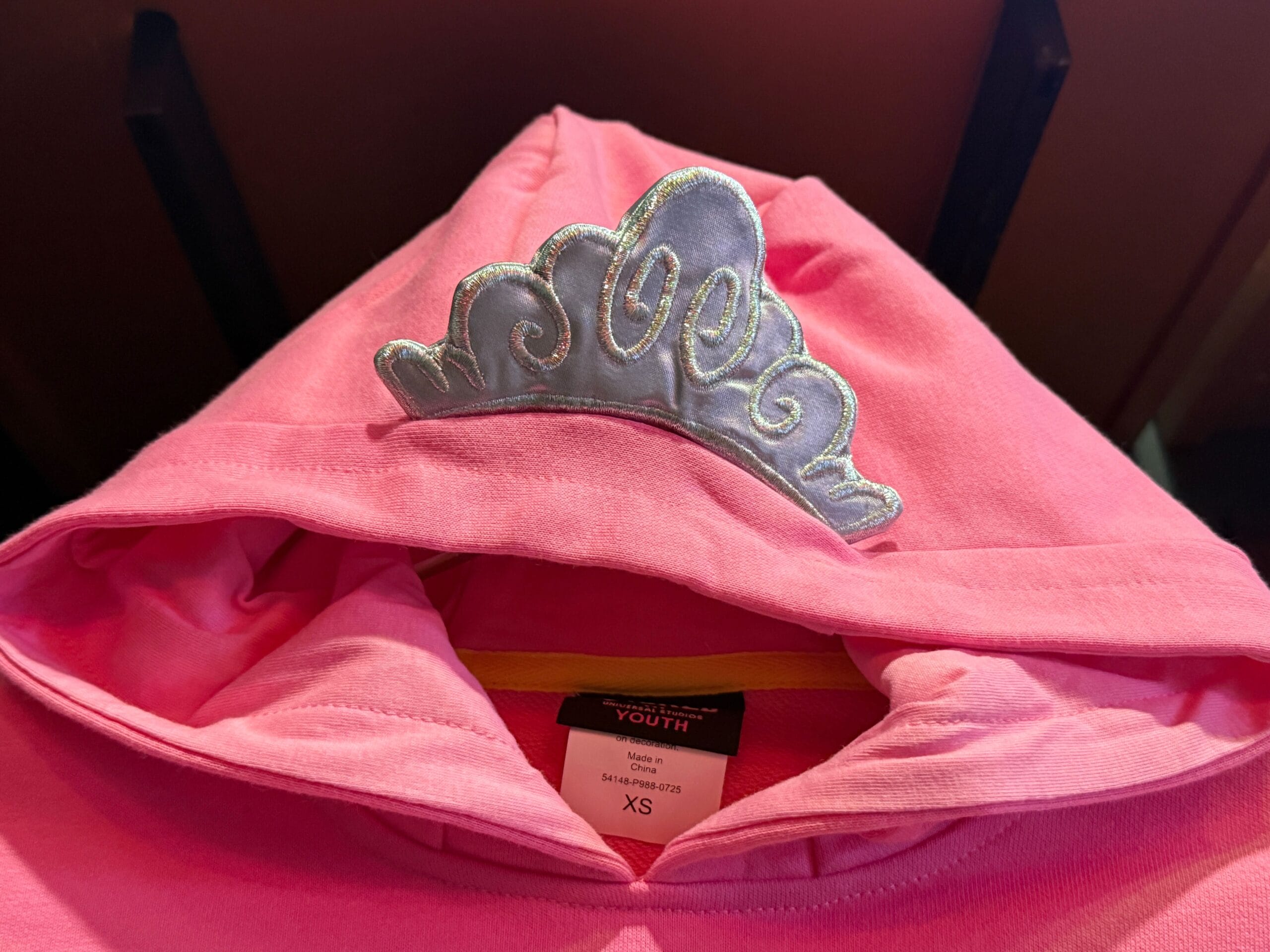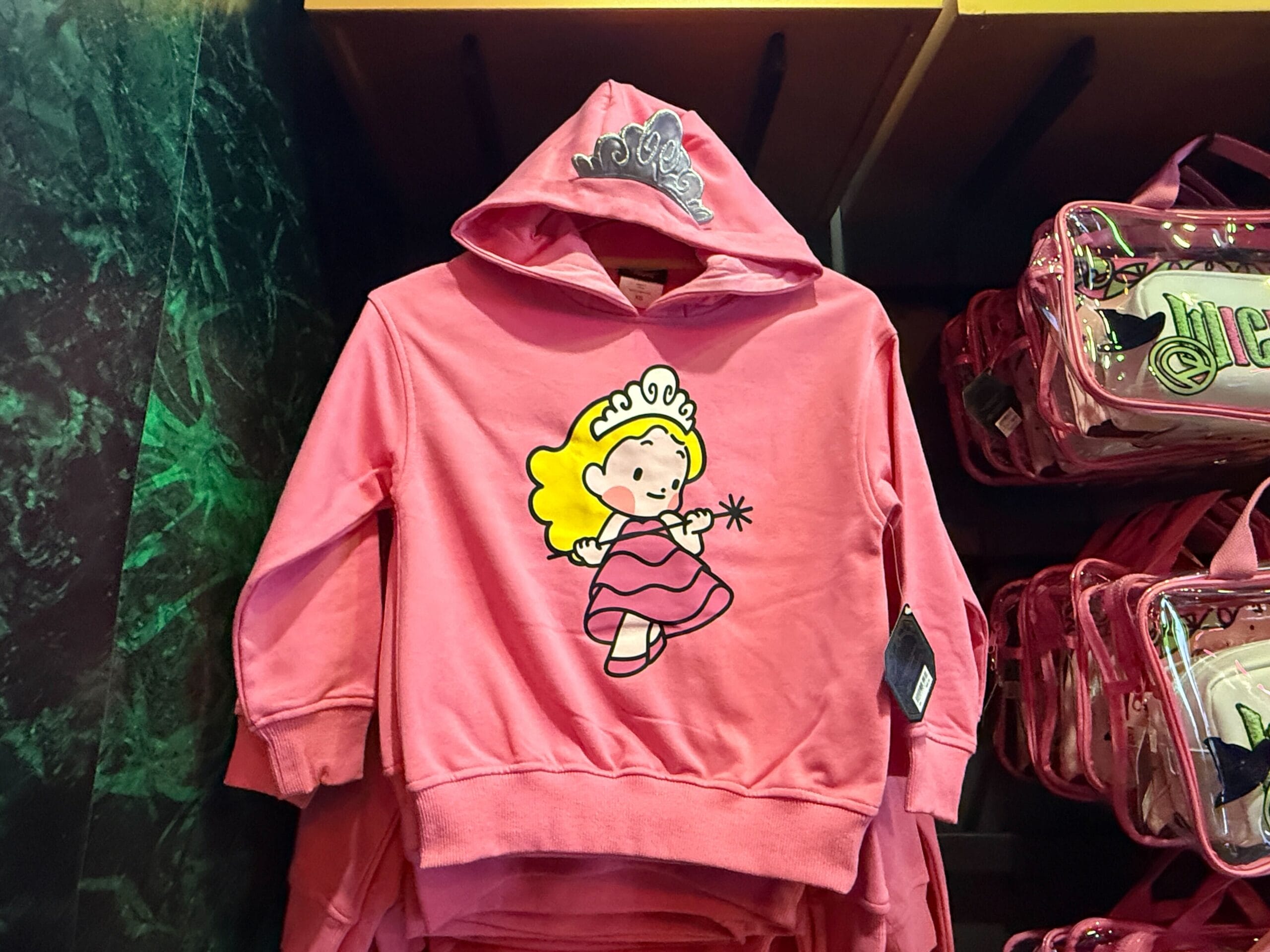 This collection features cutesy artwork of Glinda and Elphaba. On this pink pullover hoodie is Glinda in her pink dress and crown.