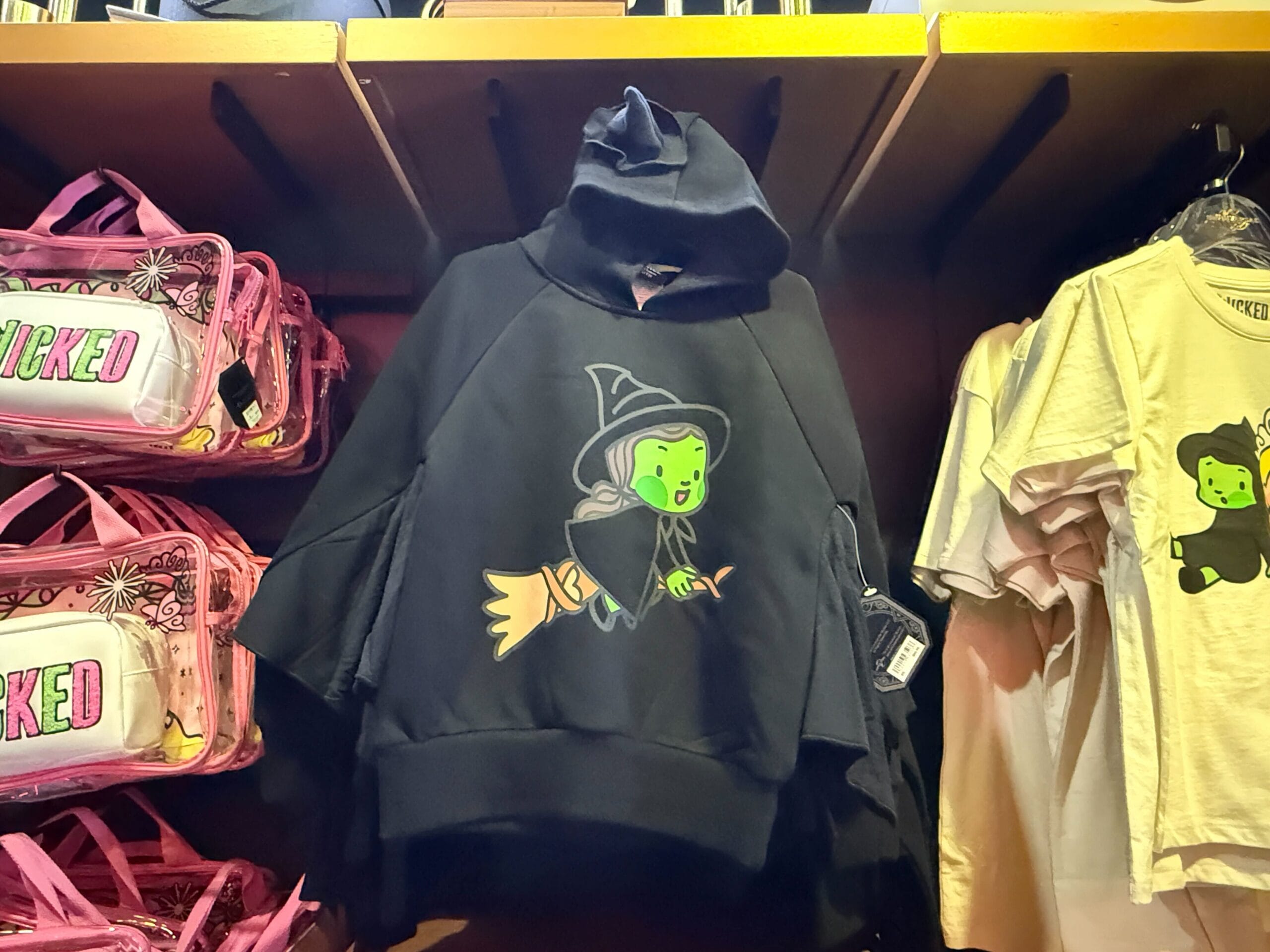 The Elphaba hoodie is all black with cape-like fabric between the torso and sleeves. Elphaba is pictured flying on her broom. The sweatshirt has an attached witch’s hat.