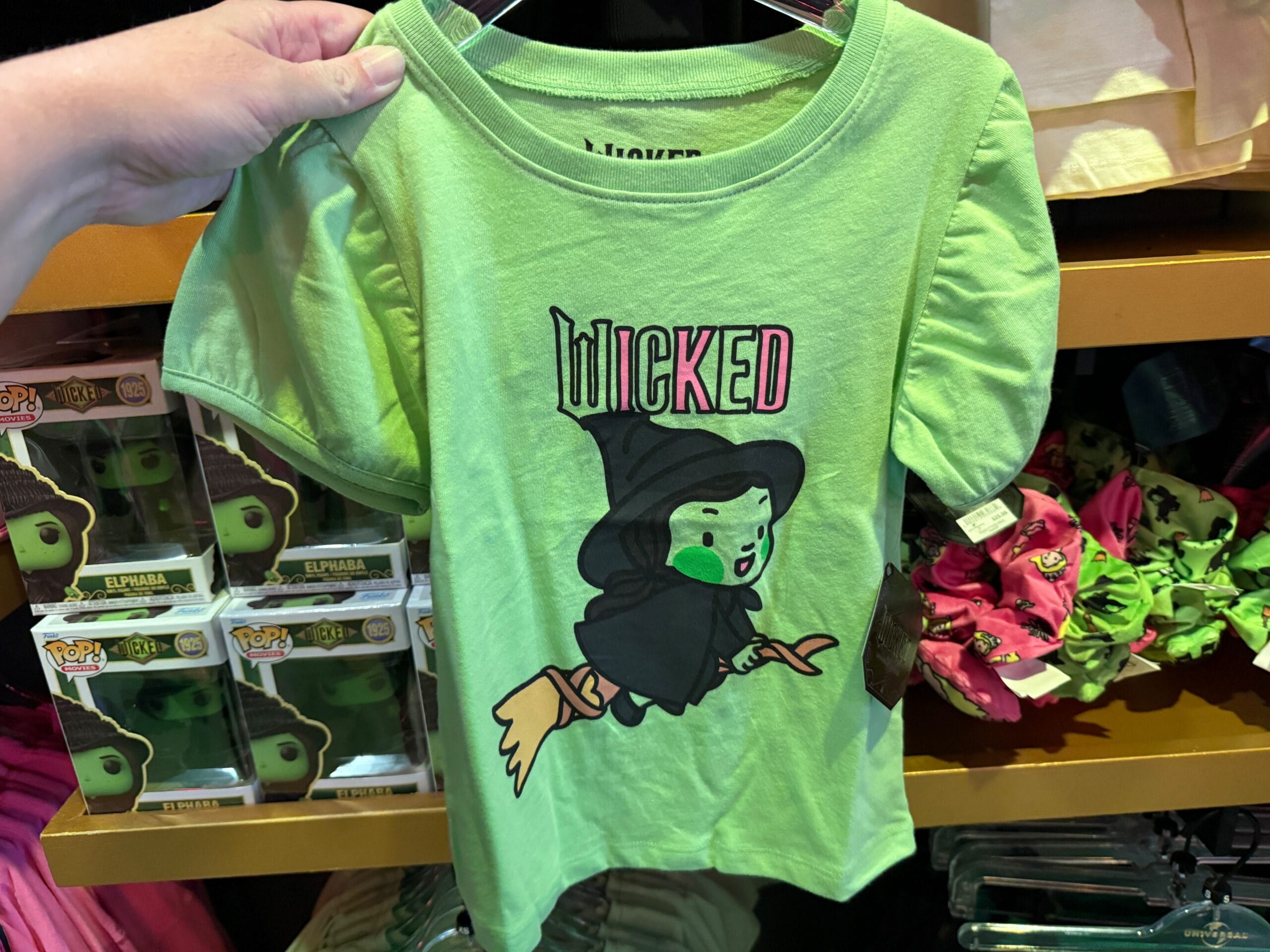 This shirt is pale green with puff sleeves. Elphaba is flying on her broom under the Wicked wordmark, which has pink and green letters.