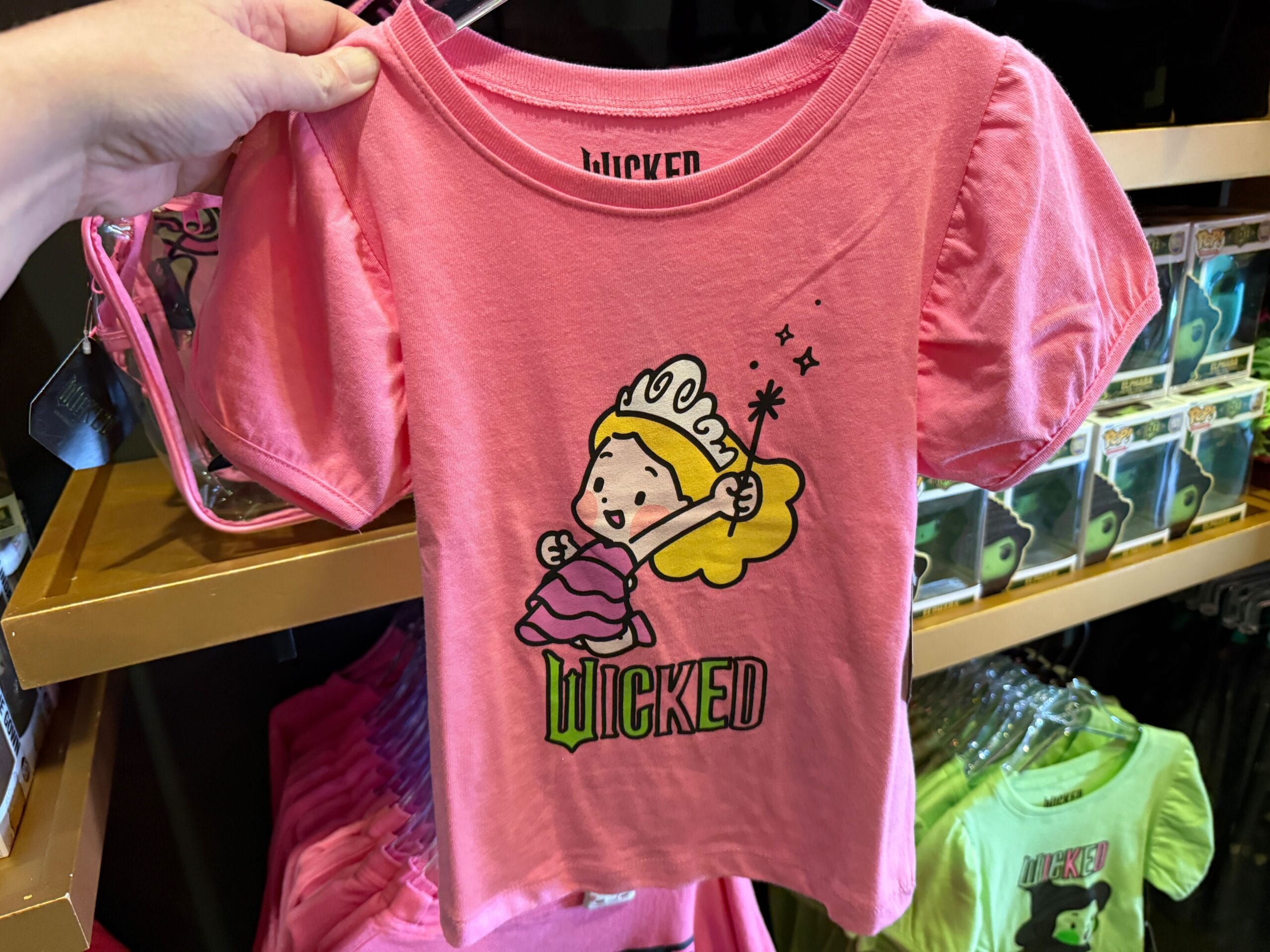 The Glinda shirt features her jumping for joy above the pink and green Wicked wordmark.