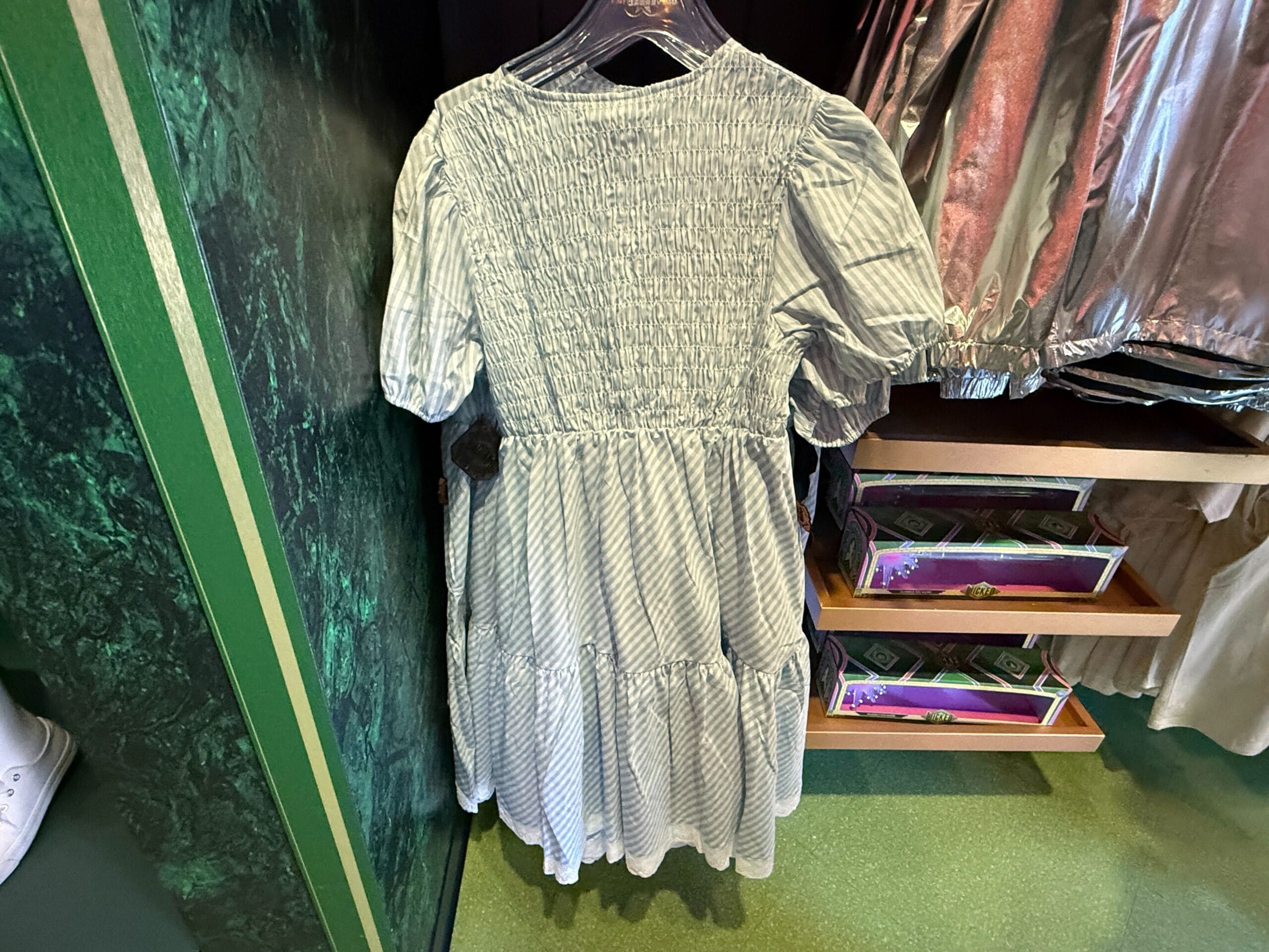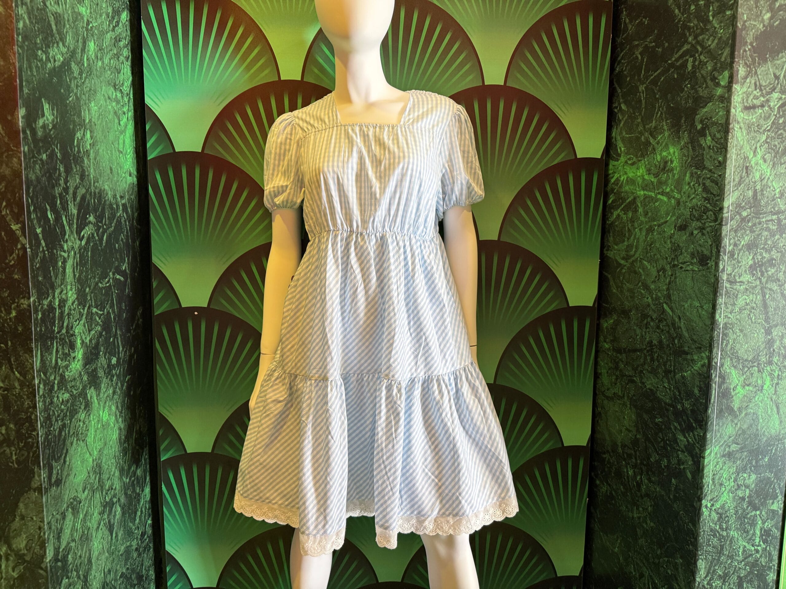 This dress is striped light blue and white, based on the dress worn by Dorothy in Wicked and The Wizard of Oz. It has puffy sleeves and white lace trim.