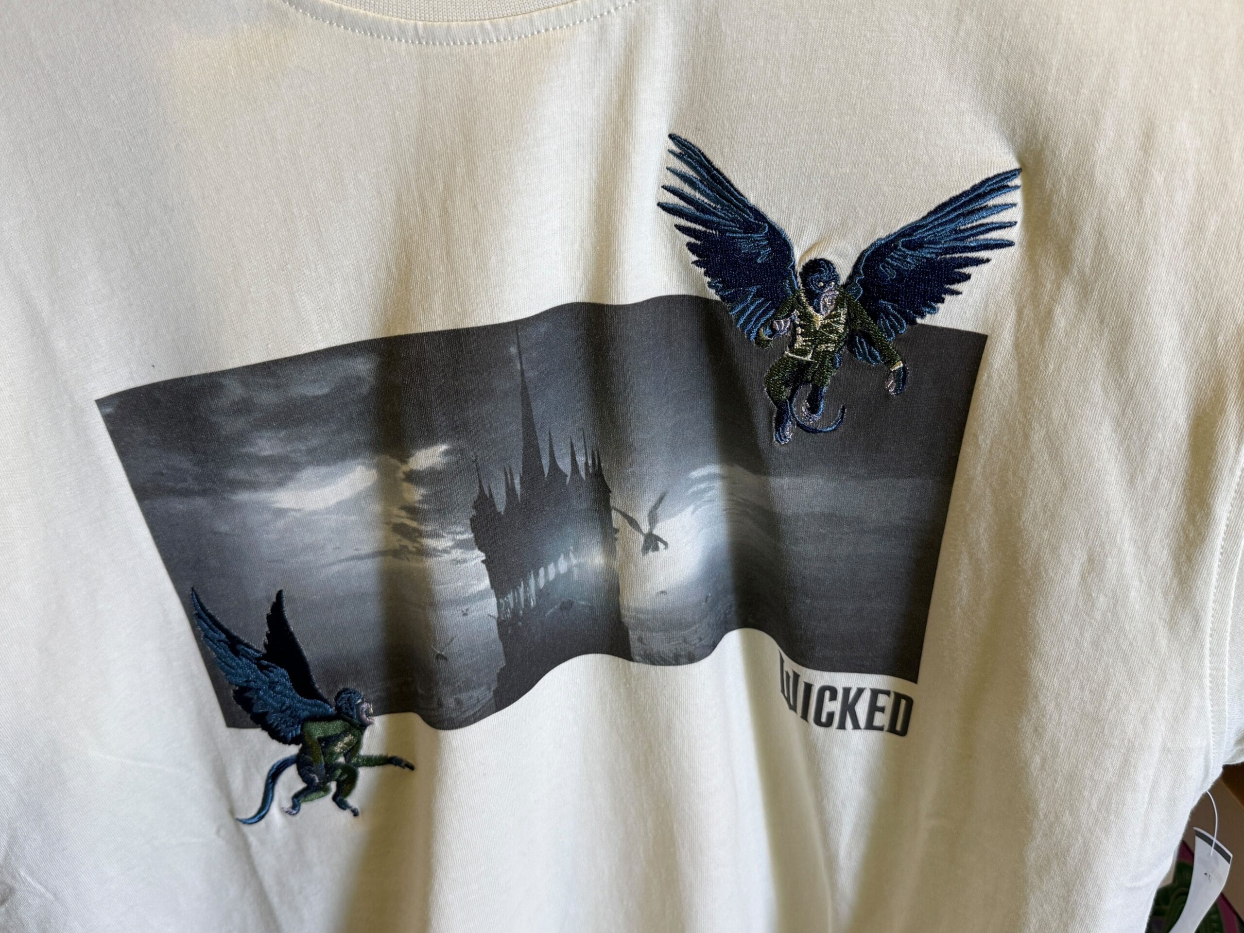 This is a white t-shirt with black and white art of Kiamo Ko on the chest. The castle is where Elphaba takes refuge in the second act of Wicked.