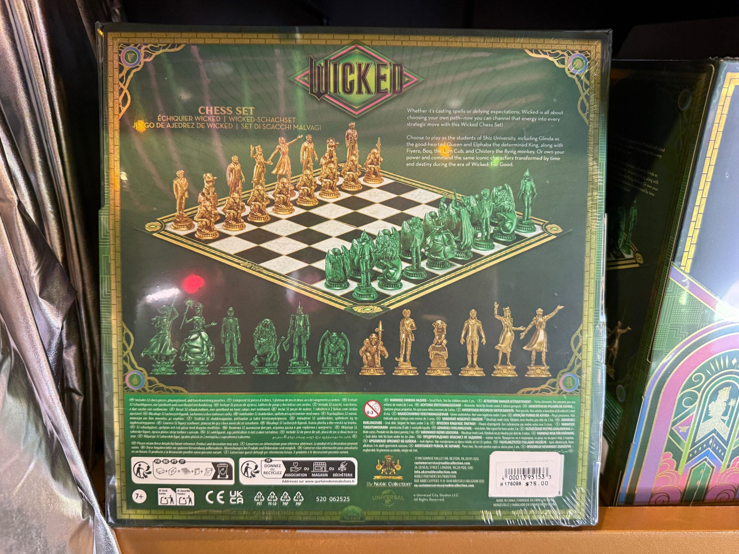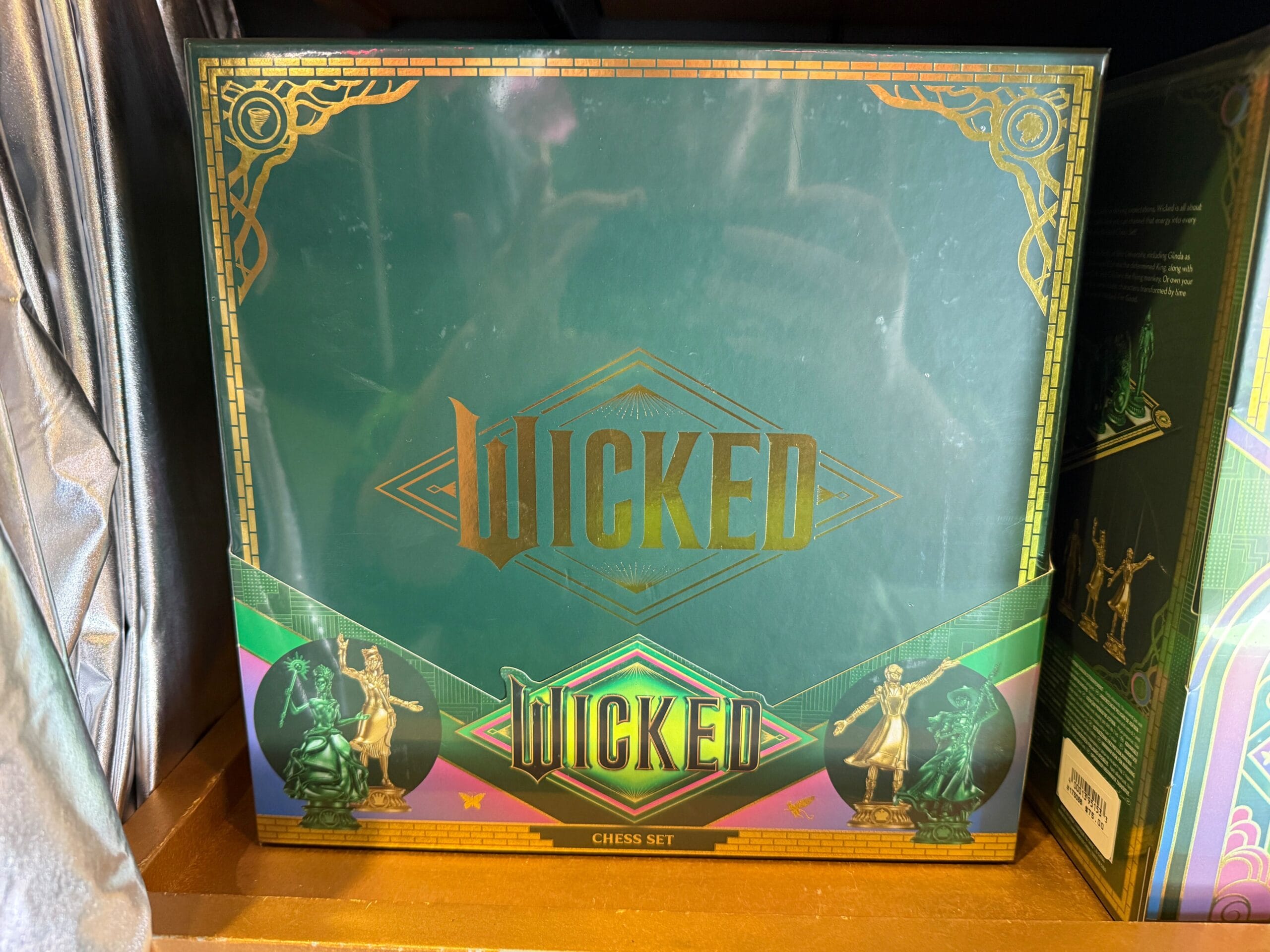 This chess set comes in a green box with golden filigree and the Wicked wordmark. Instead of white and black pieces, they are gold and green representing the characters at Shiz and the Emerald City. Elphaba and Glinda are the king and queen of each side. Other characters include Fiyero, Boq, the Cowardly Lion, and the flying monkeys.
