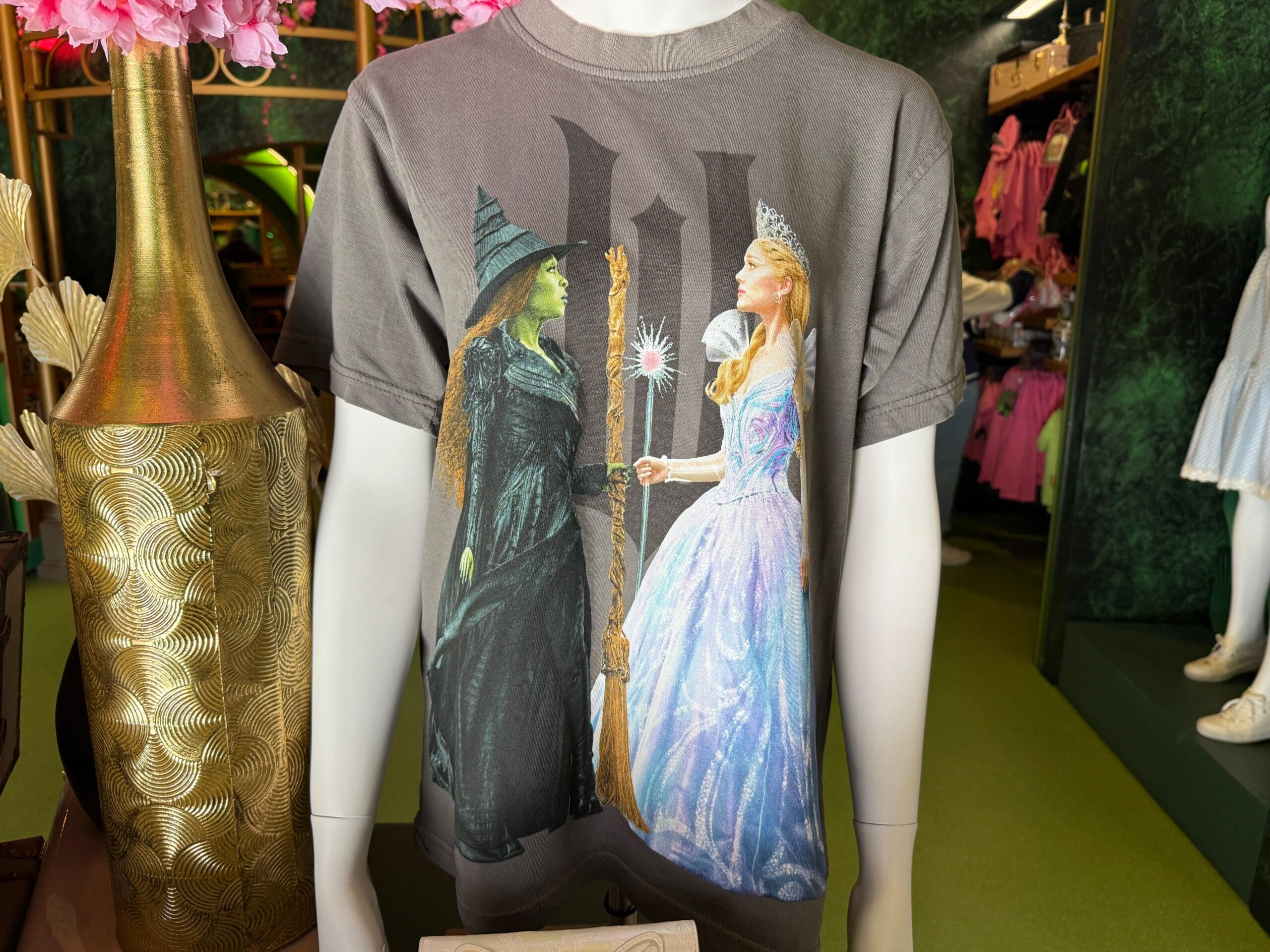 This t-shirt is gray with a dark “W” on the chest. In front of the letter is full-color artwork of Elphaba and Glinda in their Wicked: For Good outfits.