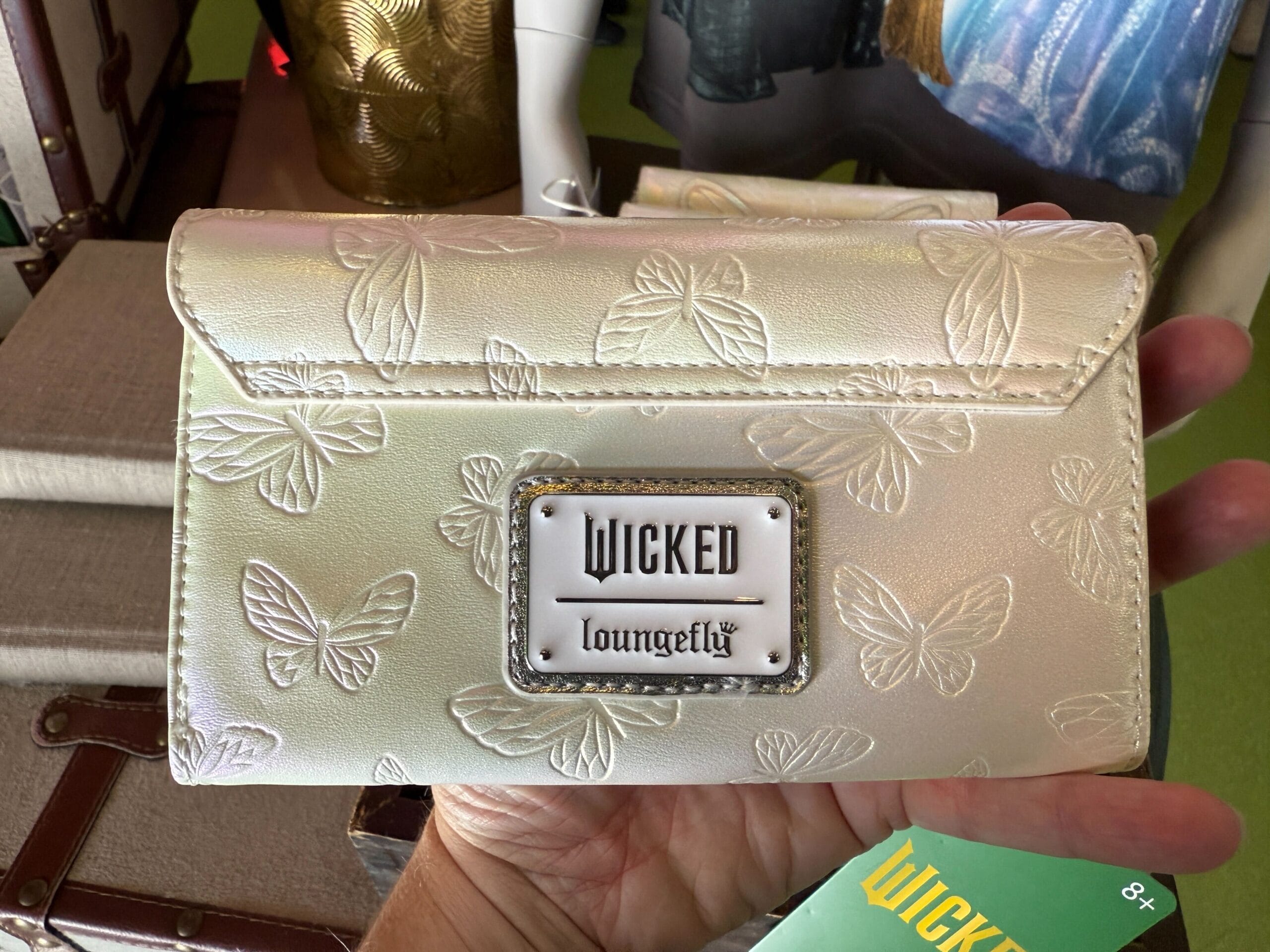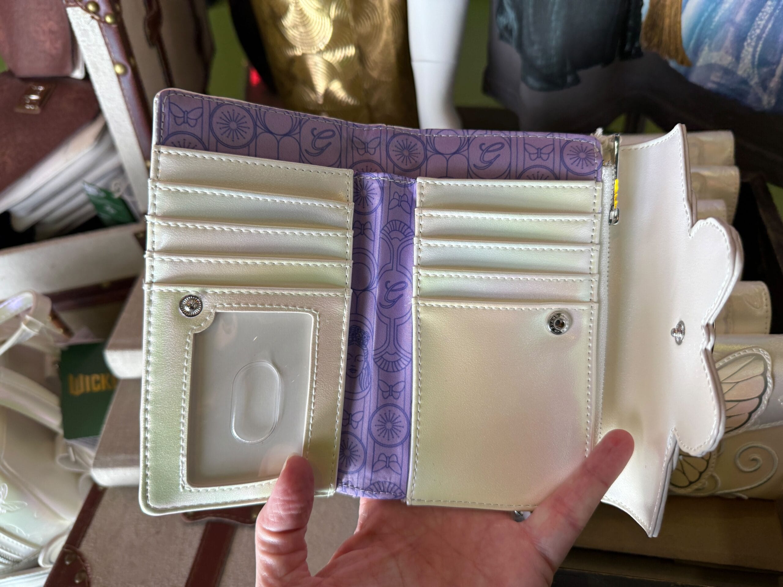 The matching wallet is the same shiny pink-white. A cameo charm of Glinda is atop a butterfly appliqué on the flap. Butterflies are stamped across the flap and back. There are several card slots, a zip pouch, and a clear ID pocket inside. The lining is the same as the backpack.