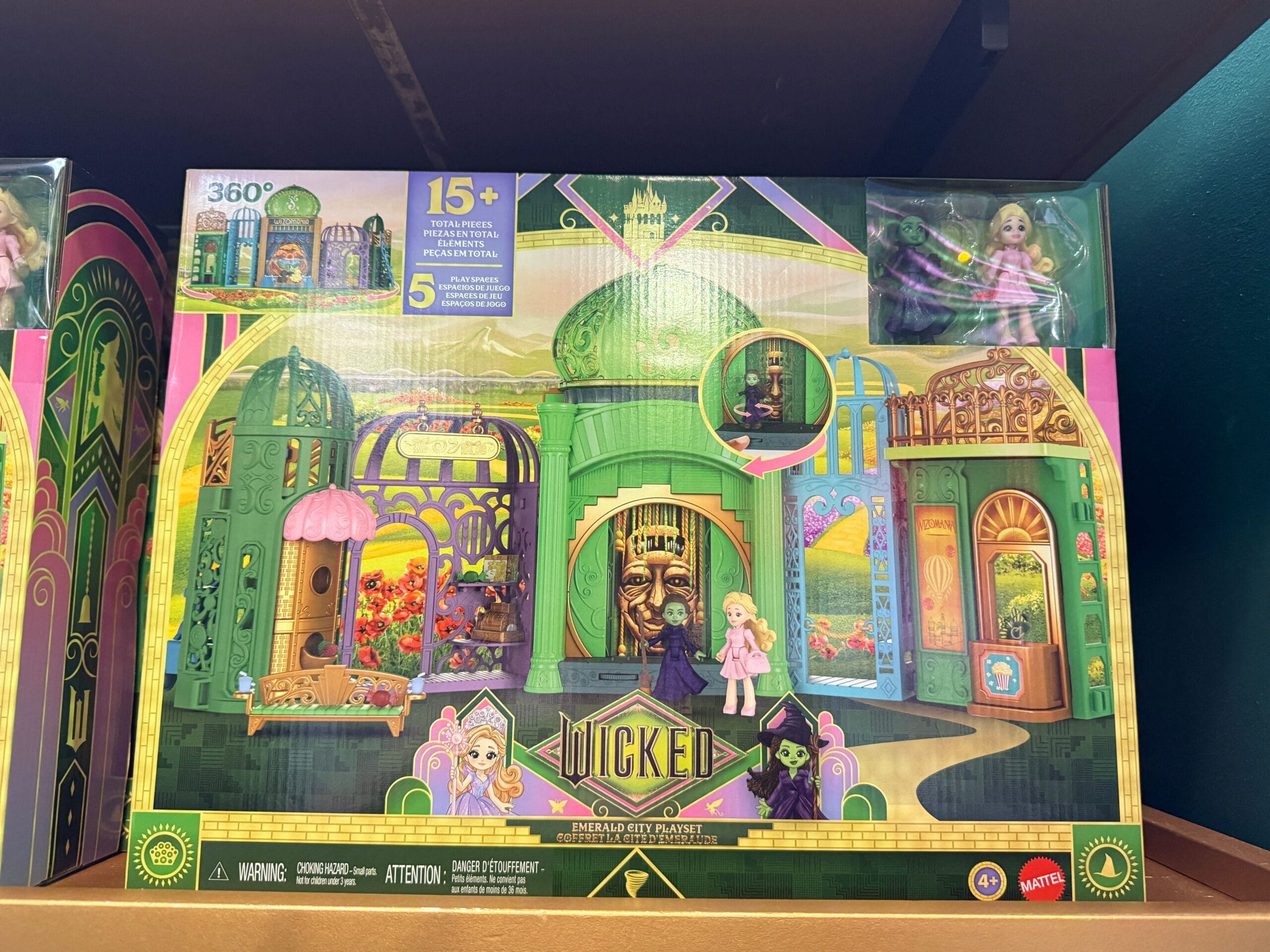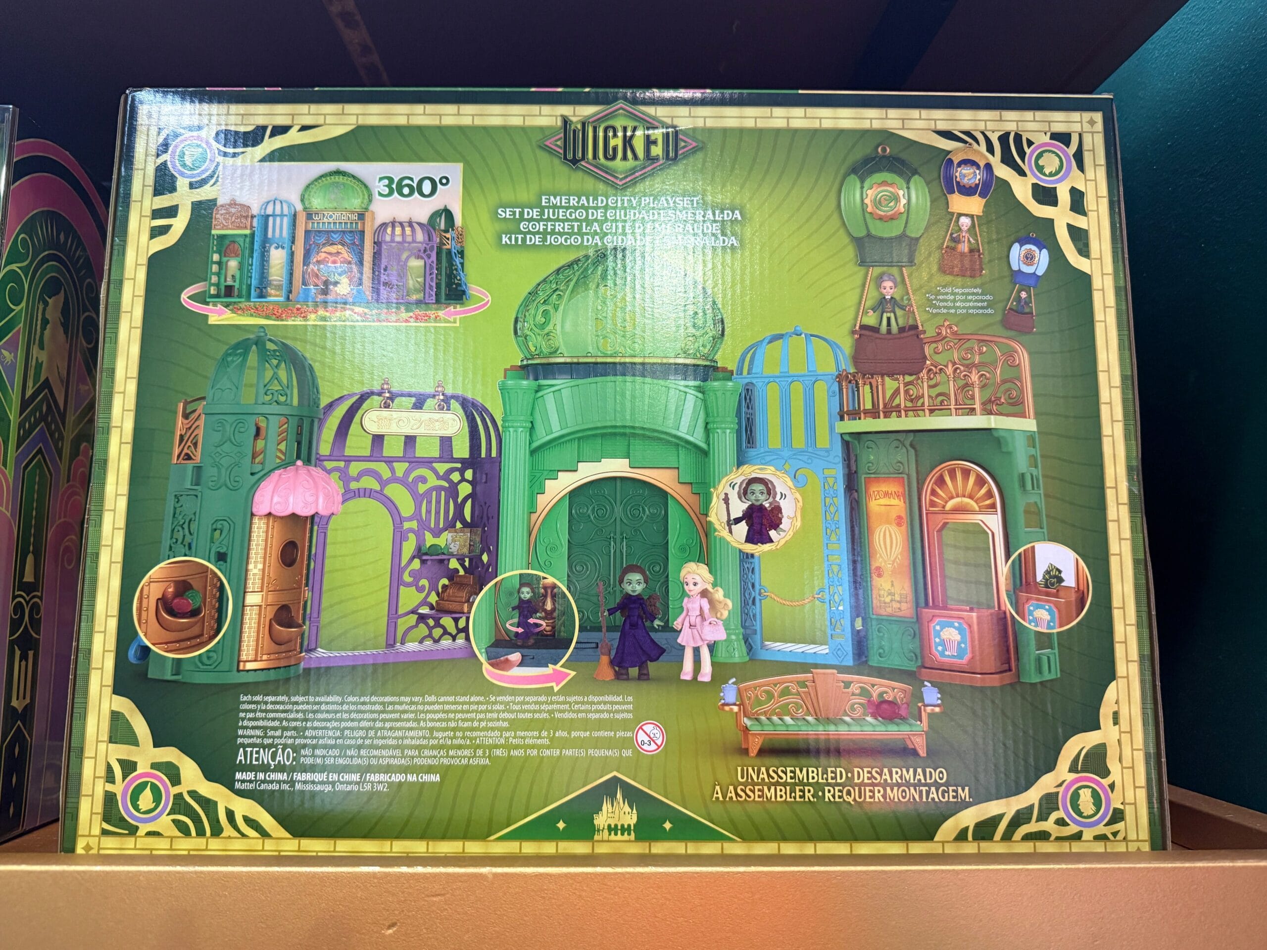 The Emerald City playset includes figures of Glinda and Elphaba. The set has over 15 pieces and five play spaces from the Emerald City.