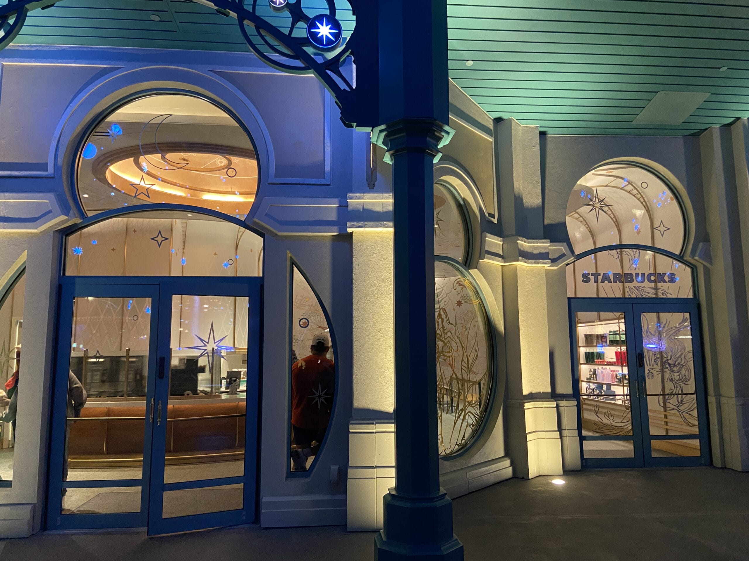 The entrance Starbucks has bright starry theming to match the rest of Celestial Park.