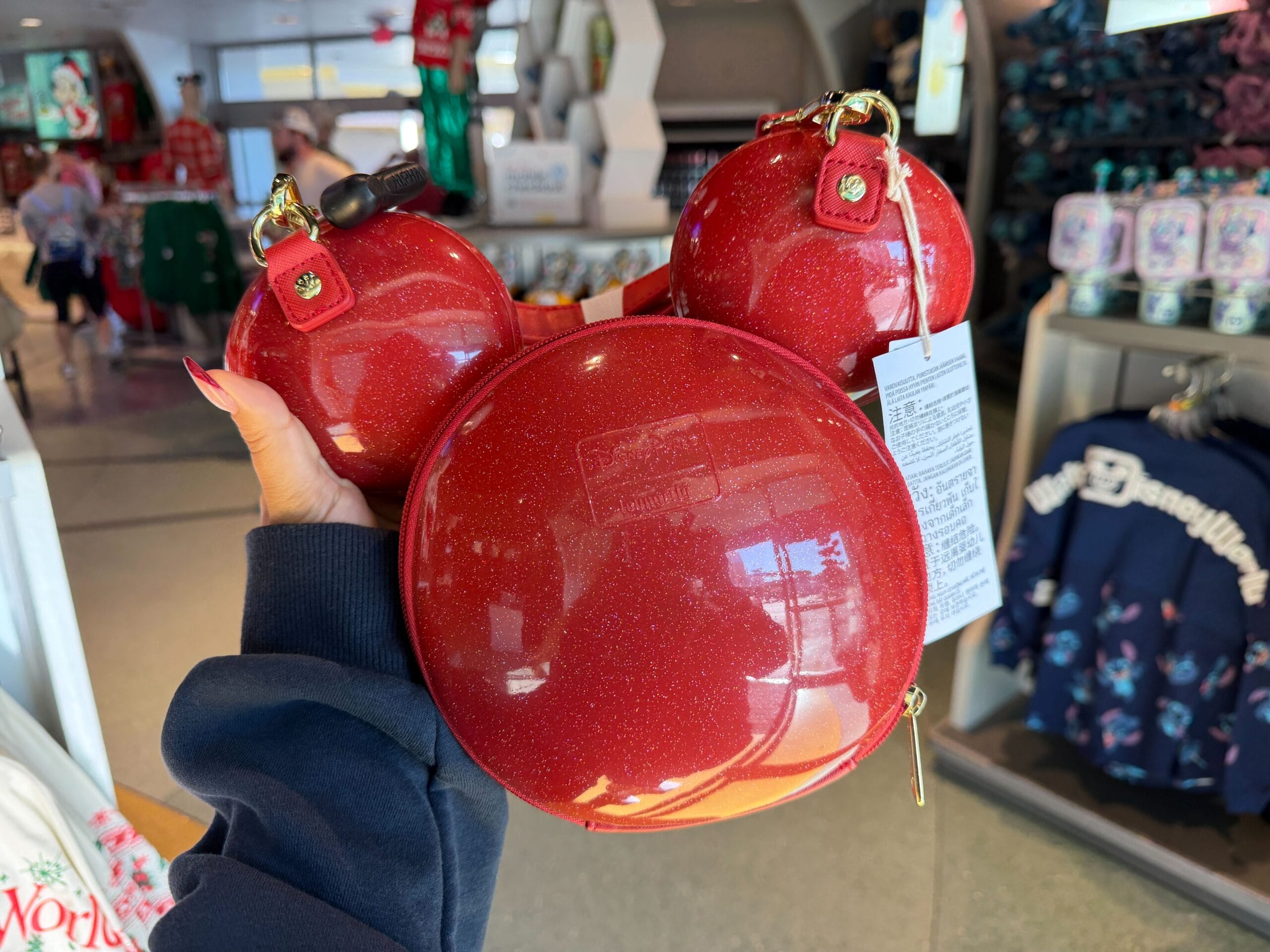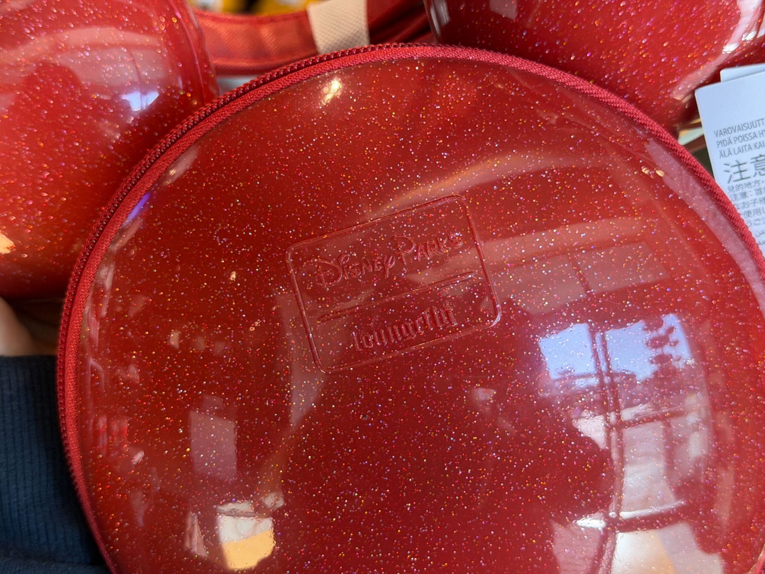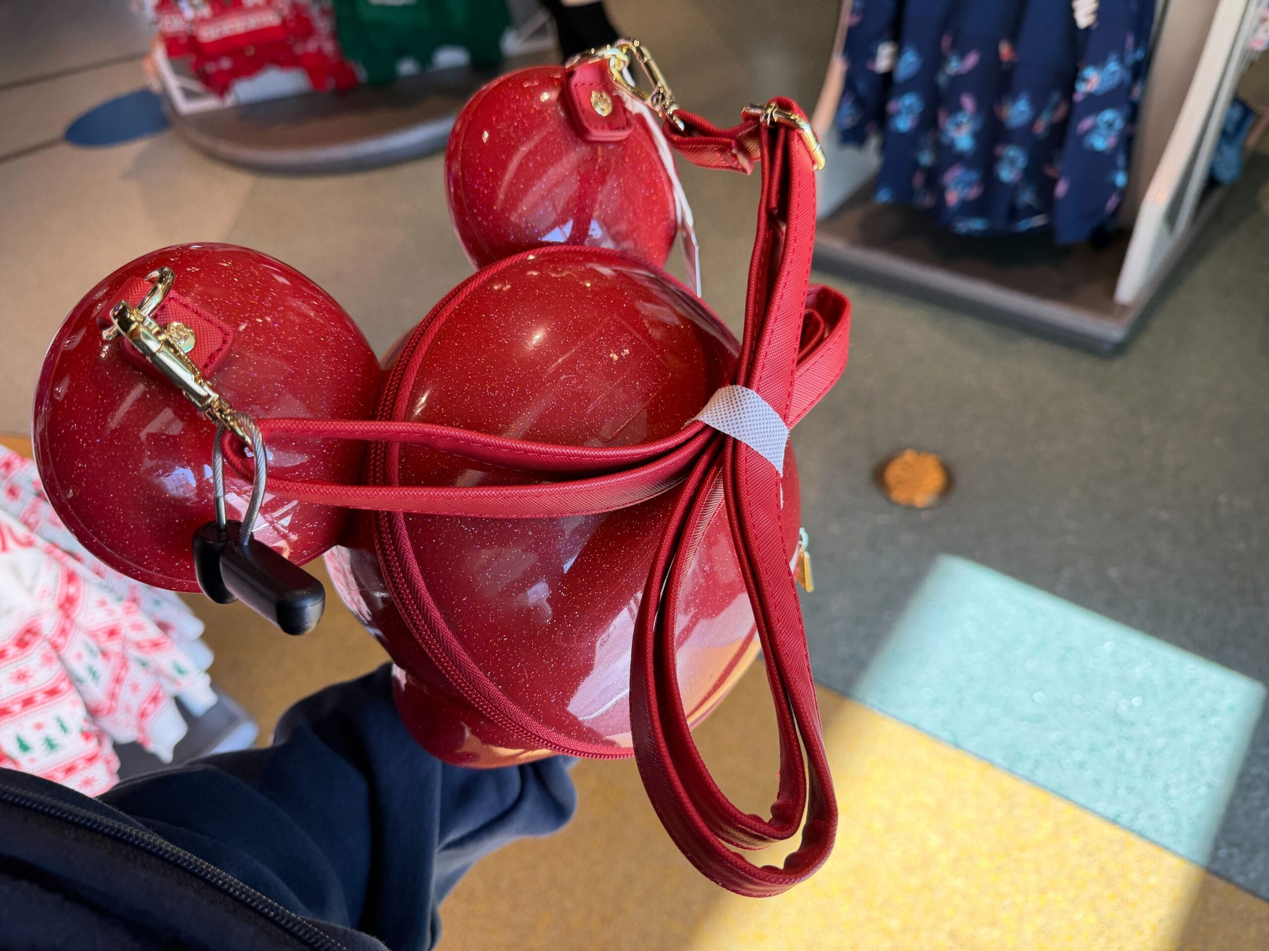 The Disney Parks x Loungefly crossbody bag is a literal Mickey Mouse head. It is made of hard plastic and features an allover red glittery color.