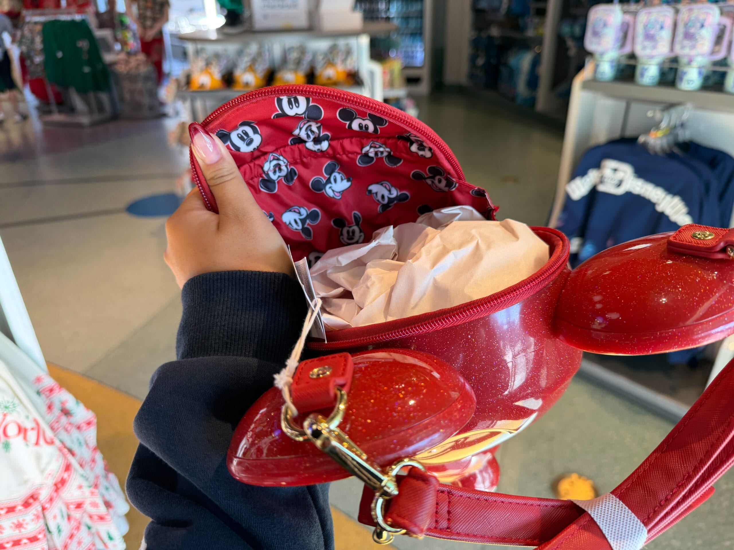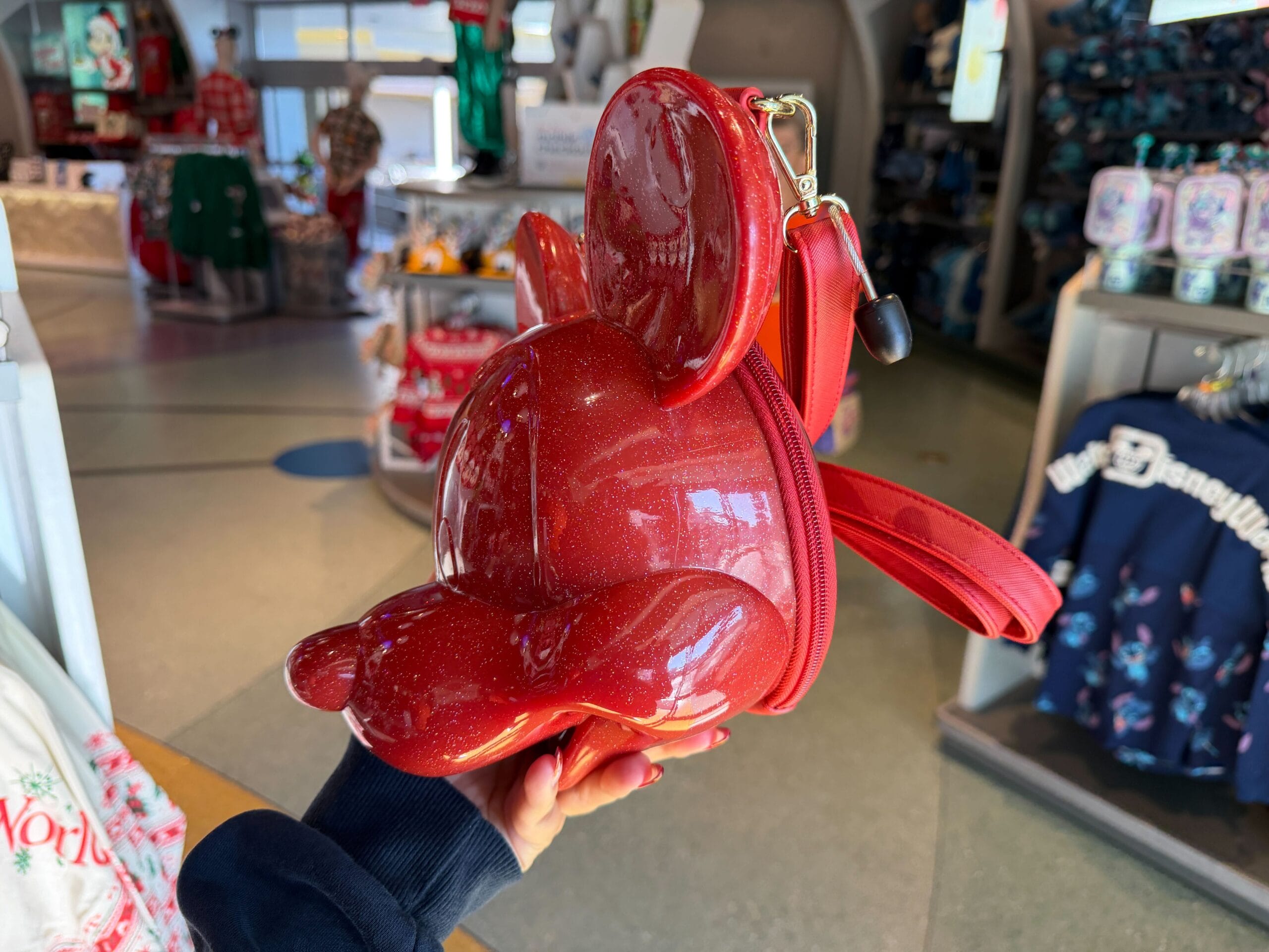 Mickey’s glittery red head is featured on the latest crossbody bag from the Disney Parks and Loungefly ongoing collaboration.