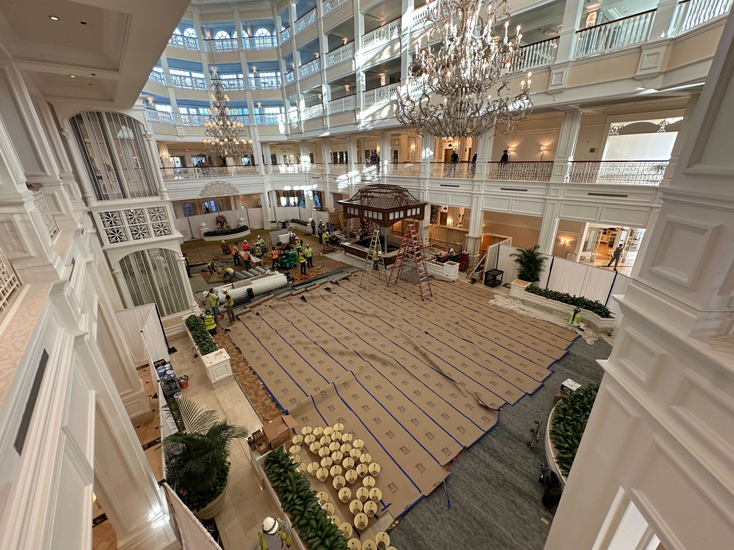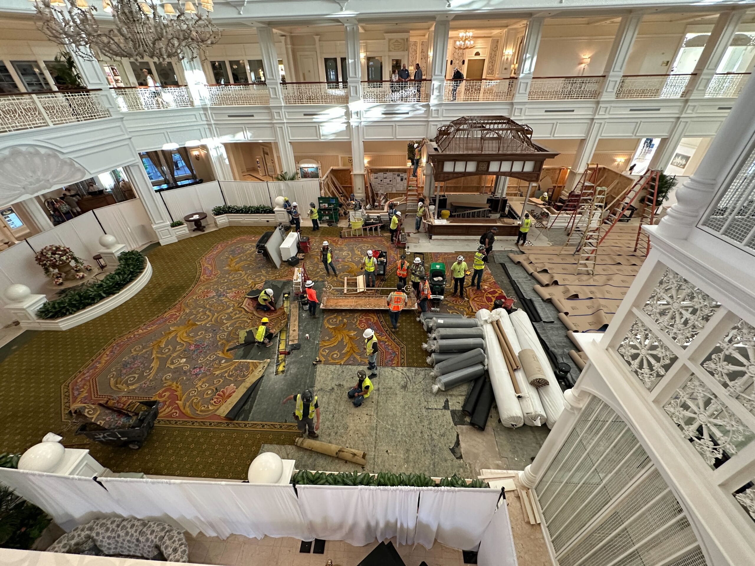 Crews are busy replacing the carpet and painting various areas of the lobby at Disney’s Grand Floridian Resort & Spa as the complete overhaul continues.
