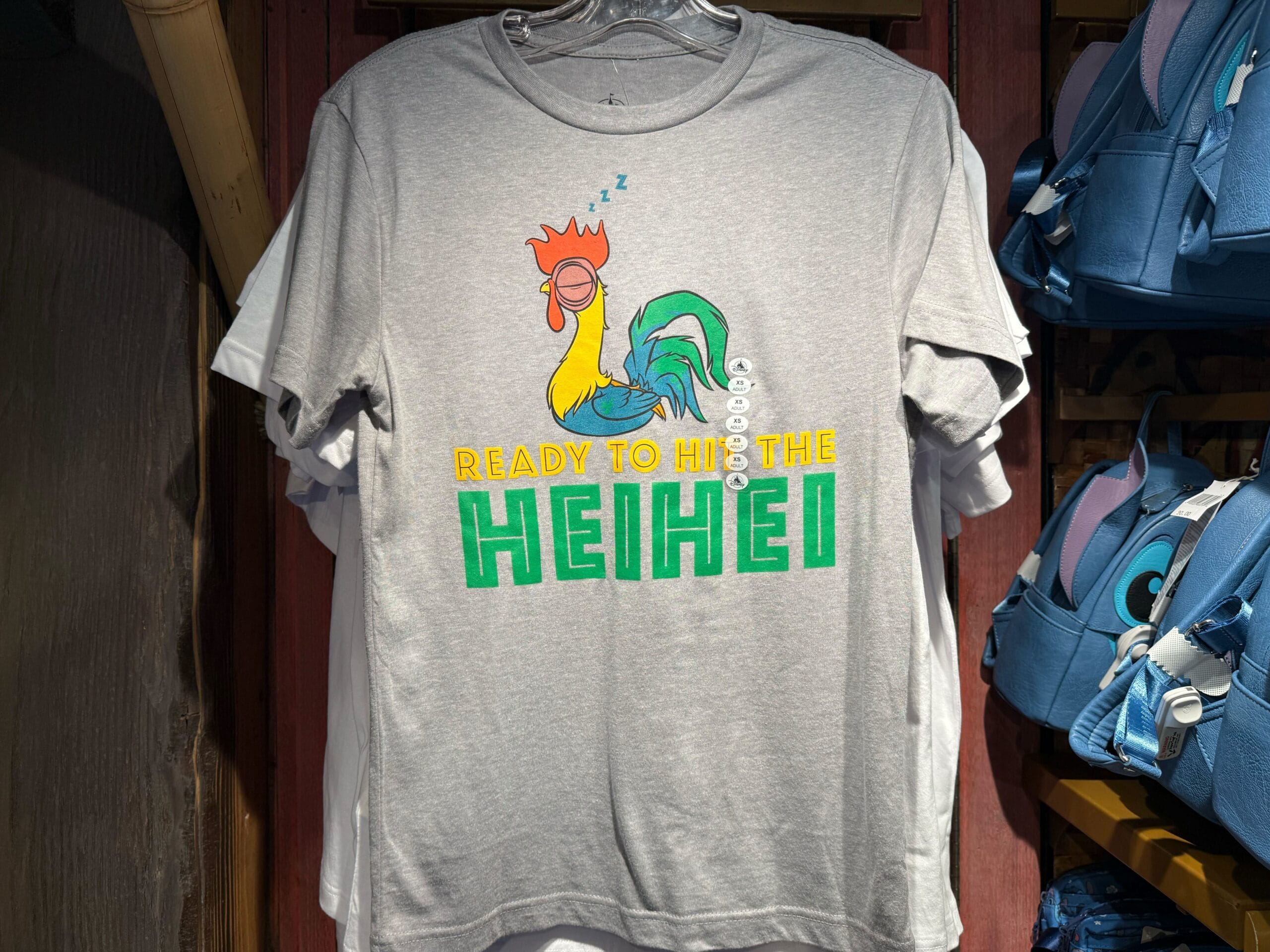Heihei from Moana is pictured sleeping on this heather gray tee. It reads, “Ready to hit the Heihei.” We found this tee at Adventureland Bazaar in Magic Kingdom.