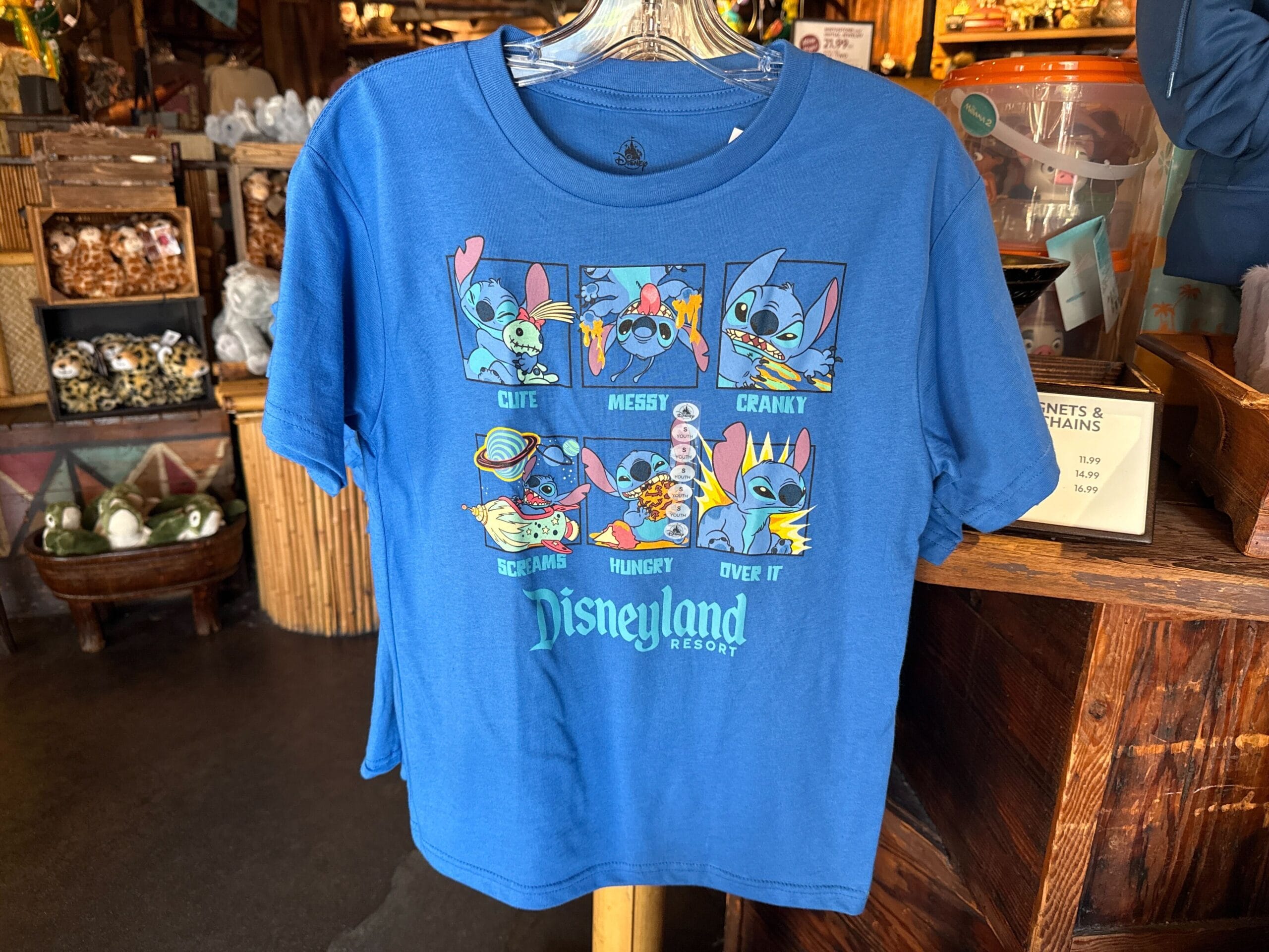 This blue shirt features six pictures of Stitch in six different moods: cute, messy, cranky, screams, hungry, and over it. The Disneyland Resort wordmark is in light blue at the bottom. This was also in Adventureland Bazaar.