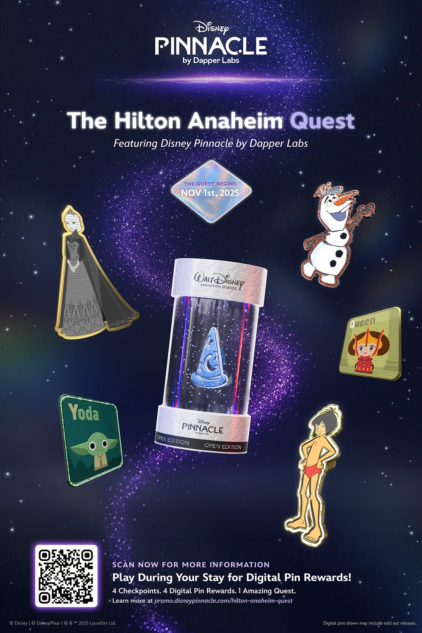 After completing all the touchpoints, guests will receive four Disney Pinnacle by Dapper Labs Mystery Capsules, each holding a digital pin. The collectibles are exclusive to Hilton Anaheim and only accessible during the promo window. No purchase is necessary.