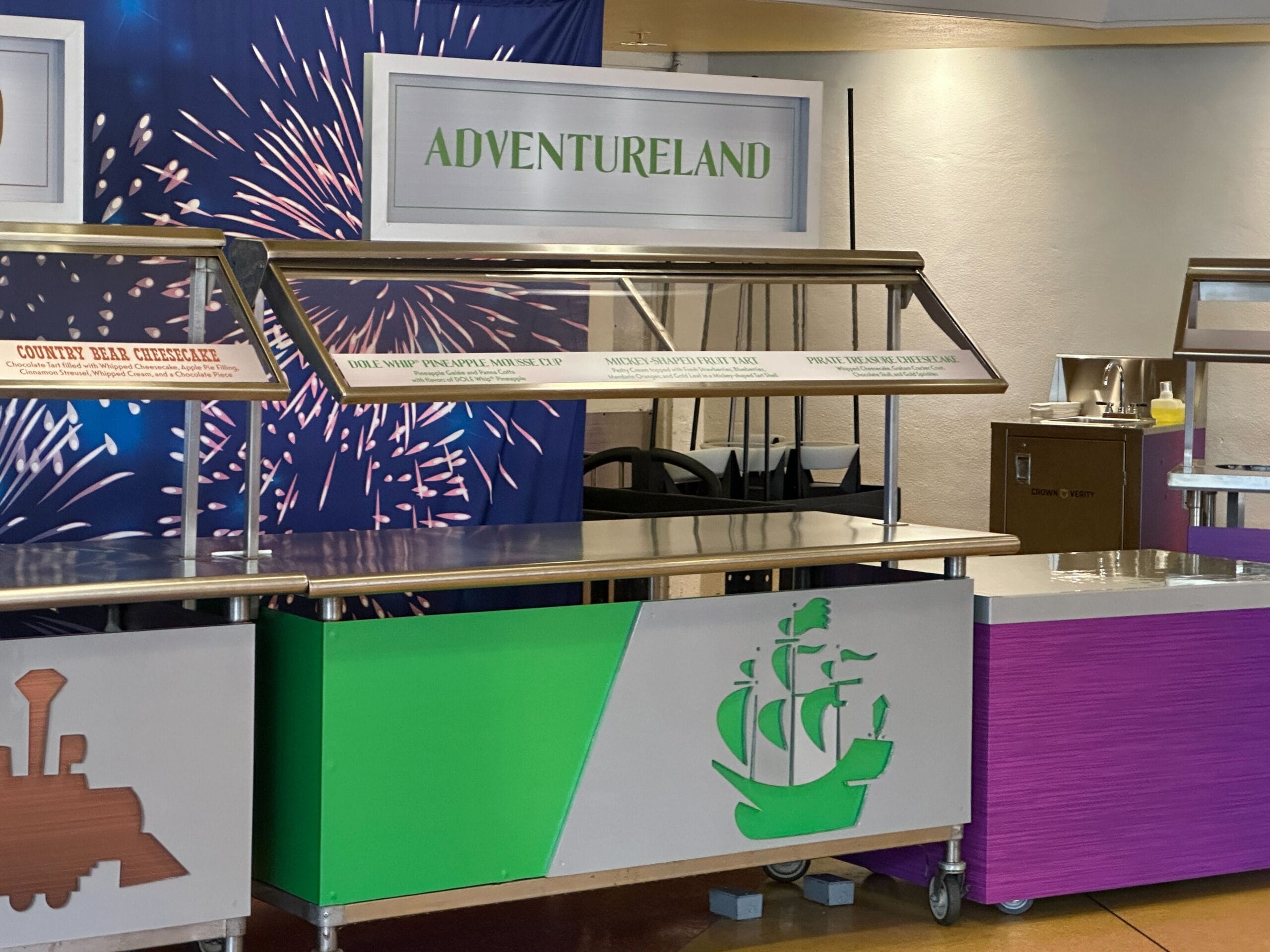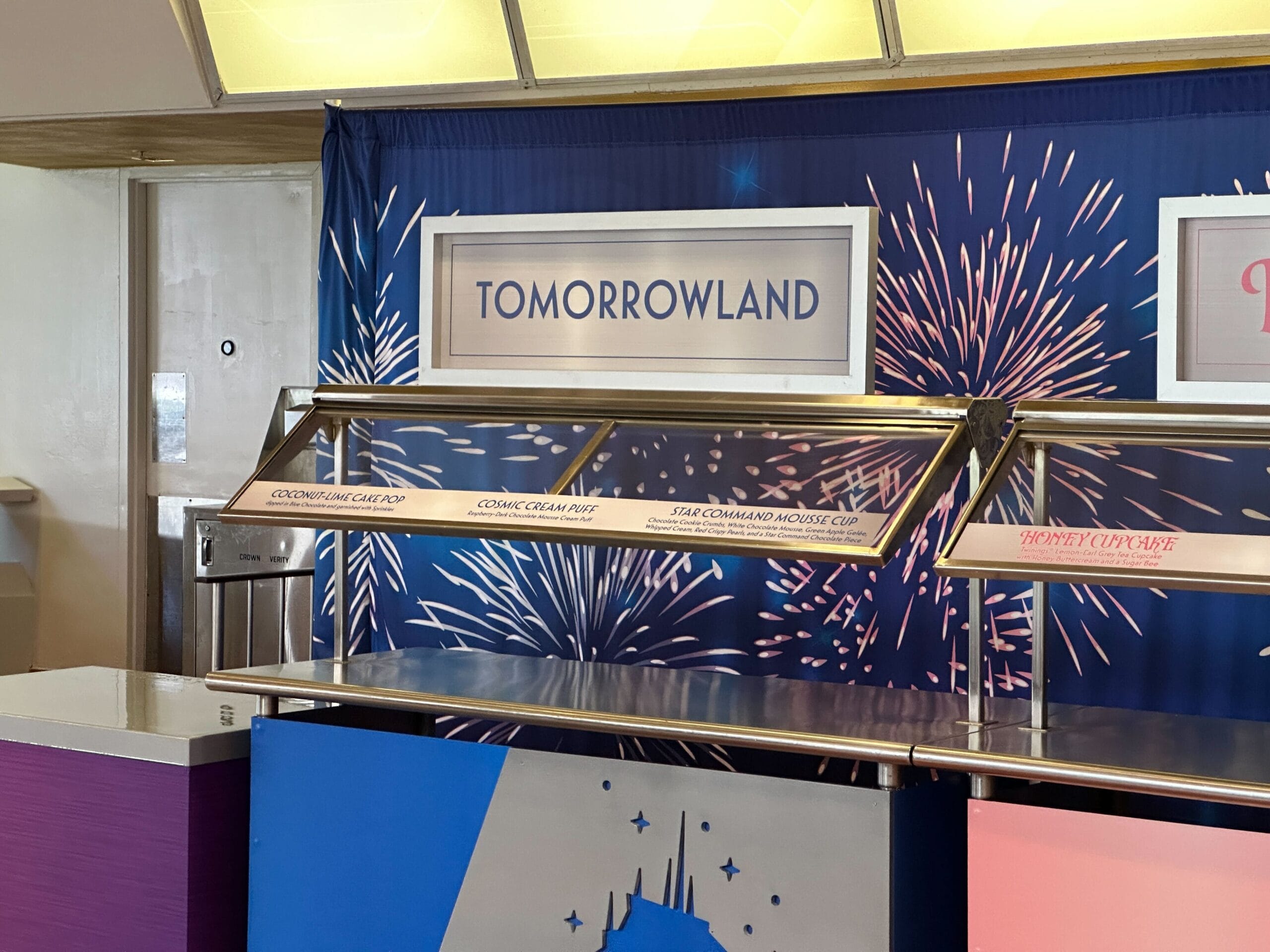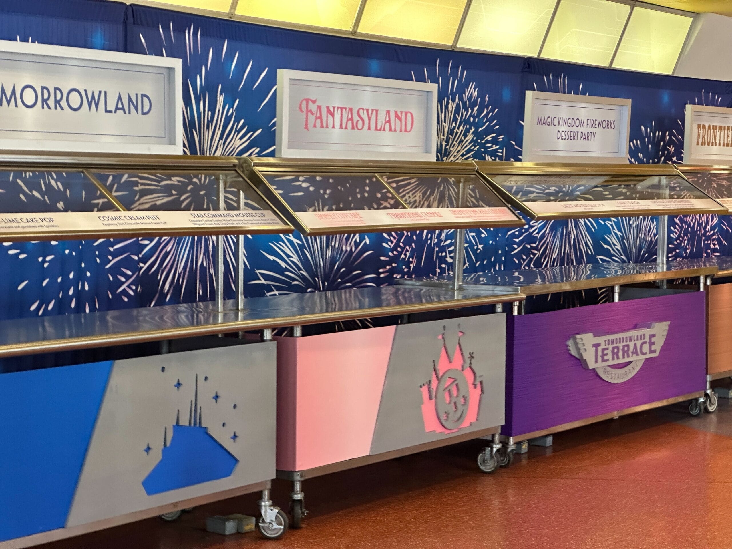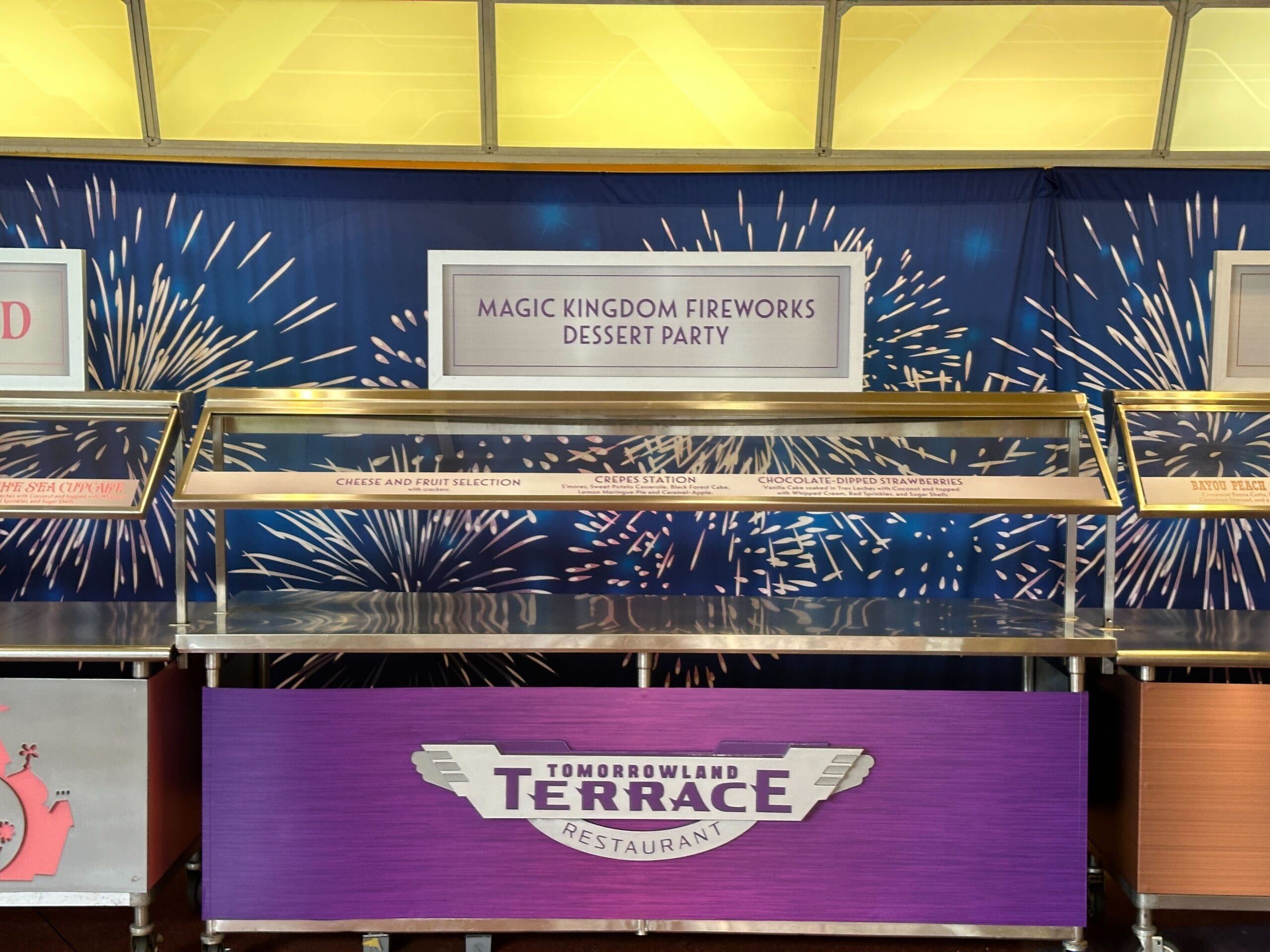 The main Fireworks Dessert Party station is purple with the Tomorrowland Terrace Restaurant logo. This station has the following desserts: