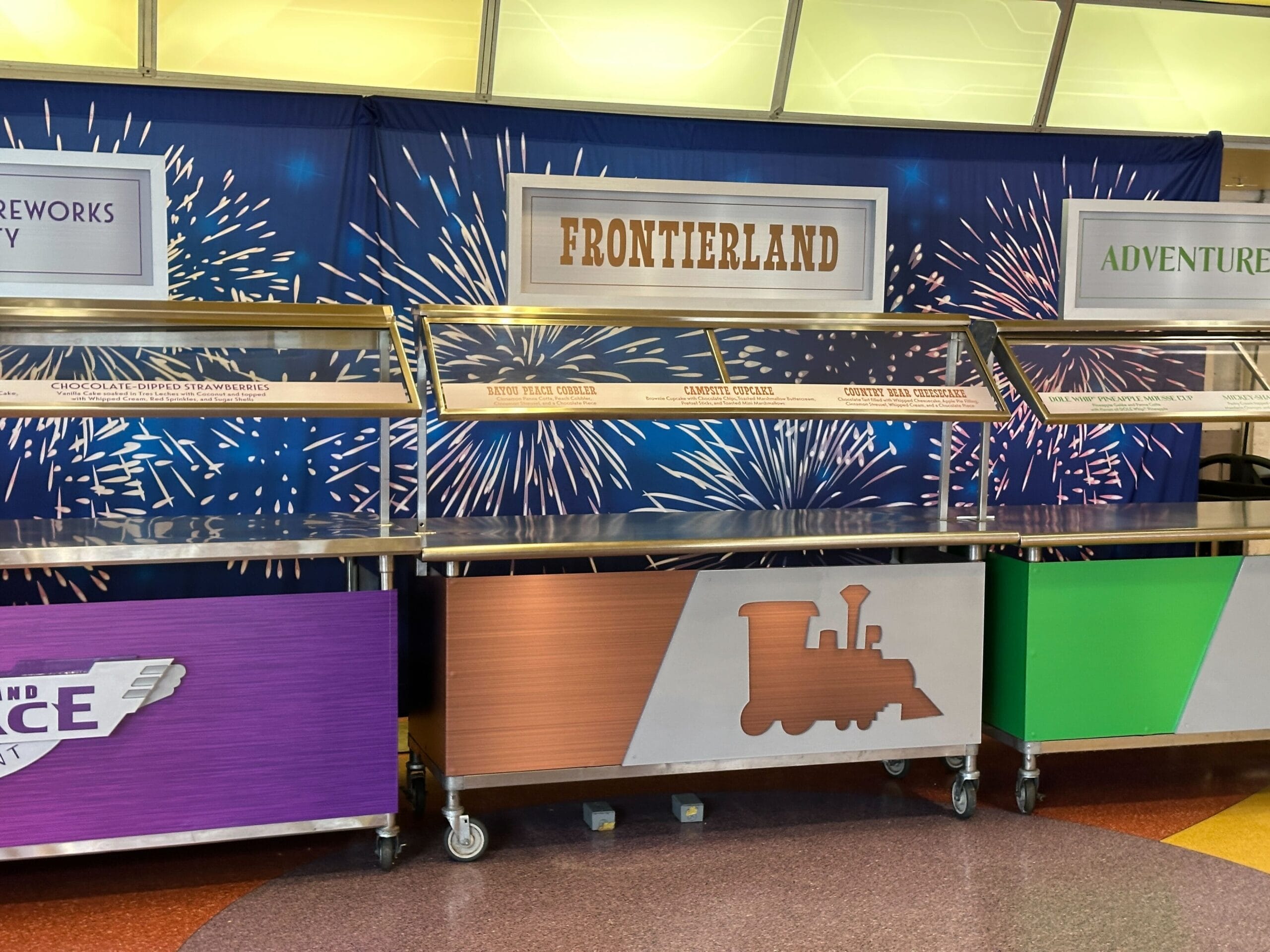 The Frontierland station is brown with a cut-out of the Big Thunder Mountain attraction train. This station has the following desserts: