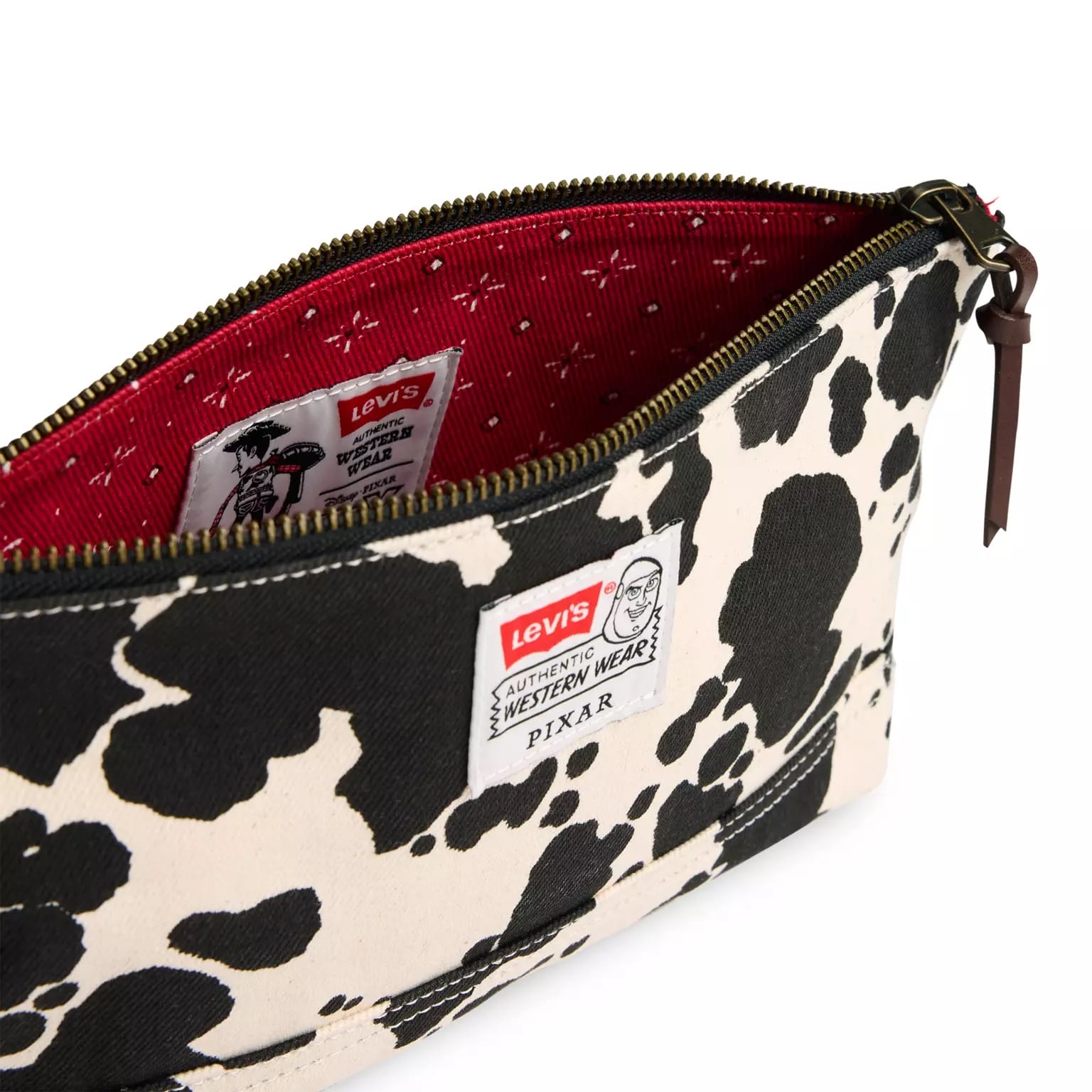 Carry your essentials in this cotton canvas pouch. It has an all over cow print on the outside, and the interior lining looks like Woody’s red bandana.