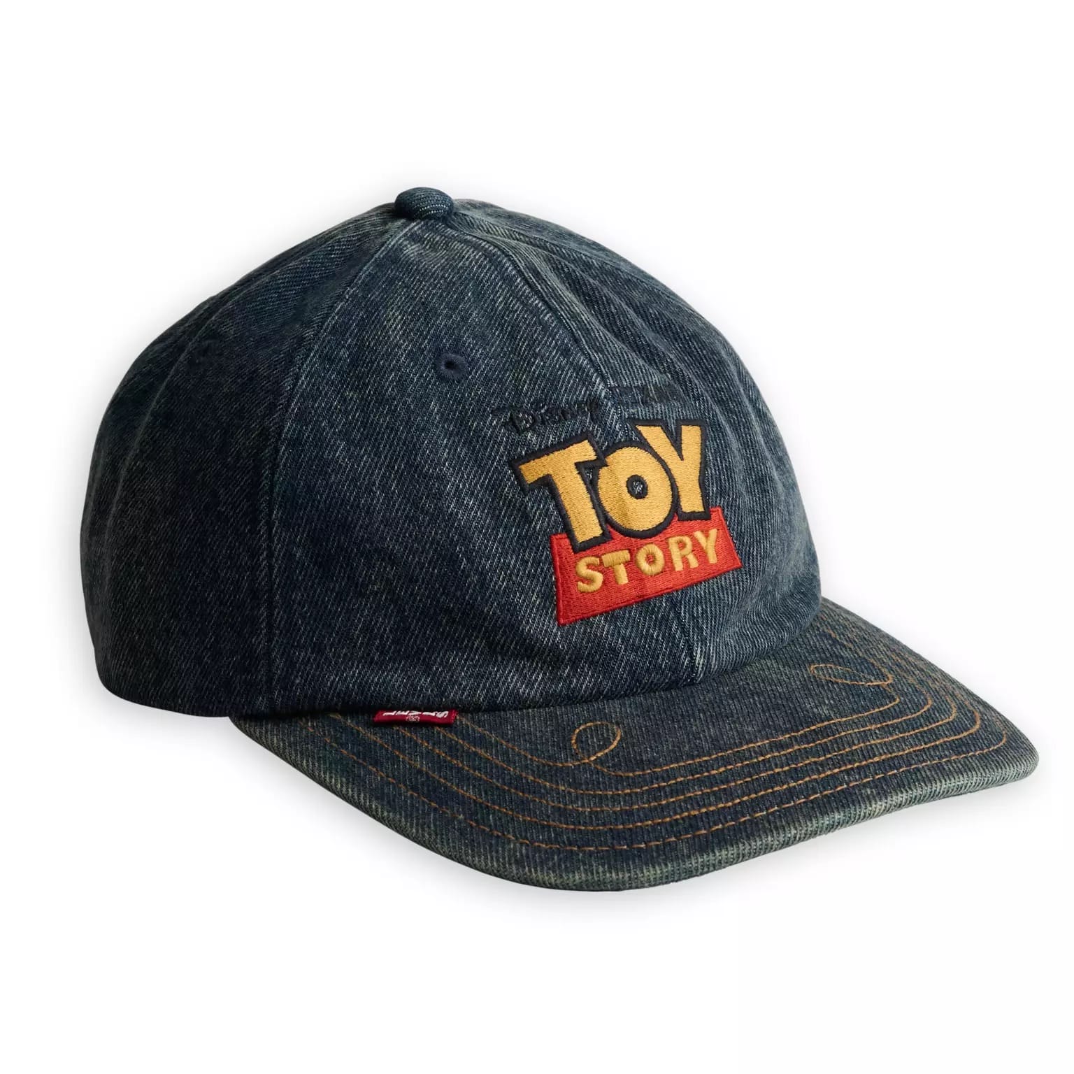 The denim baseball cap is dark blue with the ”Disney Pixar Toy Story” logo on the front and western-style stitching. There is an adjustable strap with a metal bucket.