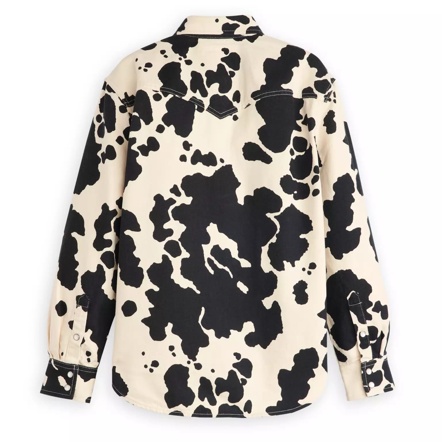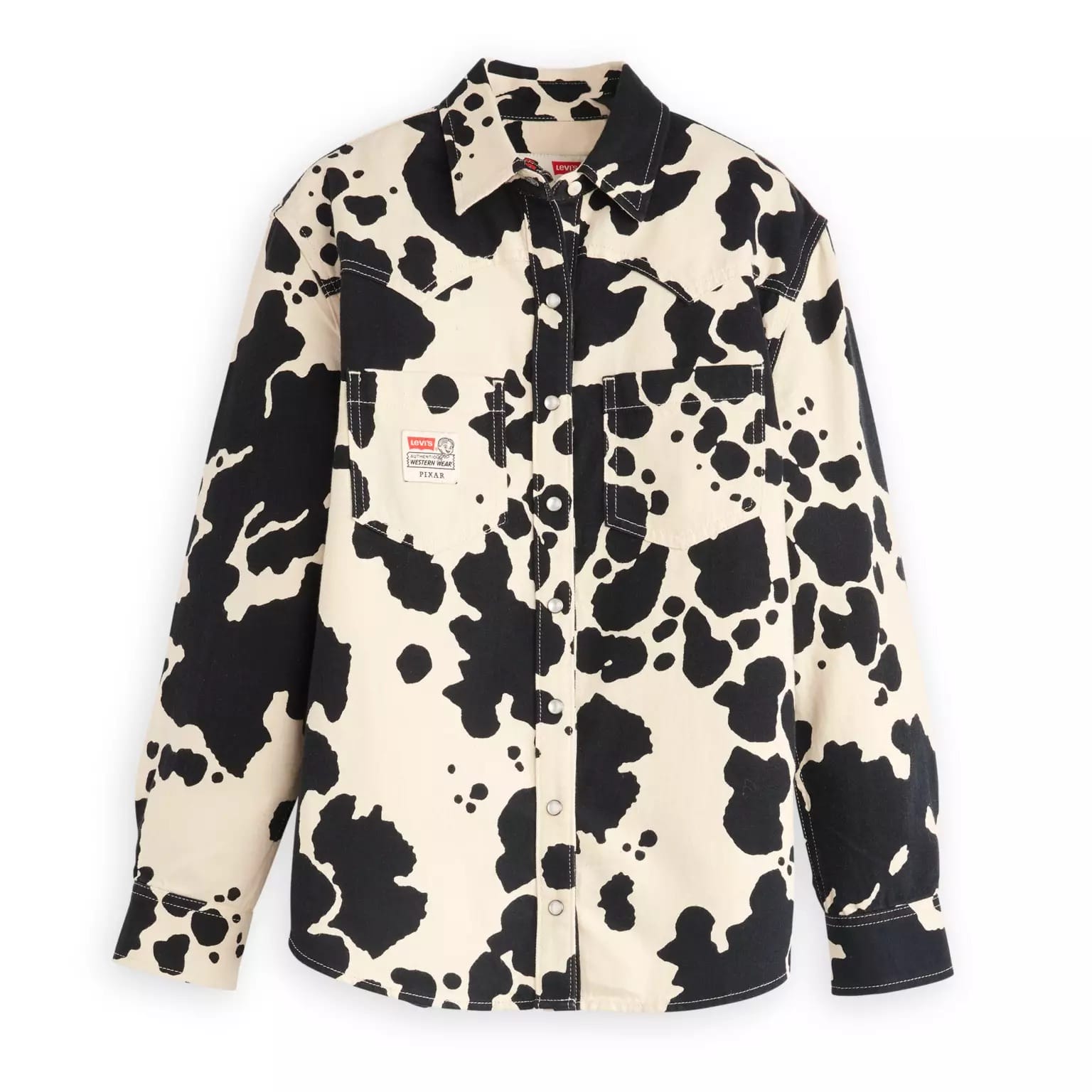 The button-up shirt features an allover cow print reminiscent of Jessie’s chaps. It has a collar, two chest pockets, and cuffs with snap closures.