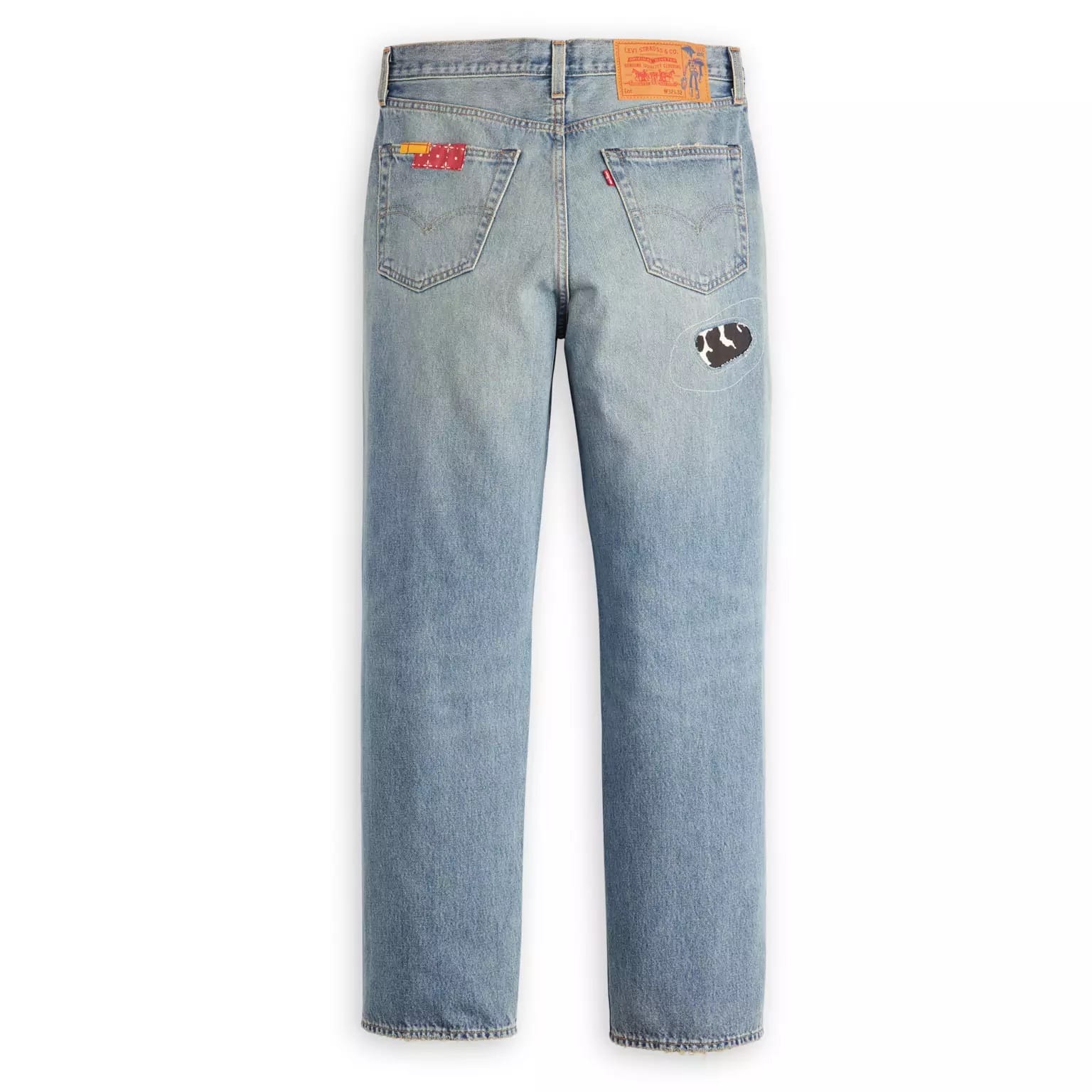 The loose jeans for men feature patch and repair details that use Woody’s iconic fabric patterns on the back pocket and both sides of the legs.
