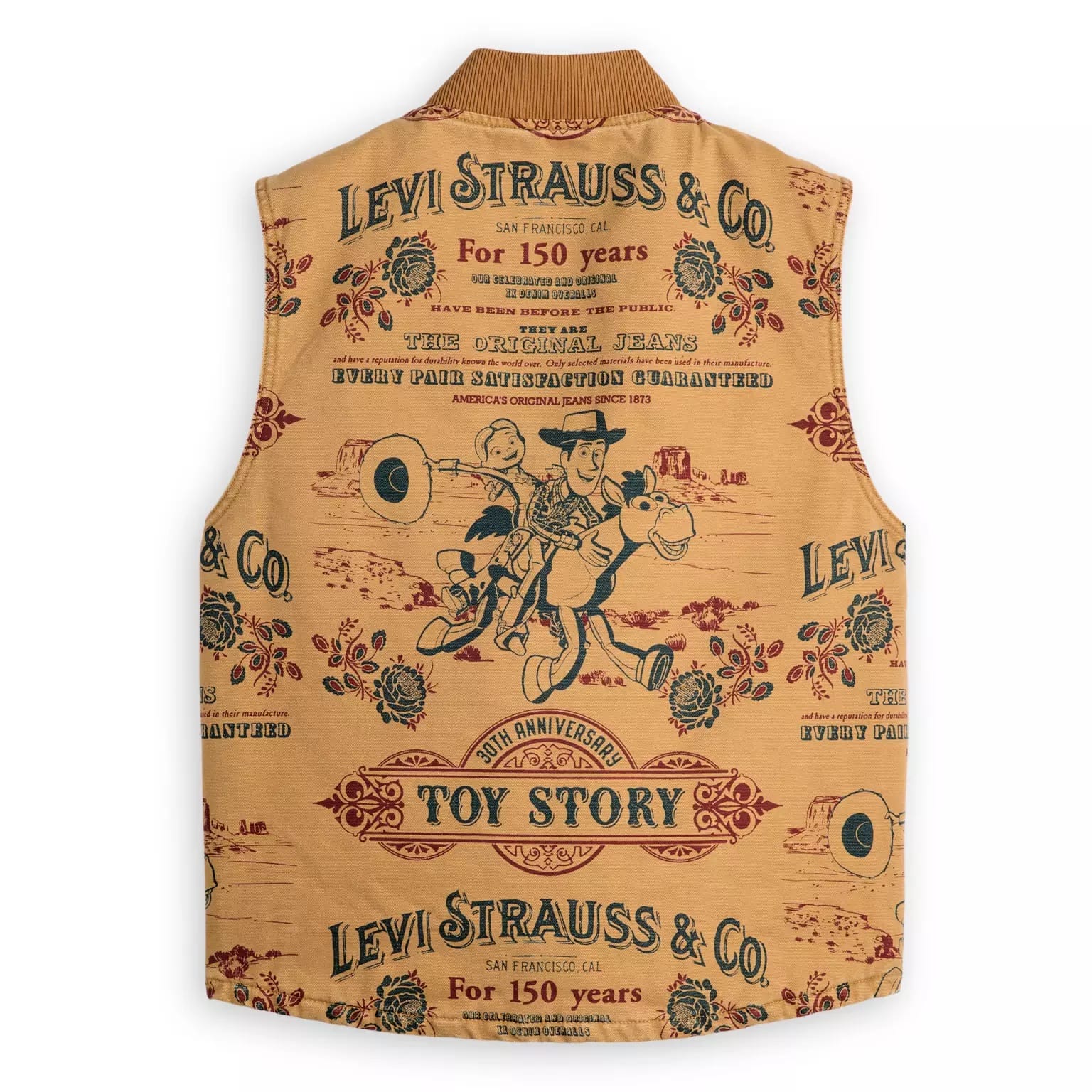 This zip-front vest features a quilted lining and an all over print. The print includes 30th anniversary artwork of Jessie and Woody riding Bullseye, ”Levi Strauss & Co.” logo, and ”30th Anniversary Toy Story” and other images.