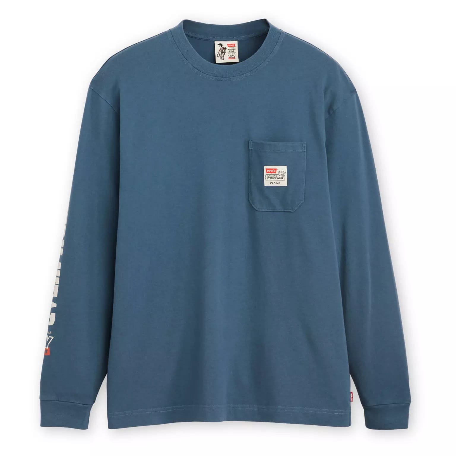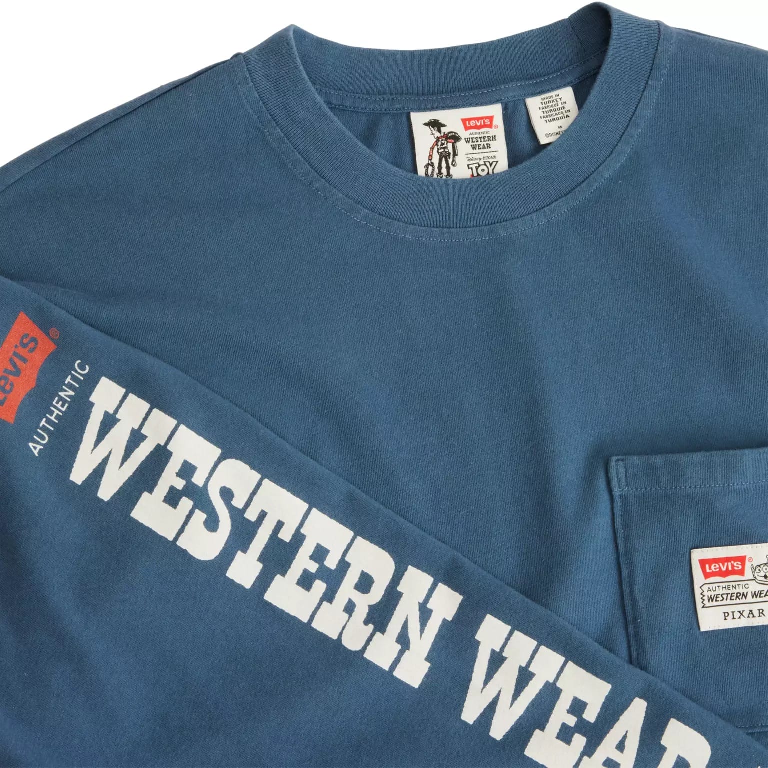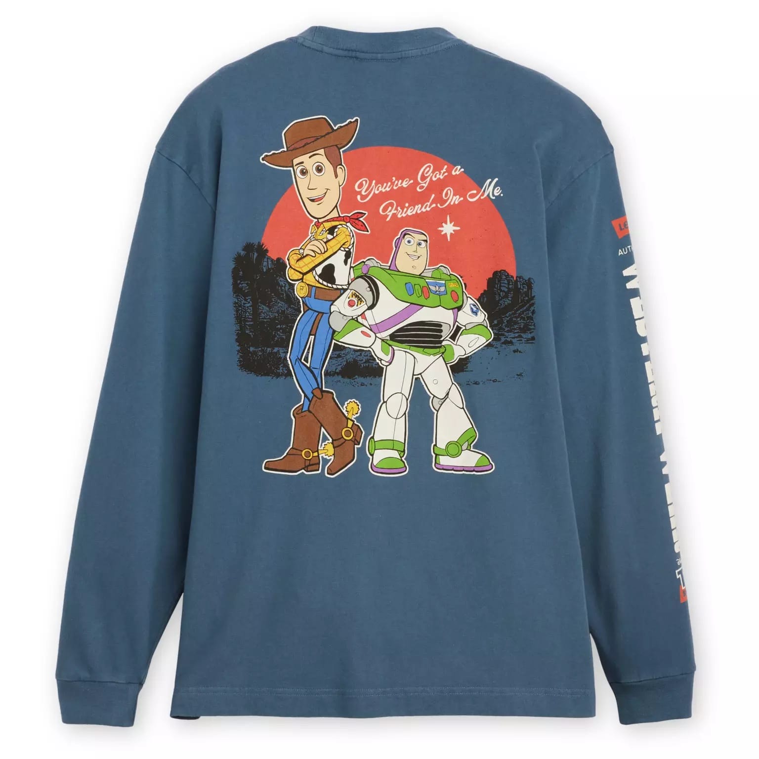 A long-sleeve t-shirt is part of the collection. The front has the patch on the pocket, and the back has an image of Buzz Lightyear and Woody. It reads “You’ve got a friend in me” above them. One of the sleeves has the Levi’s authentic western wear wordmark.