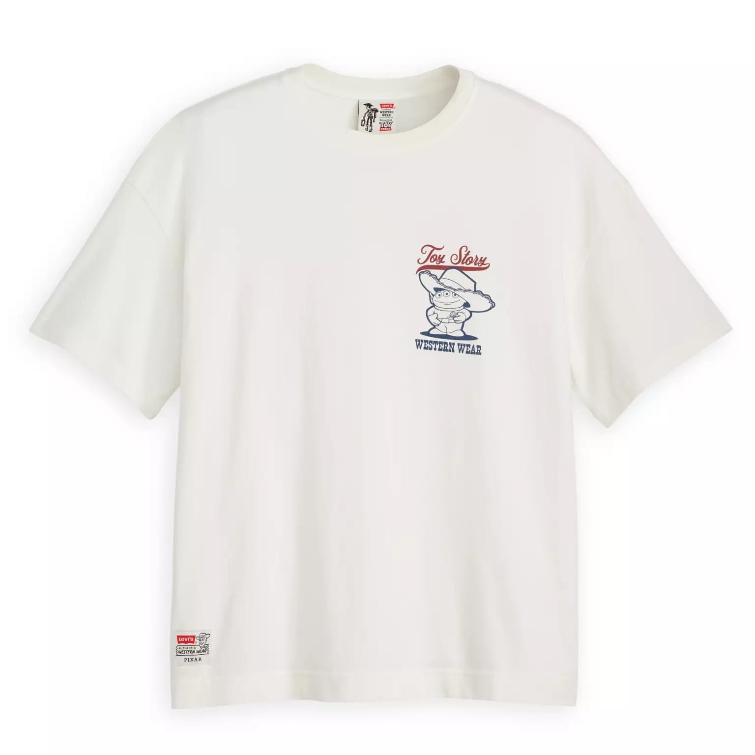 The white t-shirt features an Alien wearing Woody’s cowboy on the front, between the words Toy Story Western Wear.” On the back, three Aliens join Jessie, Buzz, Woody, and Bullseye against a red desert landscape below the Toy Story logo.