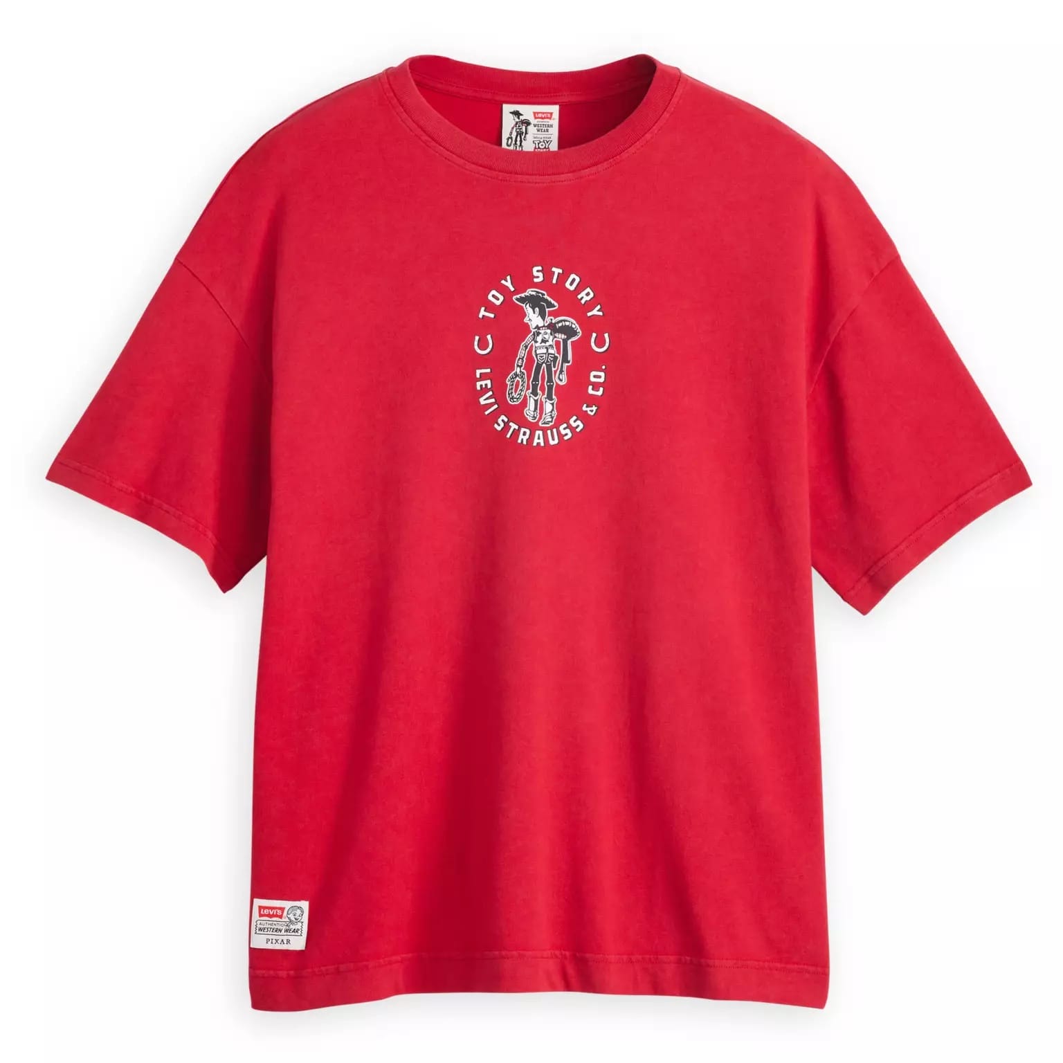 The red t-shirt features an image of Woody in a classic Saddleman pose. The words “Toy Story” and “Levi Strauss & Co.” along with two horseshoes create a circular border around Woody.