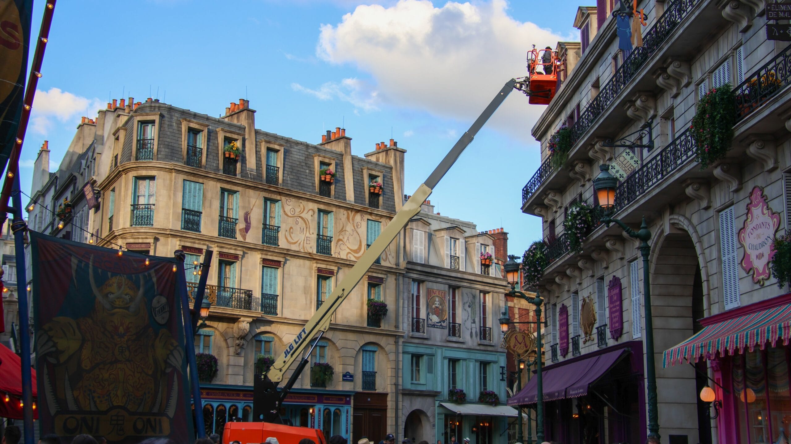 In a photo posted by @bioreconstruct on X, a large JLG Lift was parked in the middle of Wizarding Paris with Team Members in the basket. Although hard to tell in this image, near the bottom, you can see the heads of guests in the area.