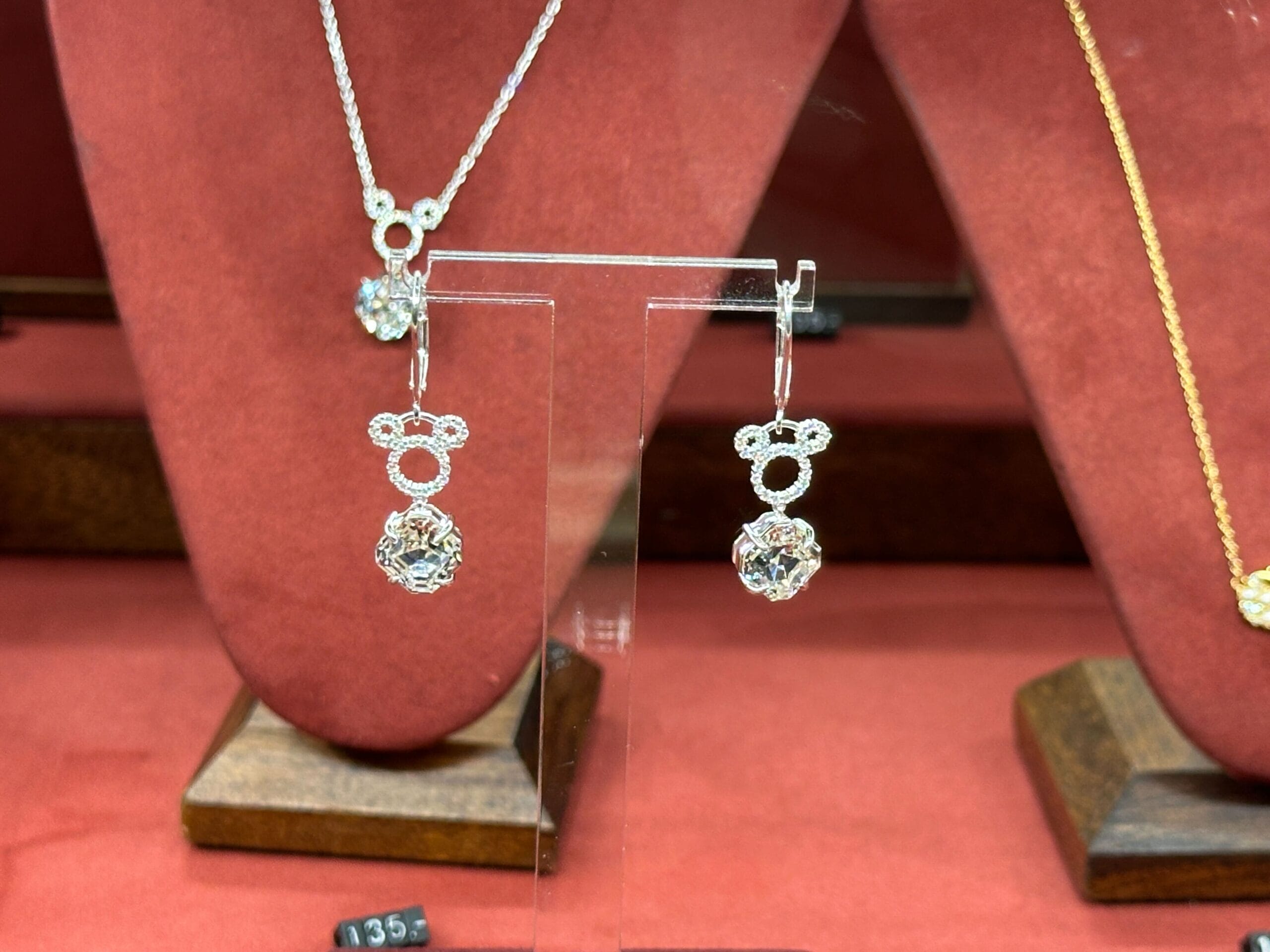 Coordinate the Mickey icon earrings with a Mickey icon necklace, which has the same style and design. The silver chain meets at the Mickey icon in the center, and a large gemstone dangles underneath.