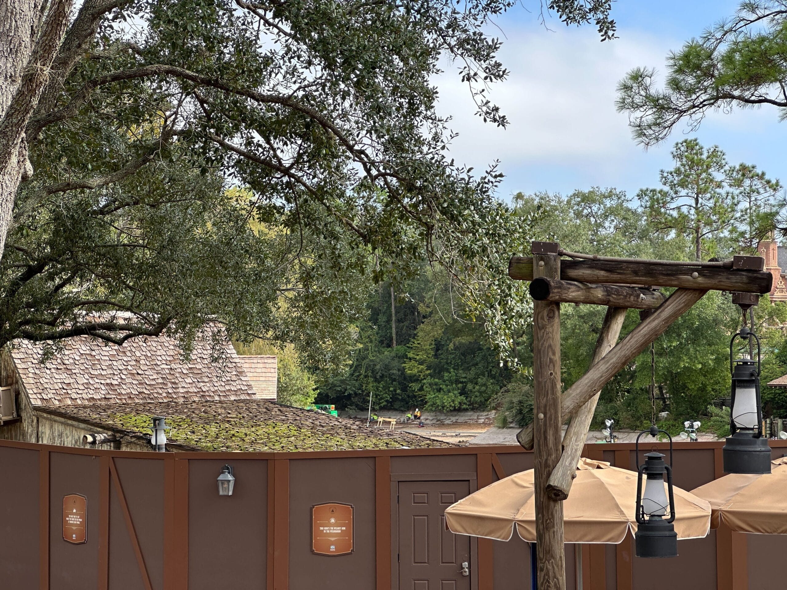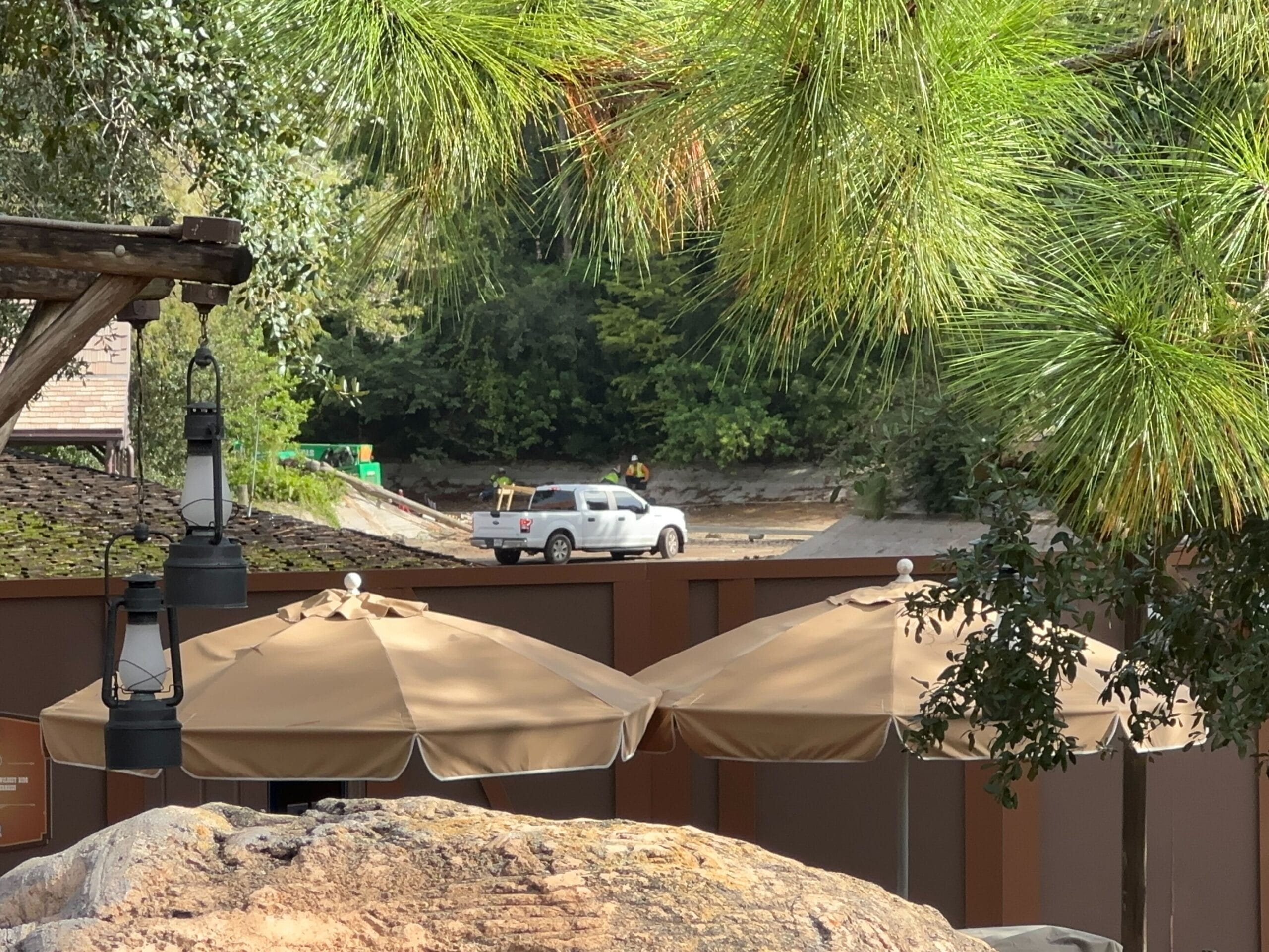 The area itself is hard to see now that the Rivers of America is completely surrounded with temporary scrim and construction walls. However, we are able to see the progress being made from various vantage points in Frontierland.