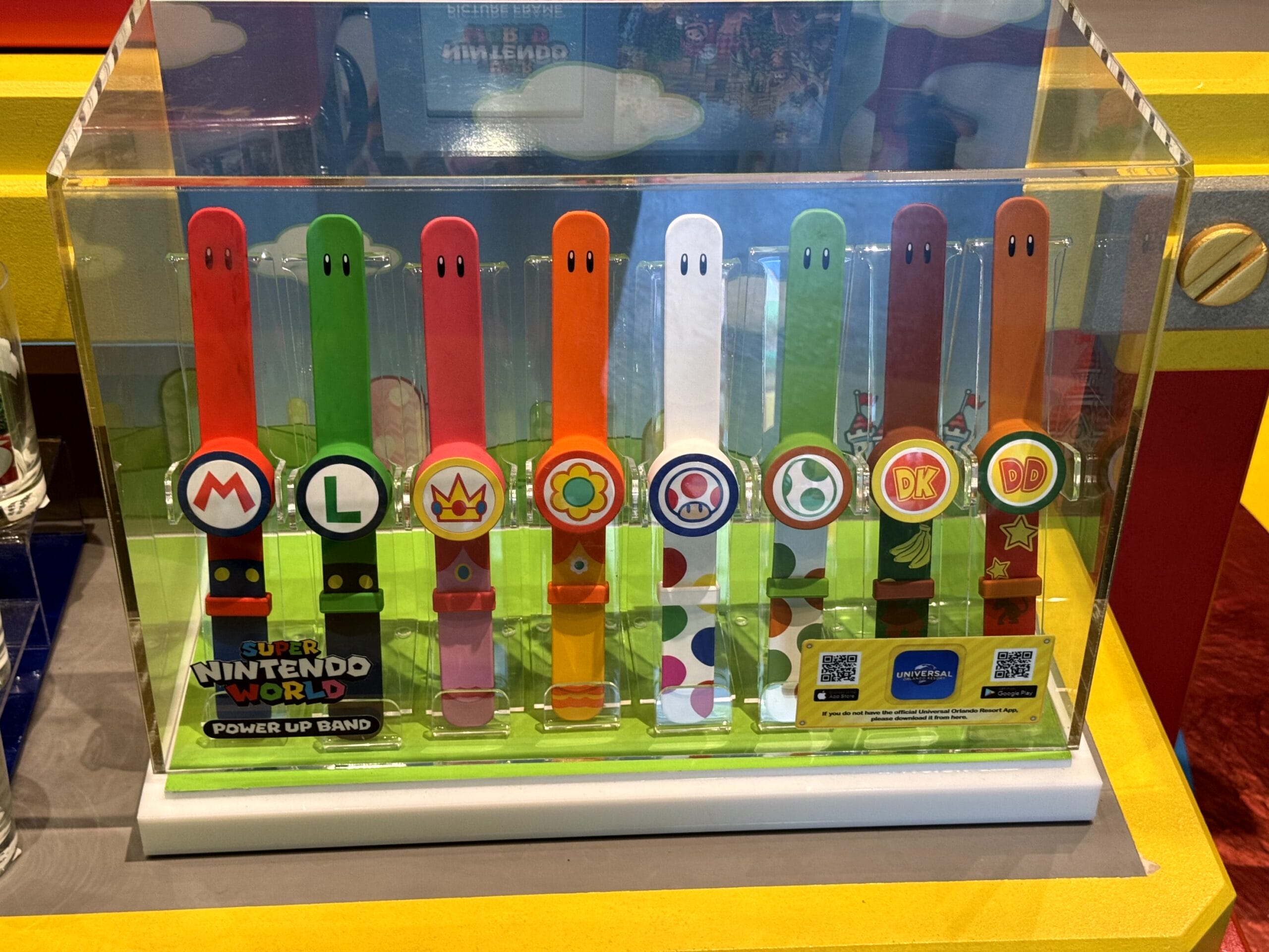 Power-Up Bands can be used to complete interactive activities throughout Super Nintendo World. There are eight different styles inspired by characters: Mario, Luigi, Princess Peach, Princess Daisy, Toad, Yoshi, Donkey Kong, and Diddy Kong.