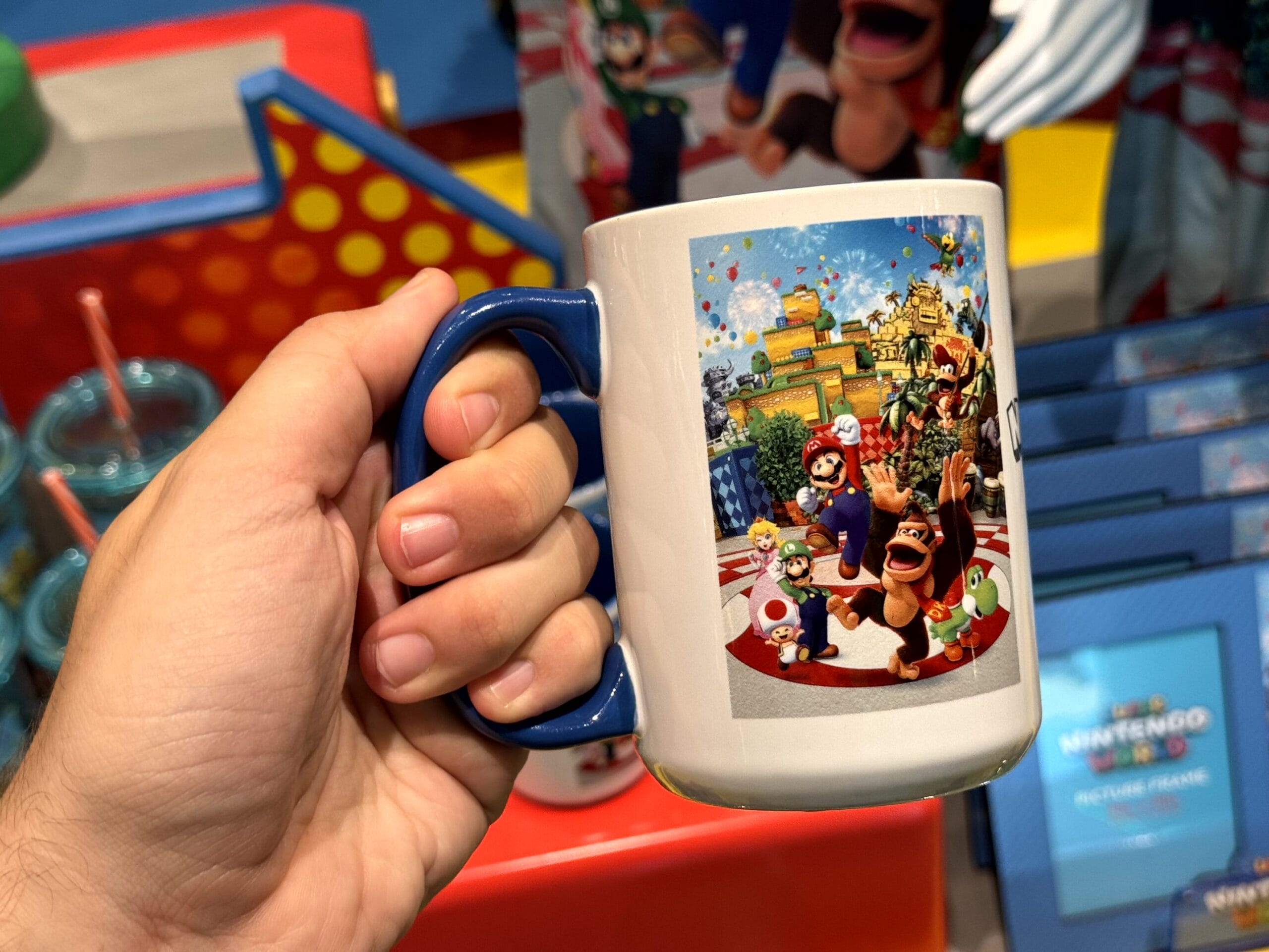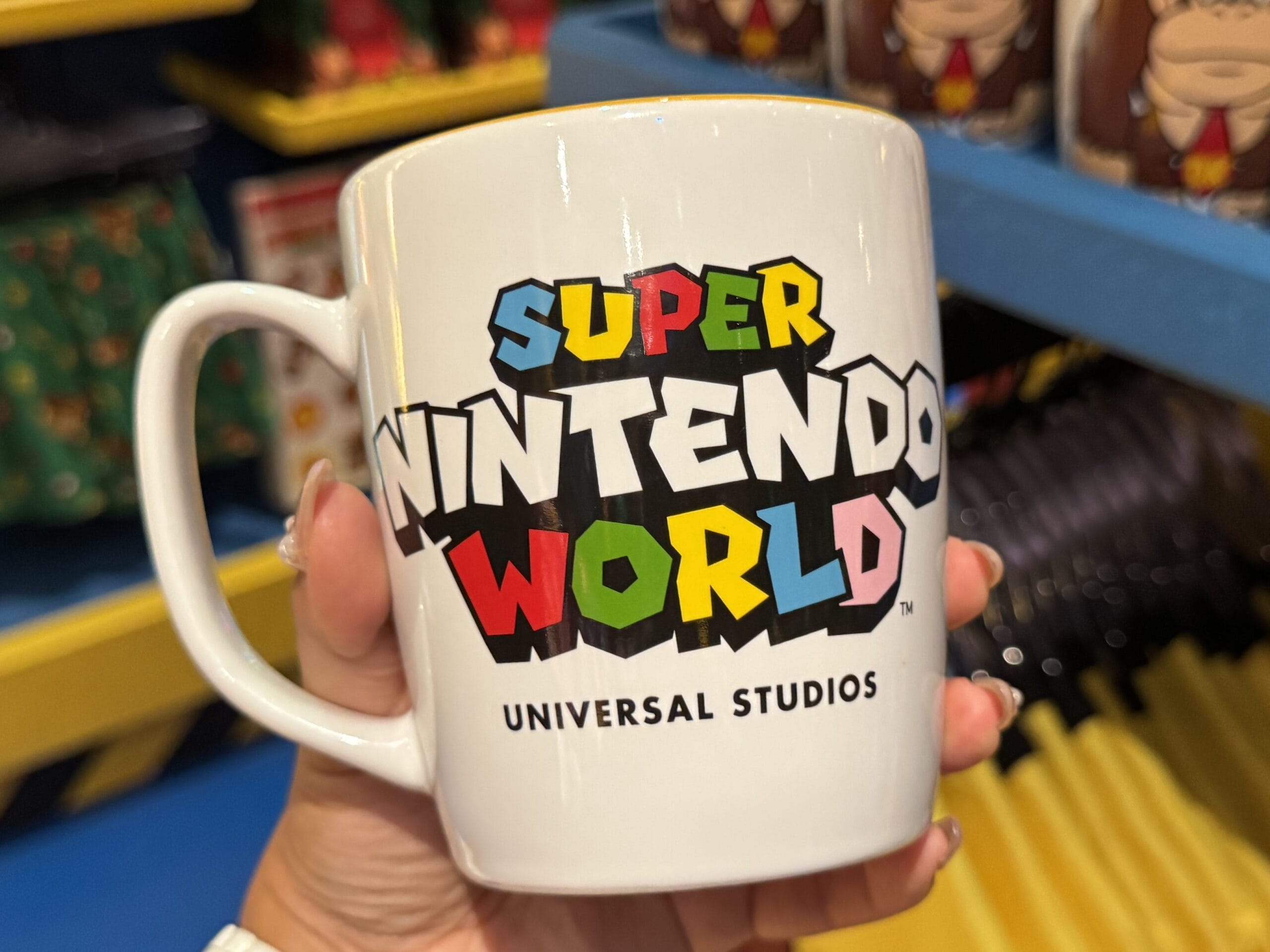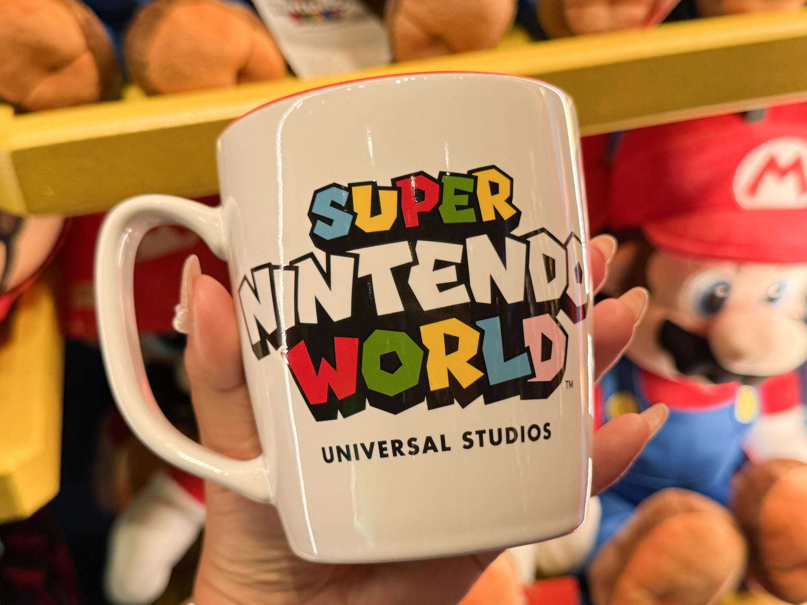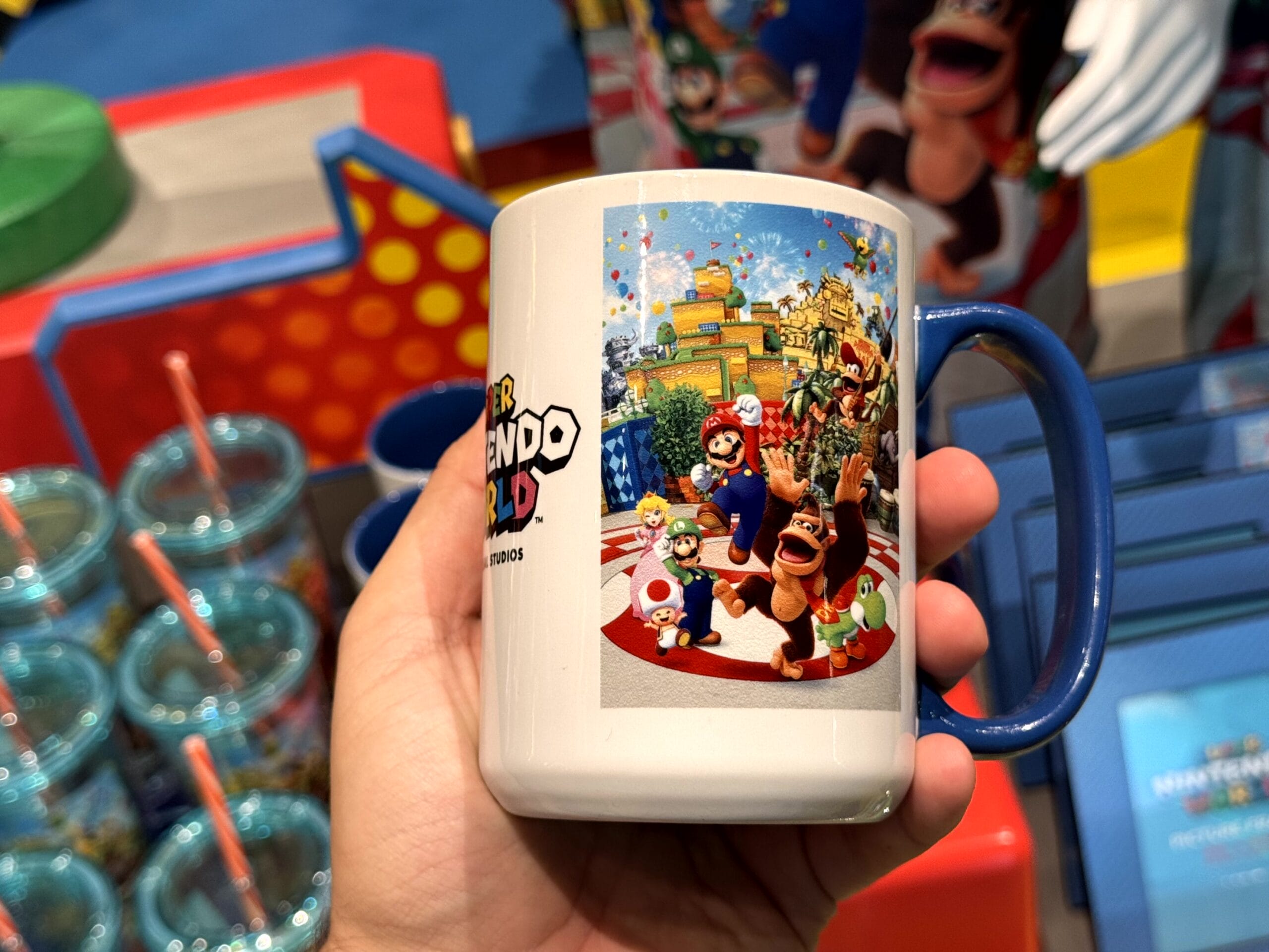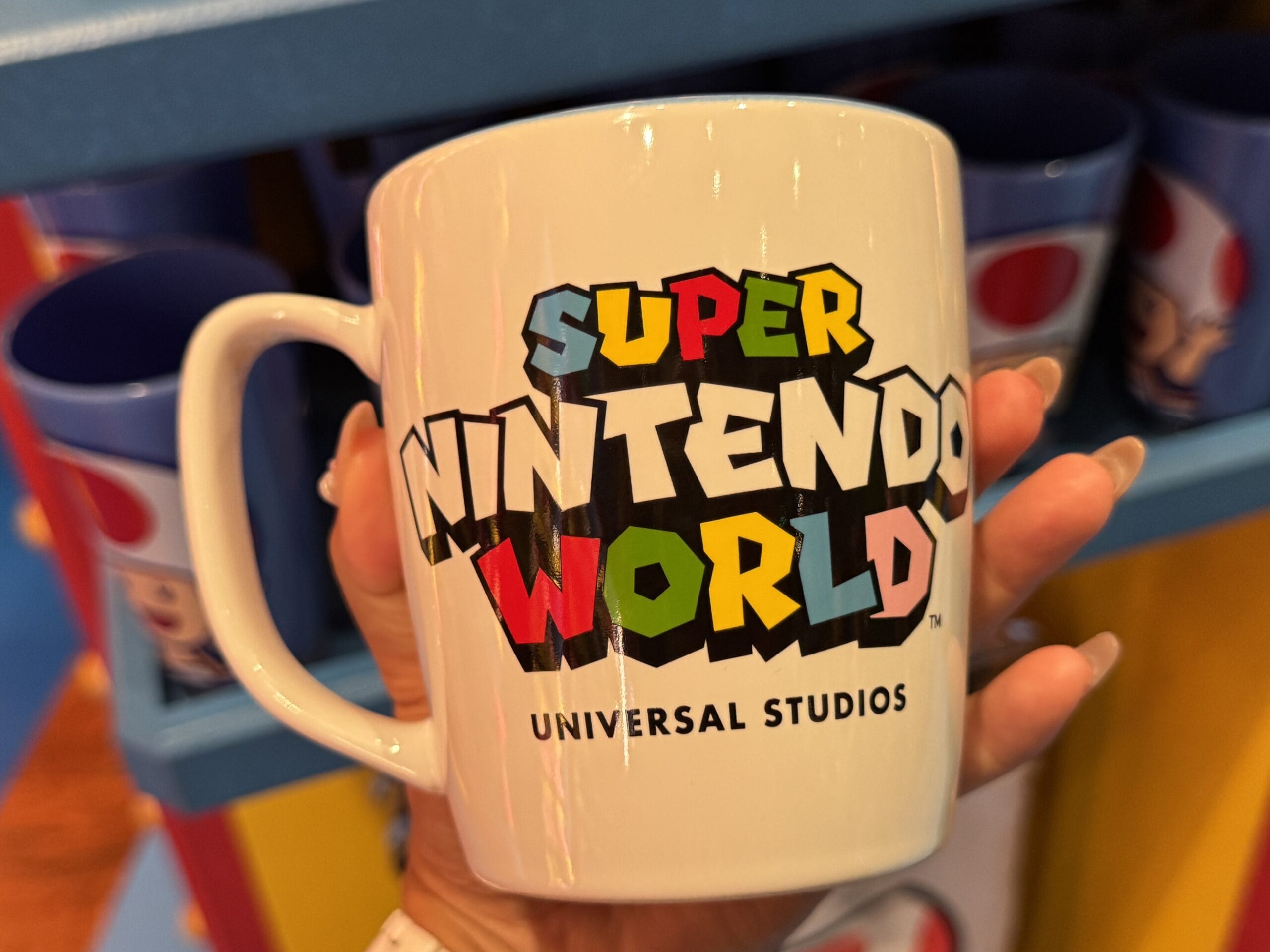 This mug is white with a blue handle and blue interior. The character ensemble art is on two sides. The Super Nintendo World logo is between the images.