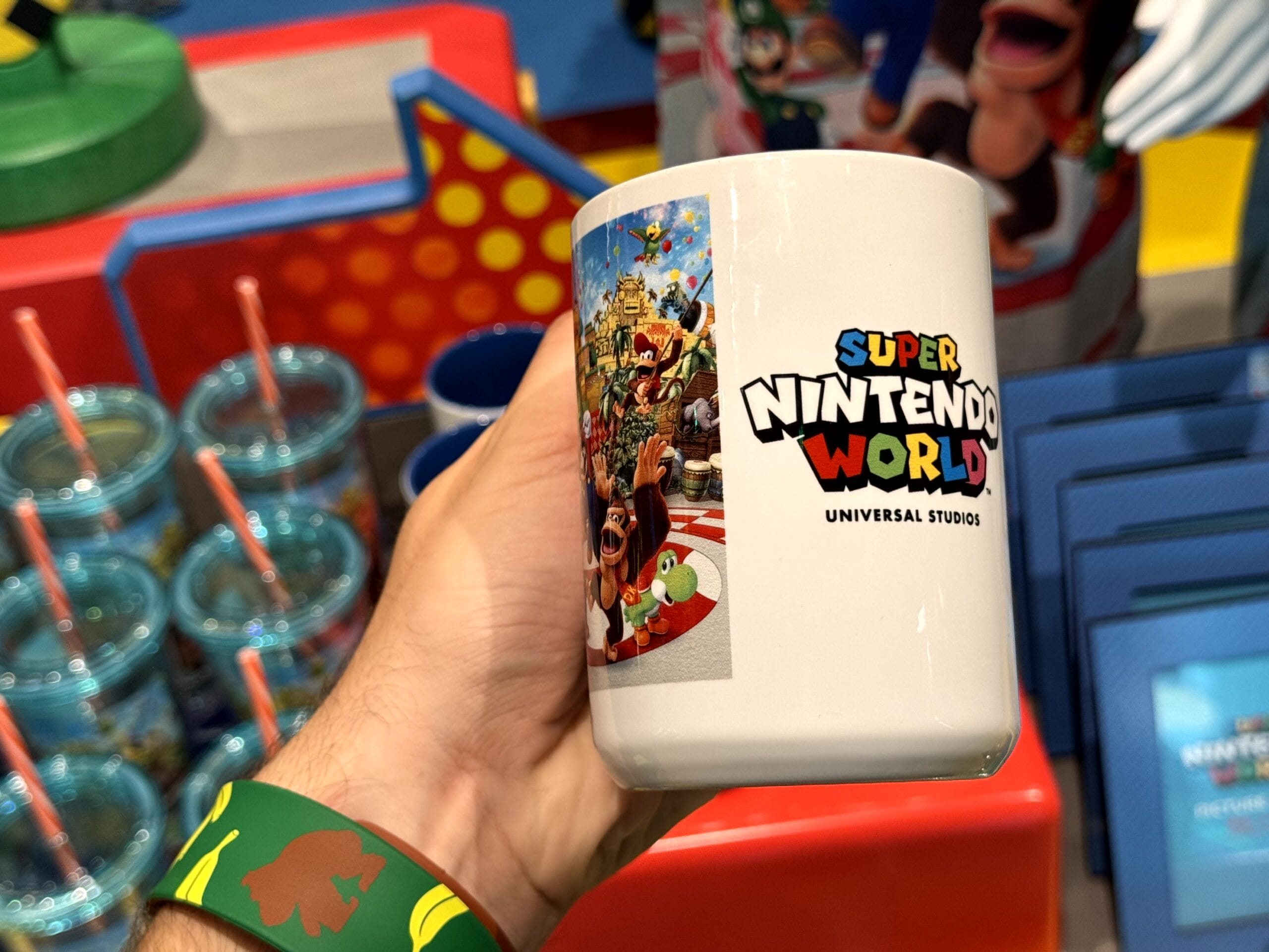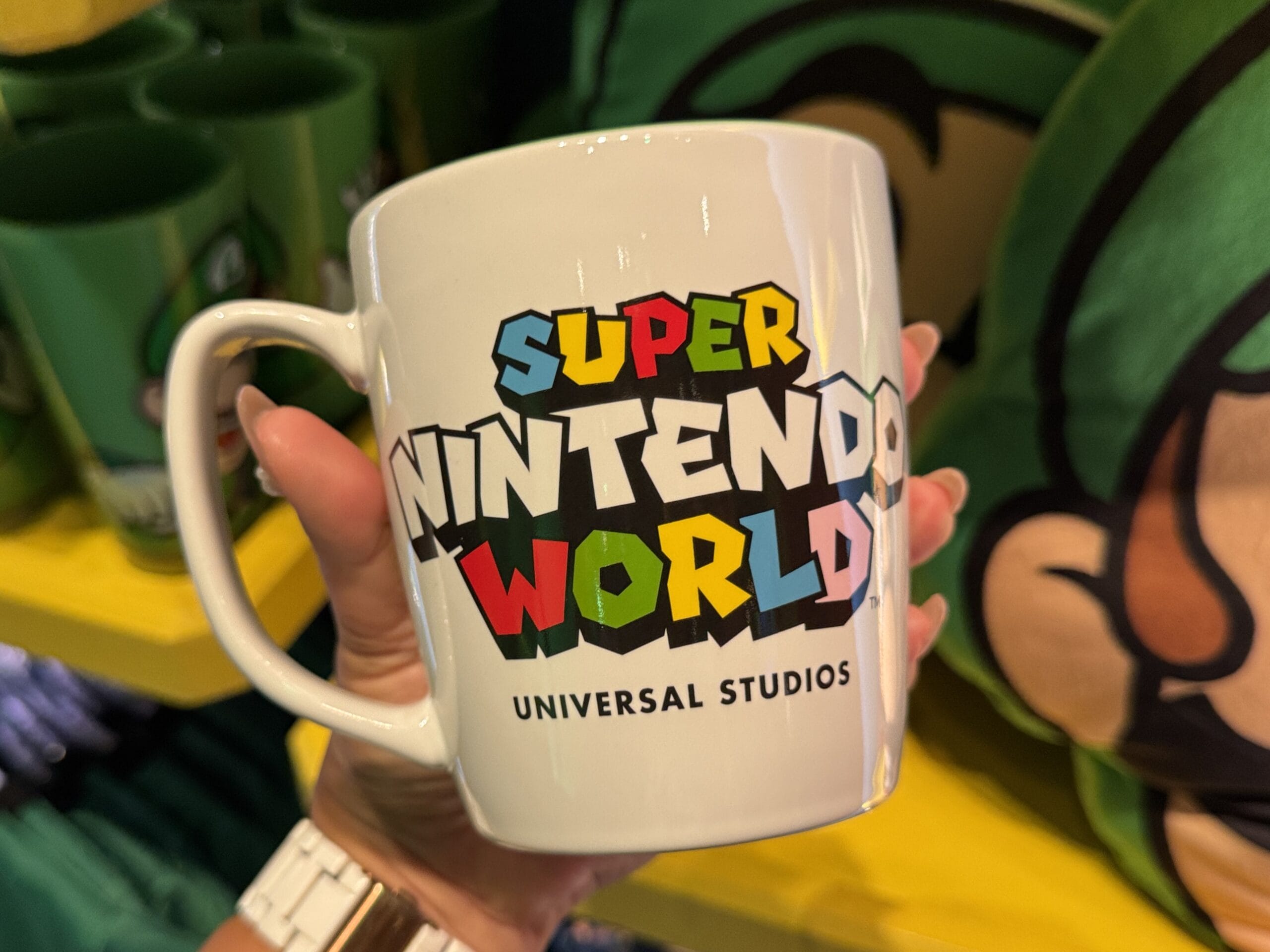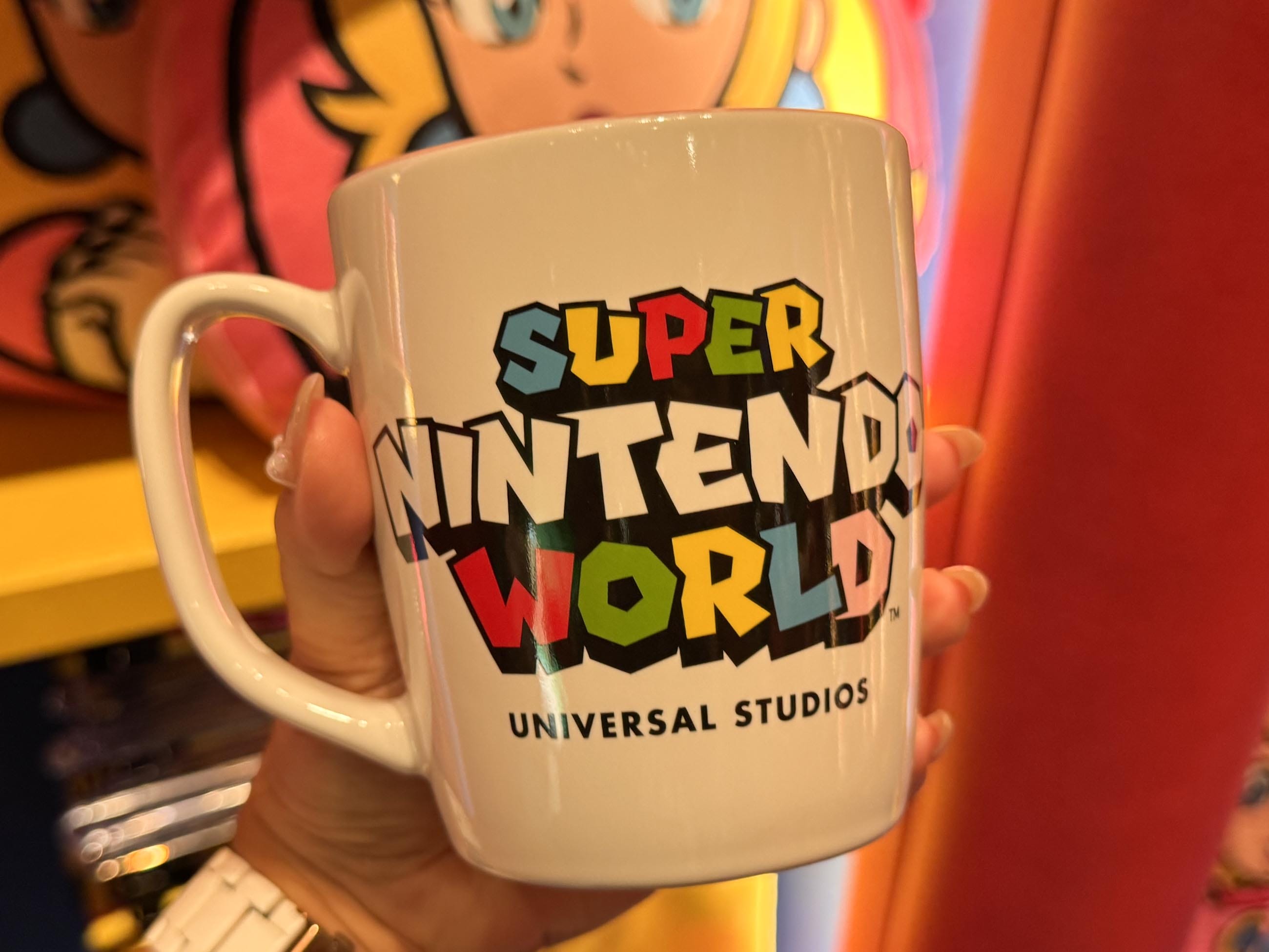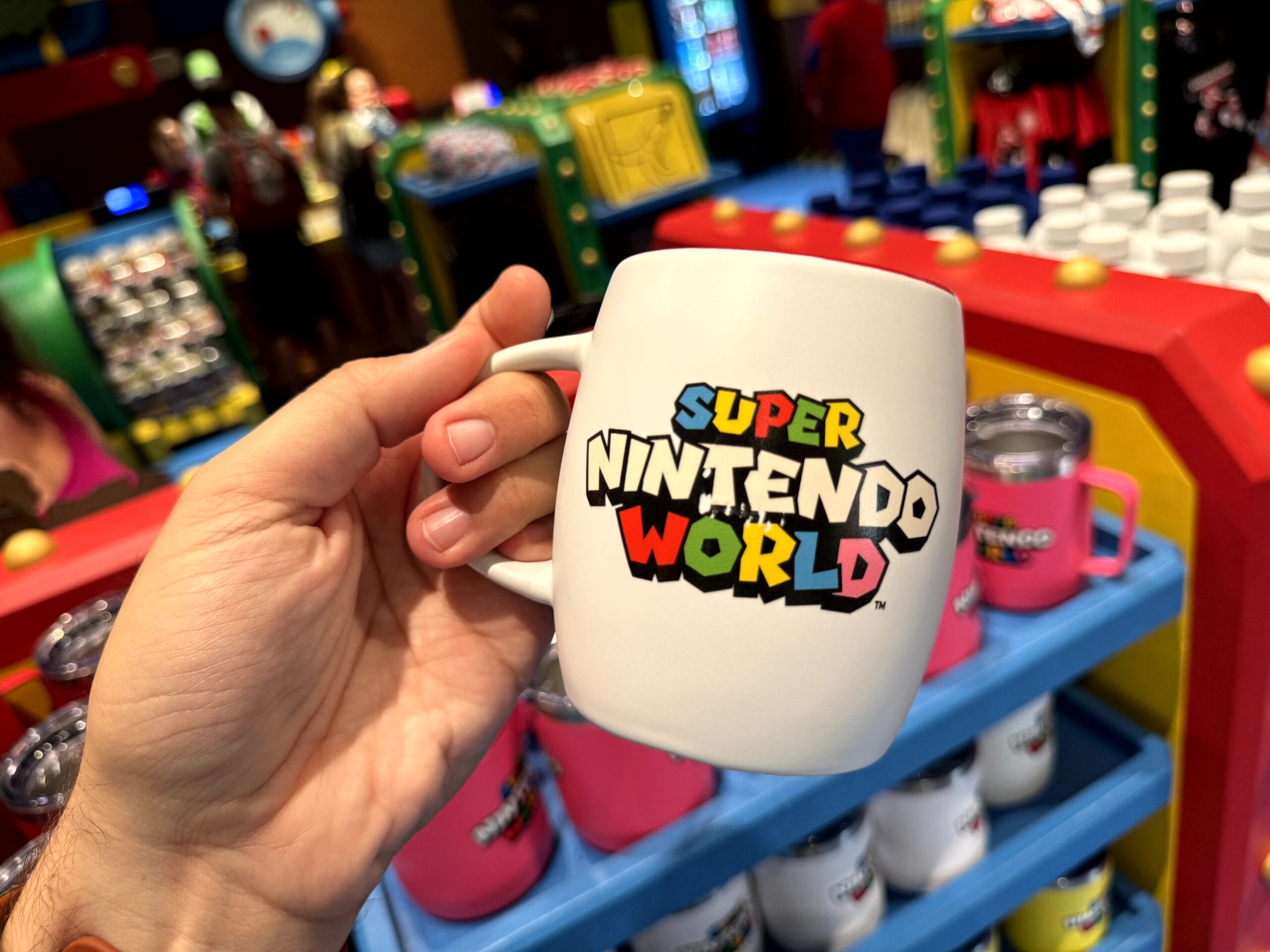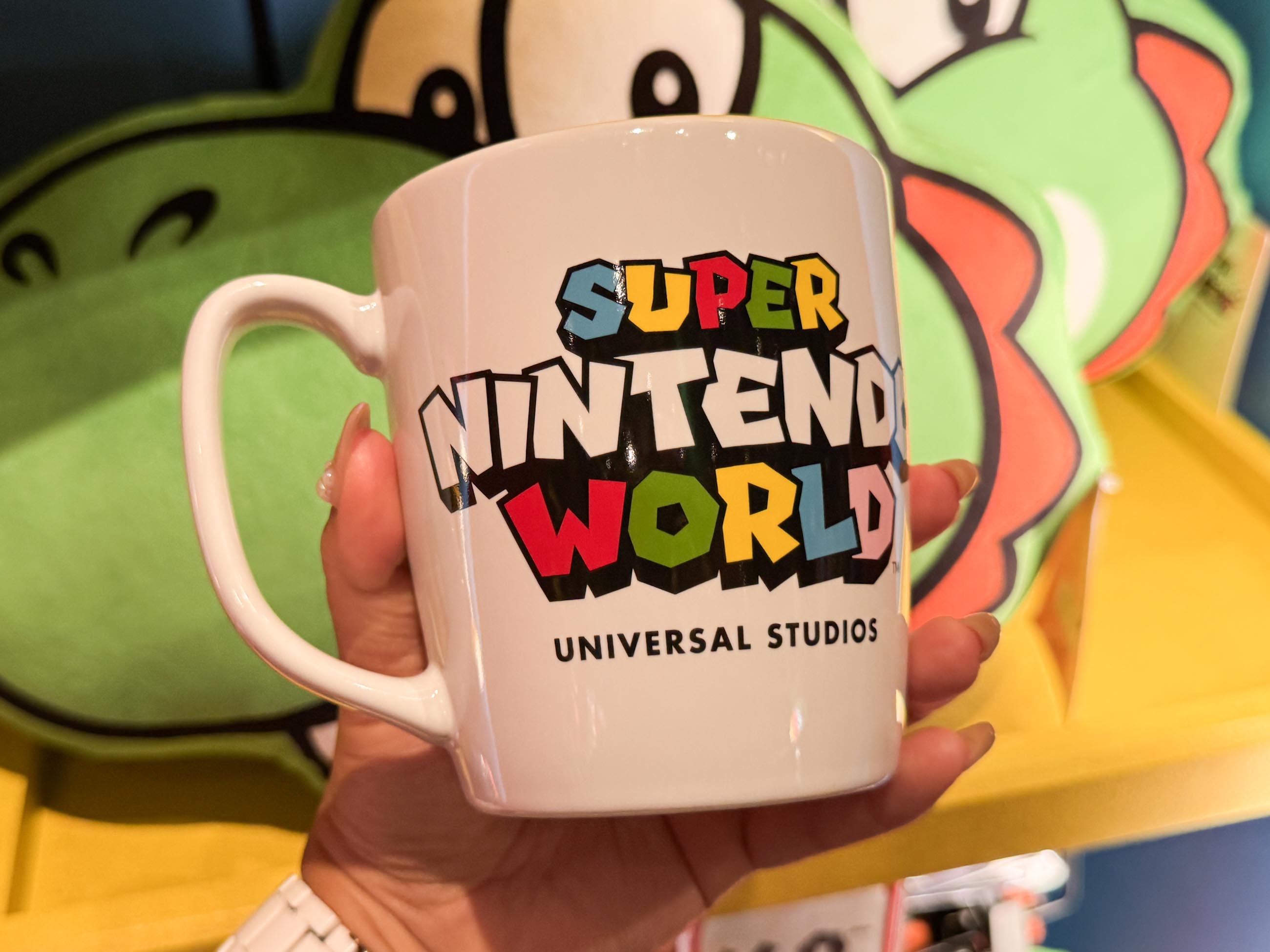 This mug is white with a blue handle and blue interior. The character ensemble art is on two sides. The Super Nintendo World logo is between the images.