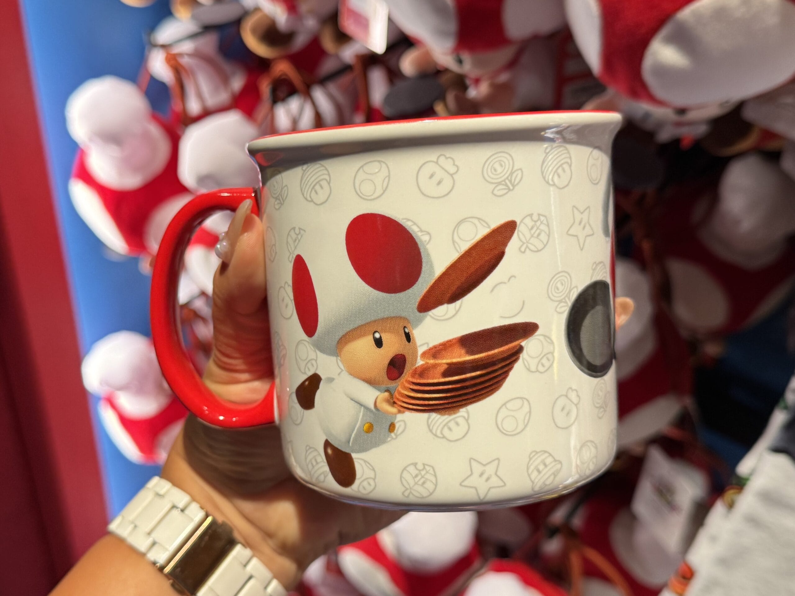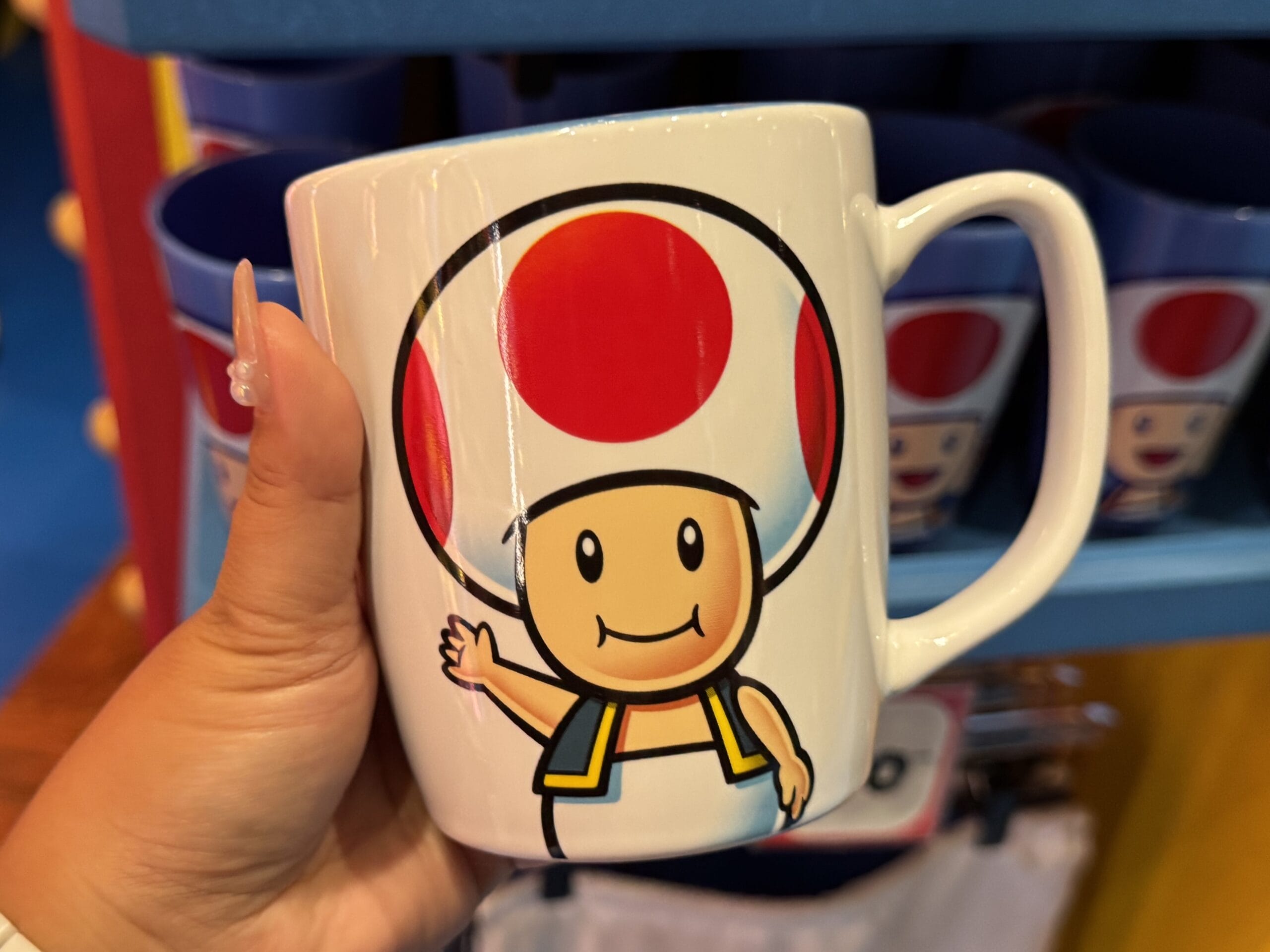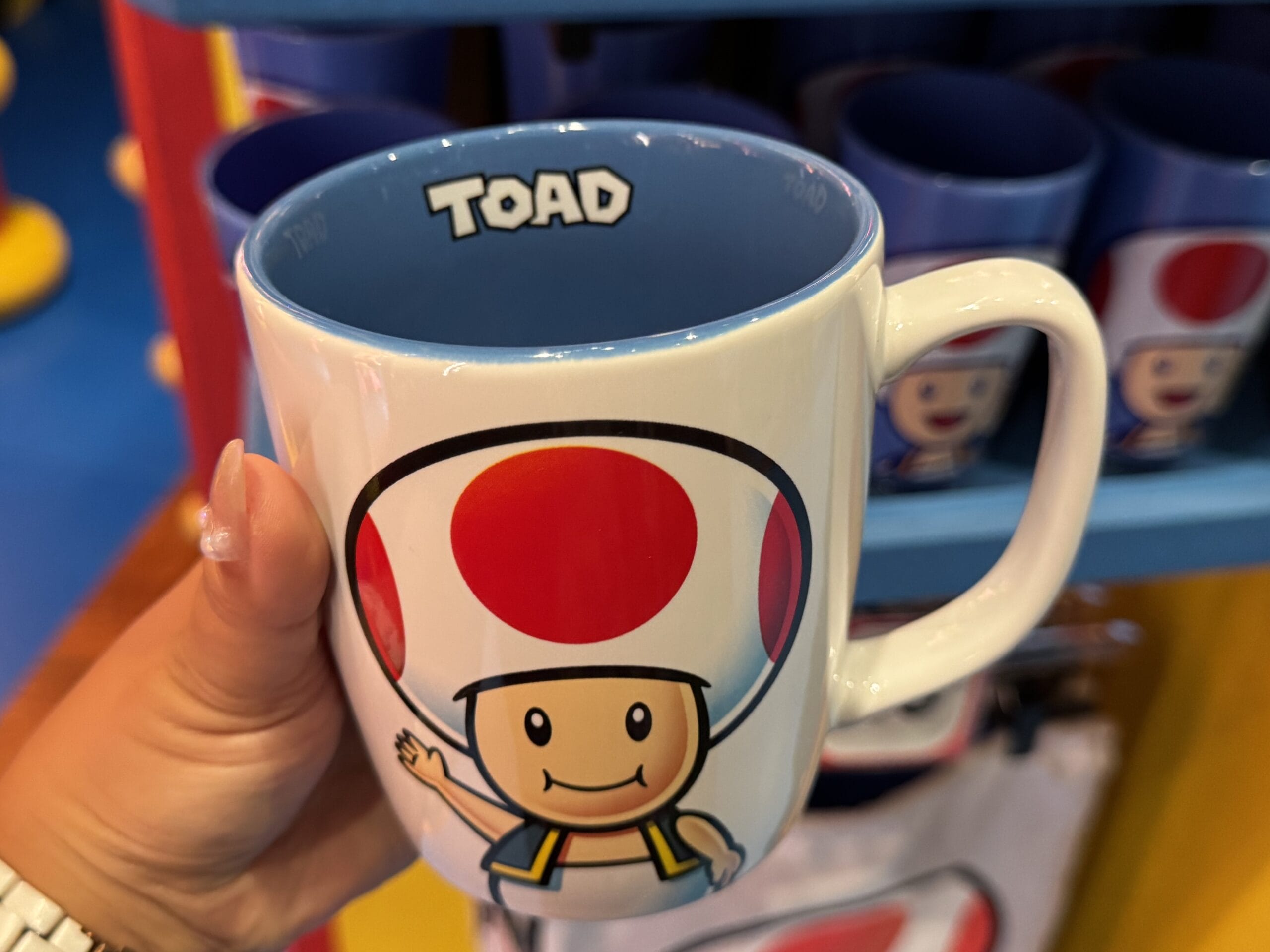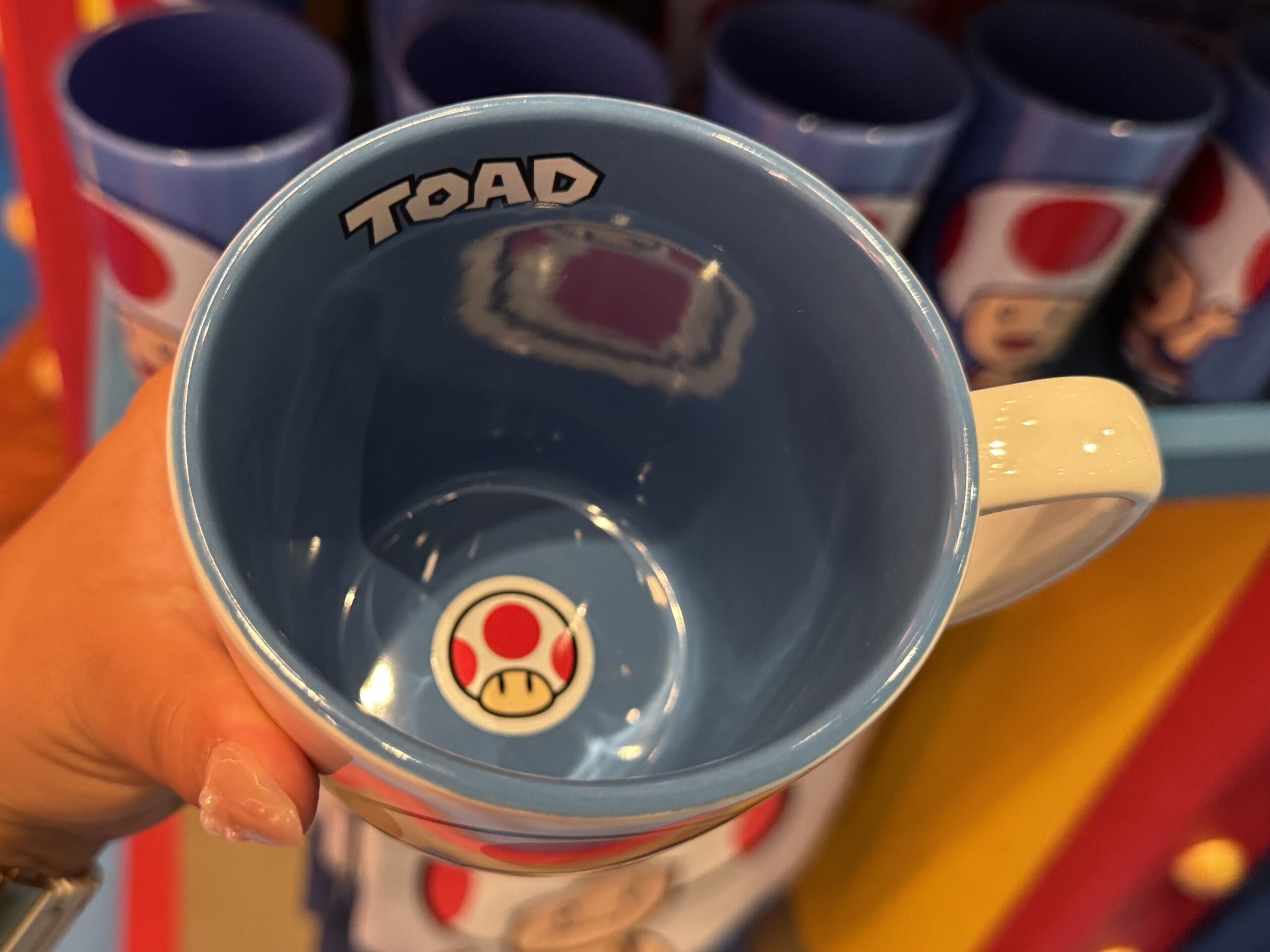 The Toad mug has a blue interior. “Toad” is near the rim and his mushroom face is at the bottom. On the exterior, Toad is waving on one side and the Super Nintendo World logo is on the other side.