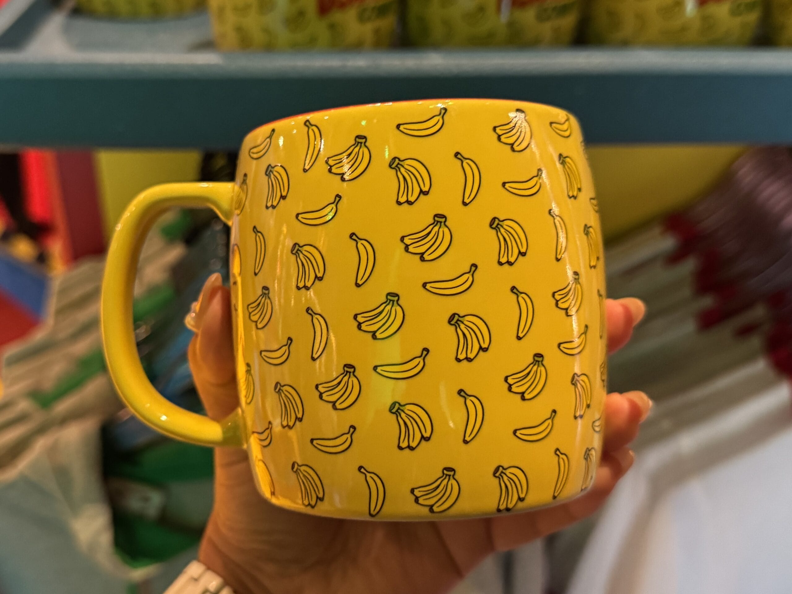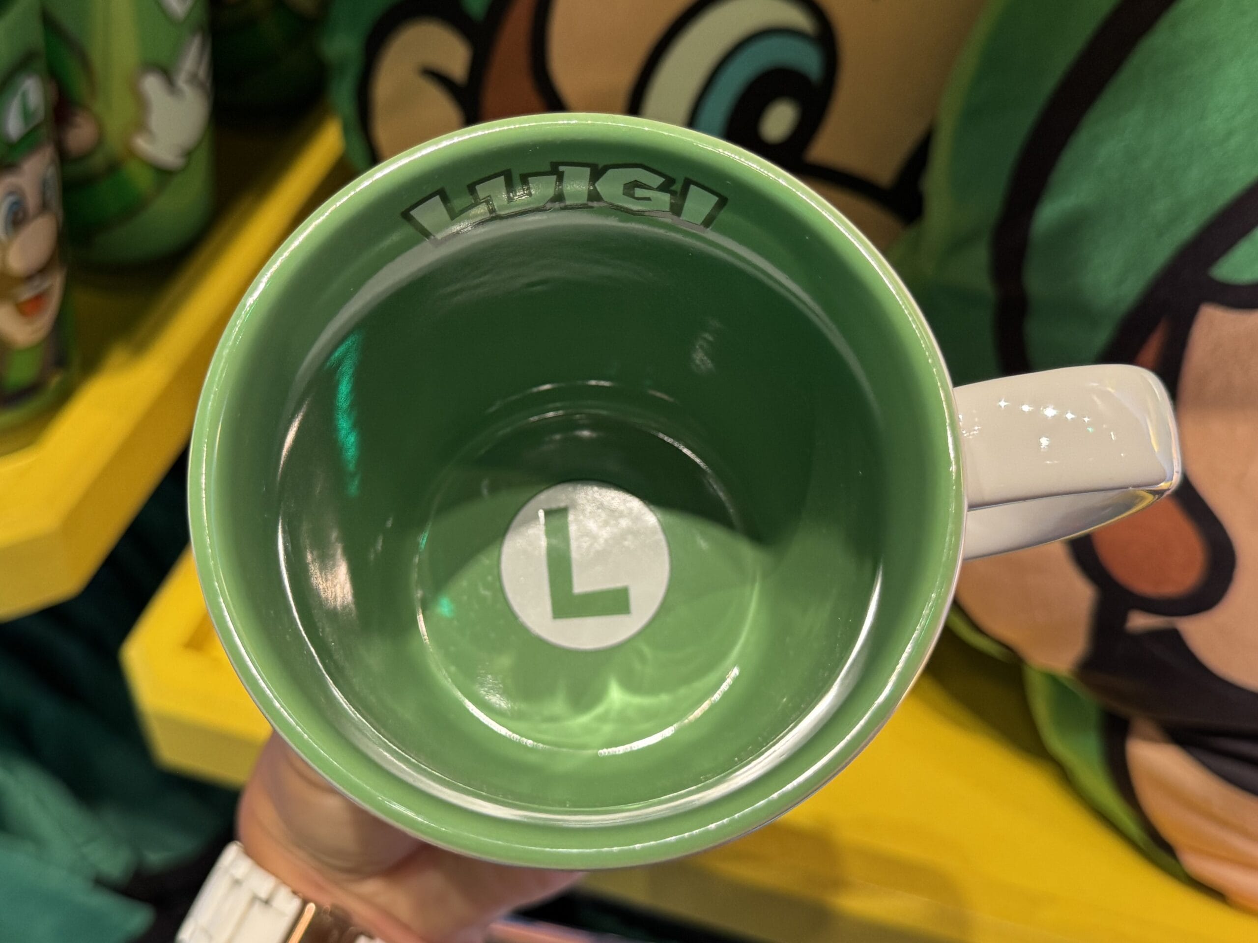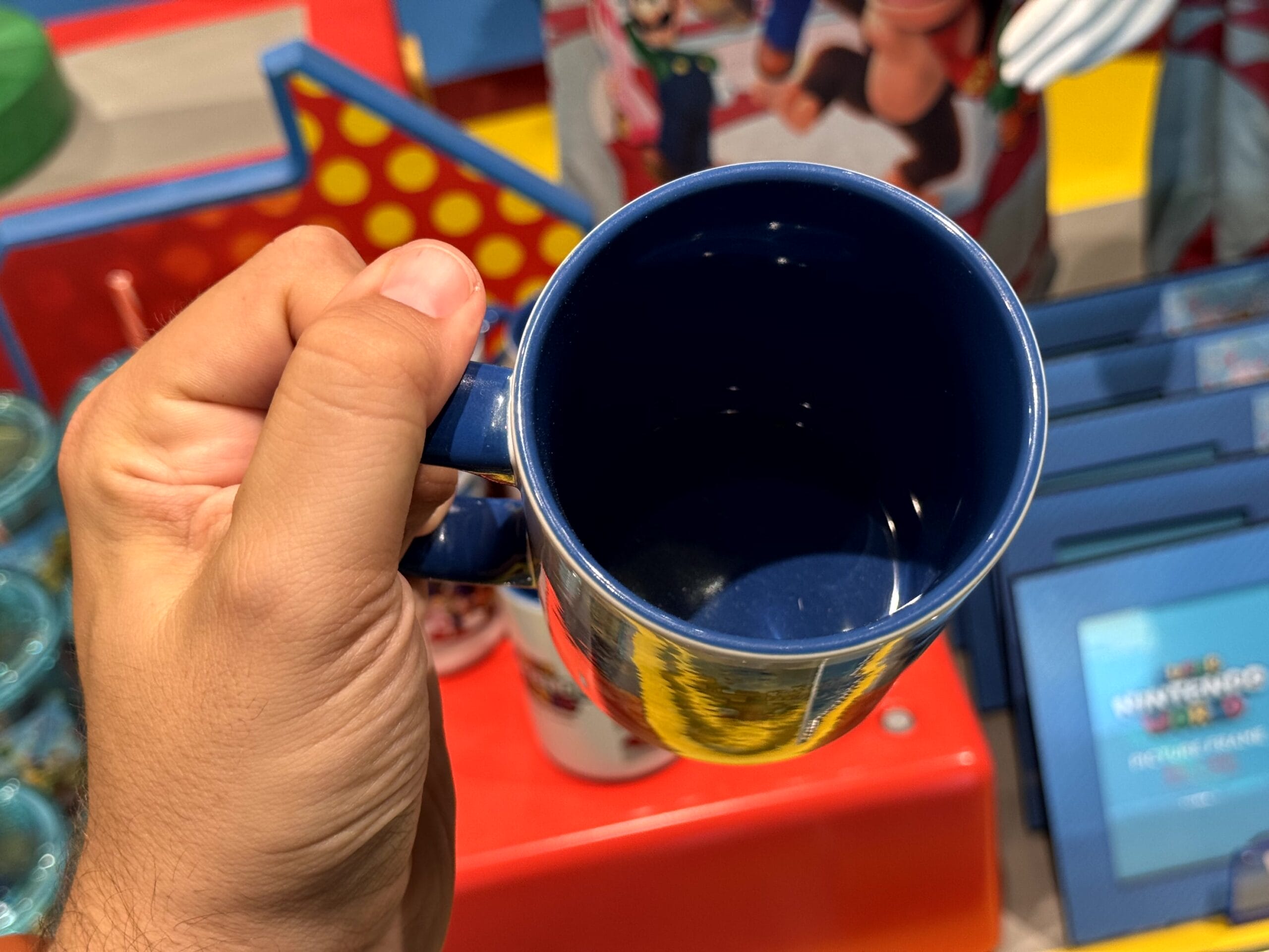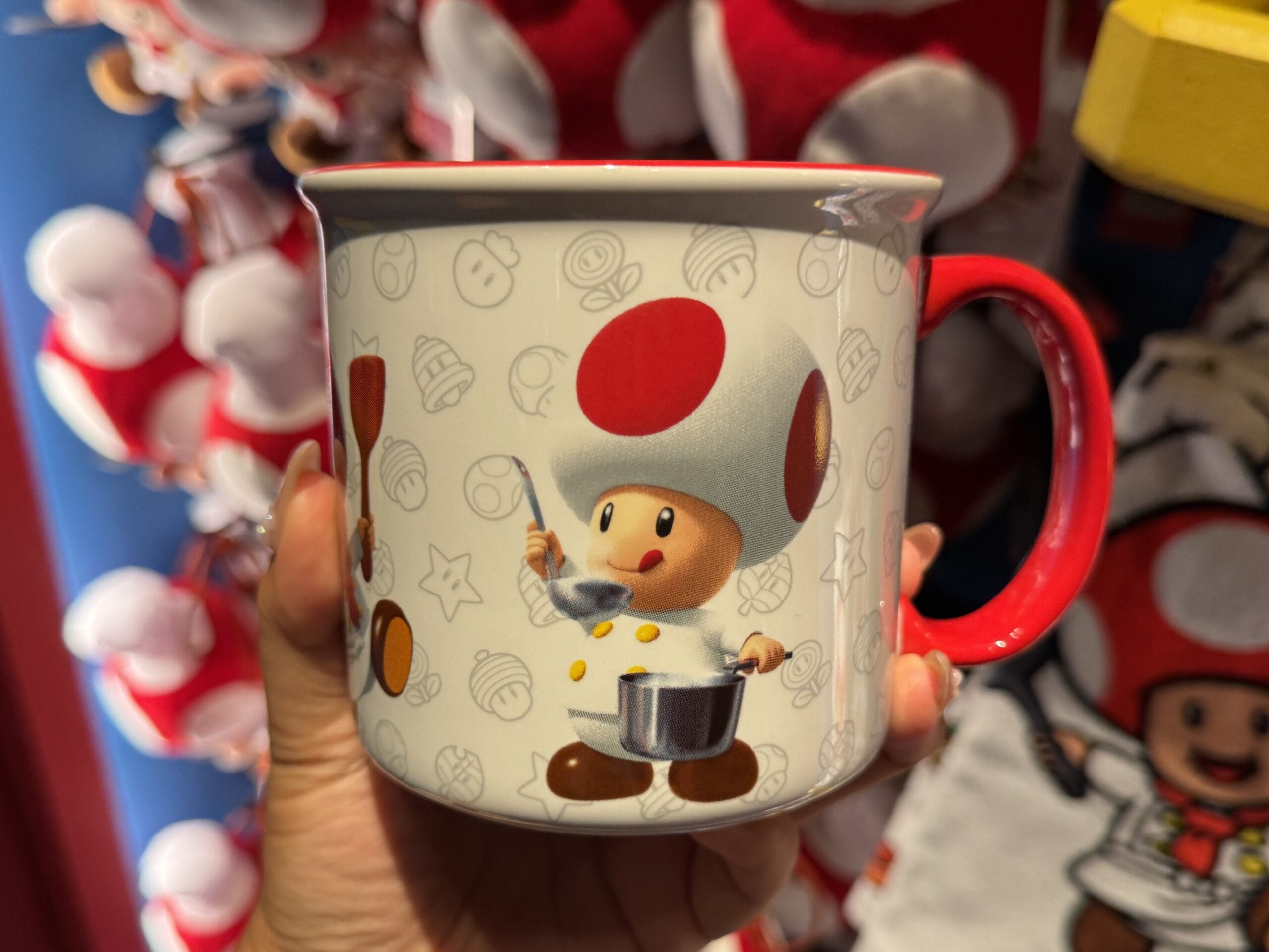 The Toad mug has a blue interior. “Toad” is near the rim and his mushroom face is at the bottom. On the exterior, Toad is waving on one side and the Super Nintendo World logo is on the other side.
