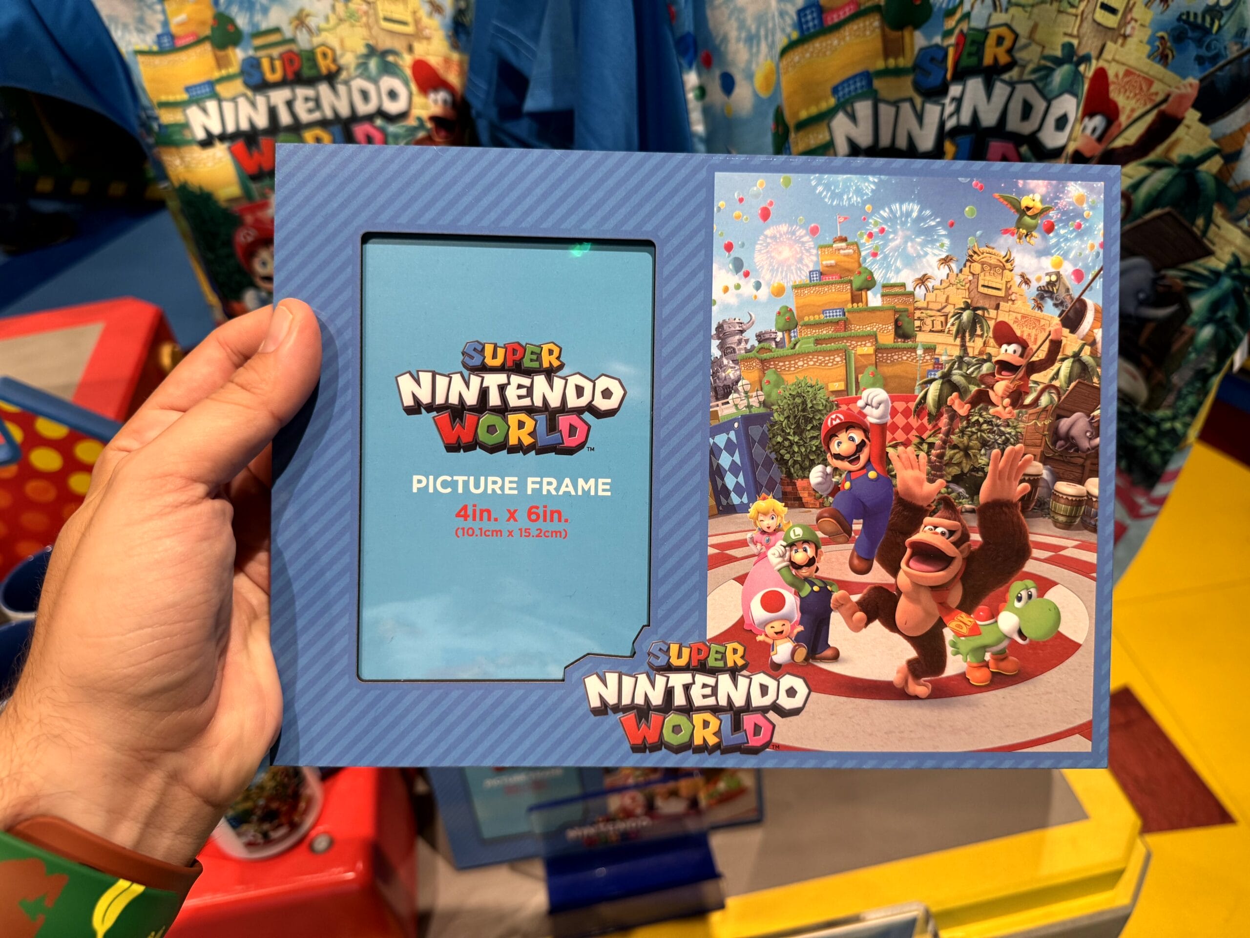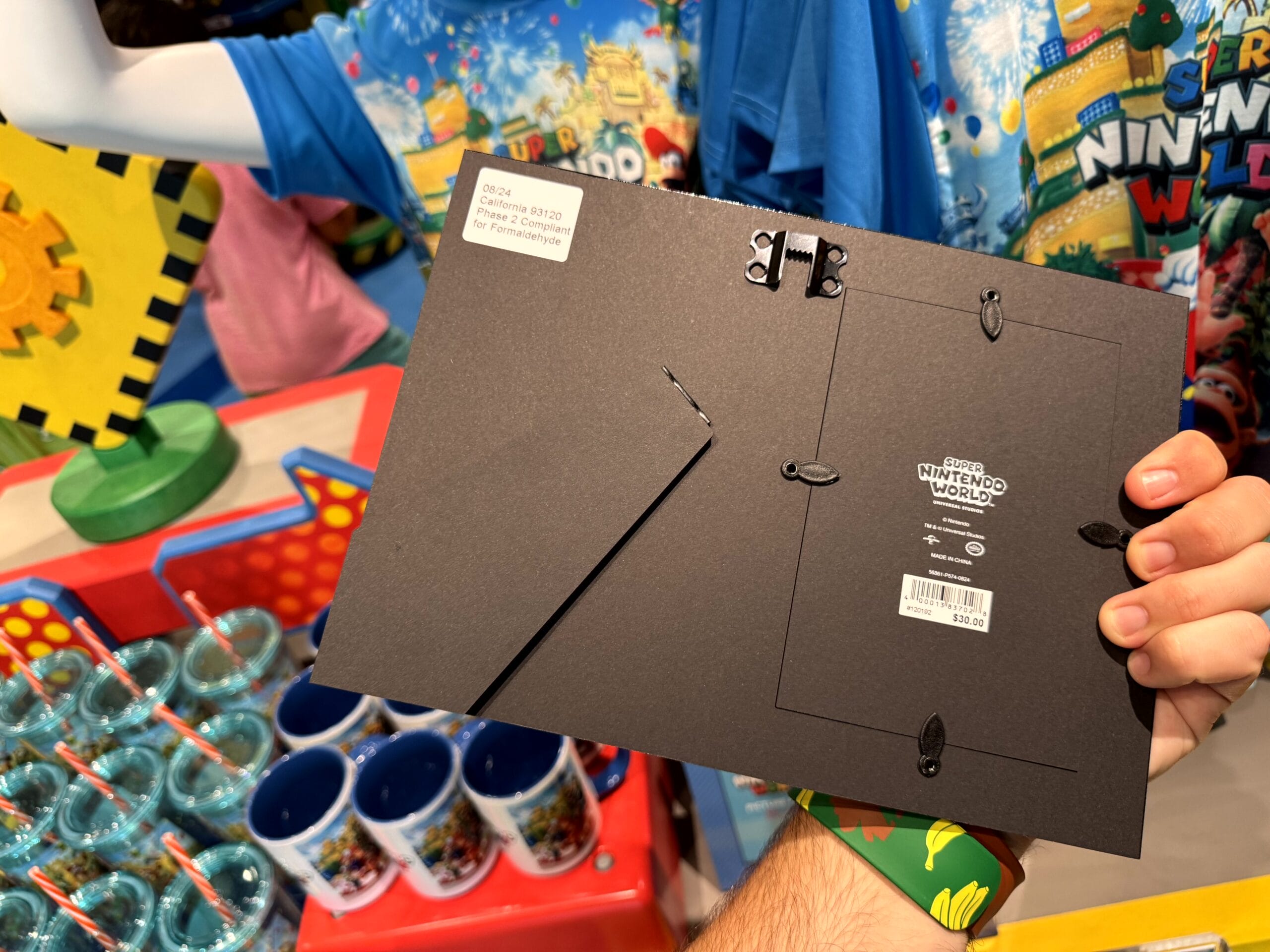 The character art is on the front of this frame, alongside the opening for a 4 x 6 photo. Around the photo opening are subtle blue stripes. The Super Nintendo World logo is at the bottom. The back is black with hardware for hanging and a stand.