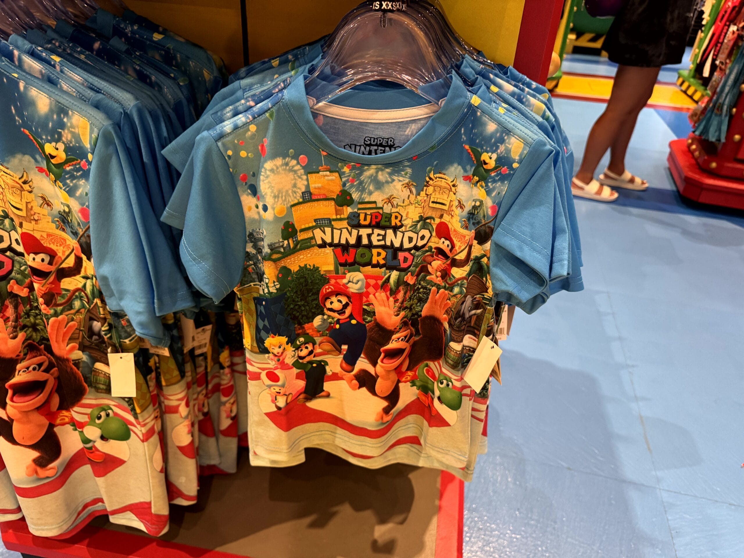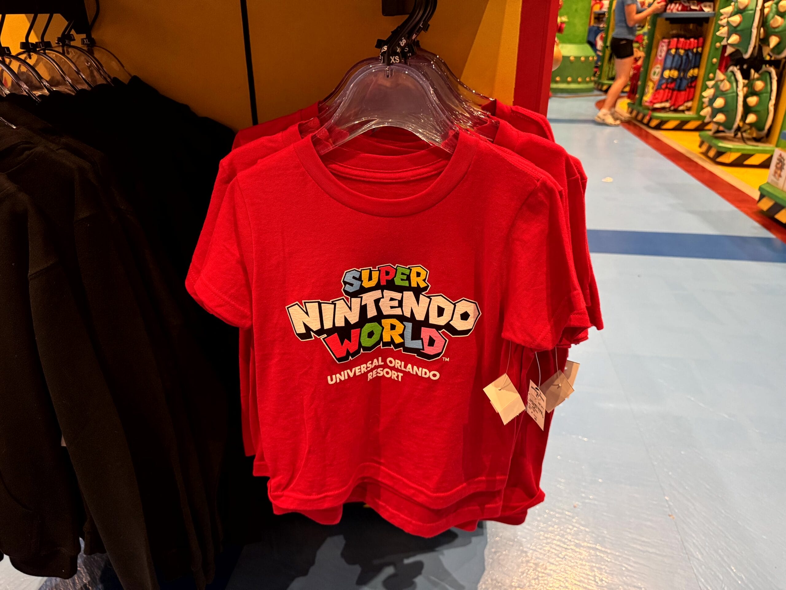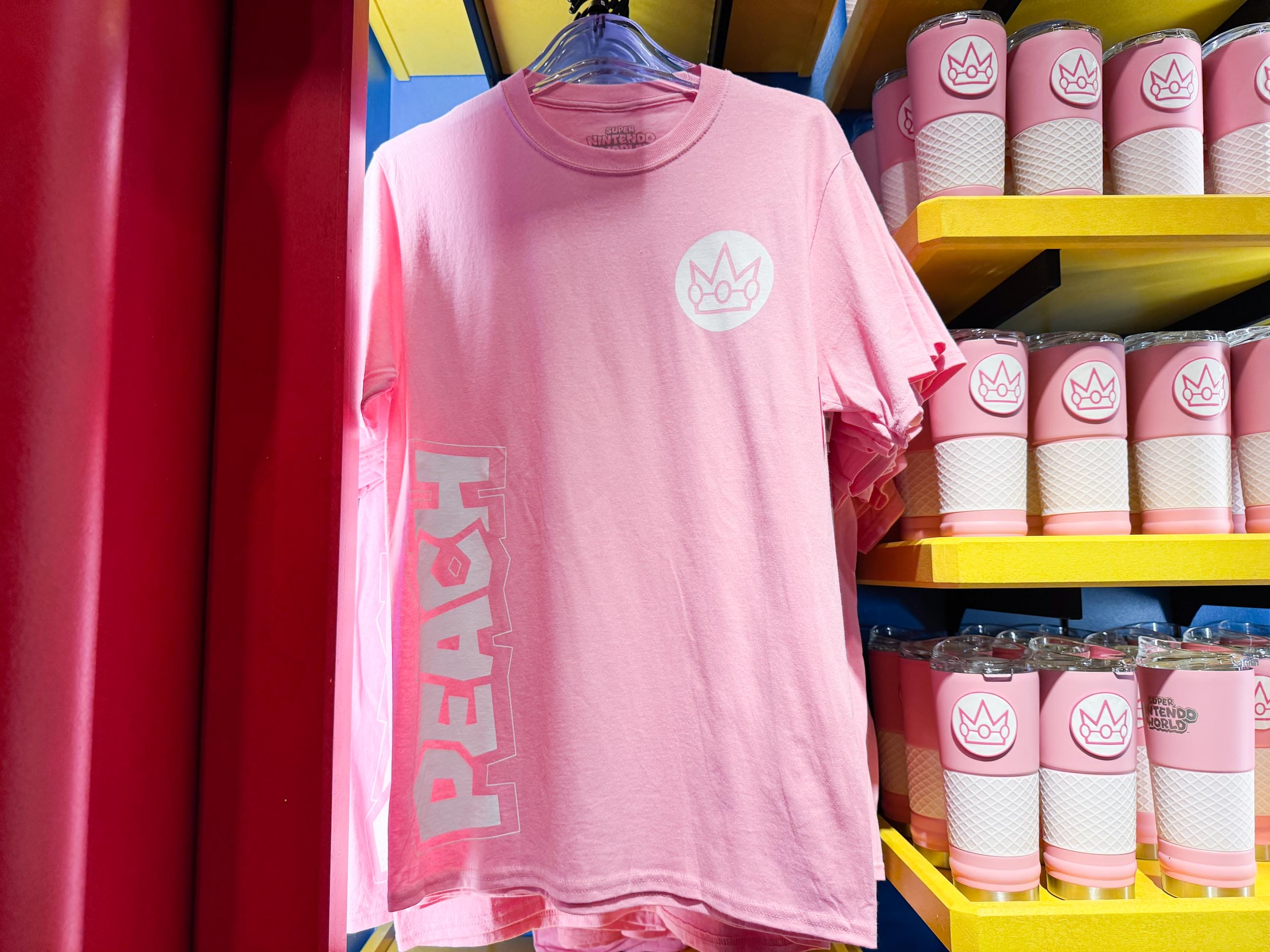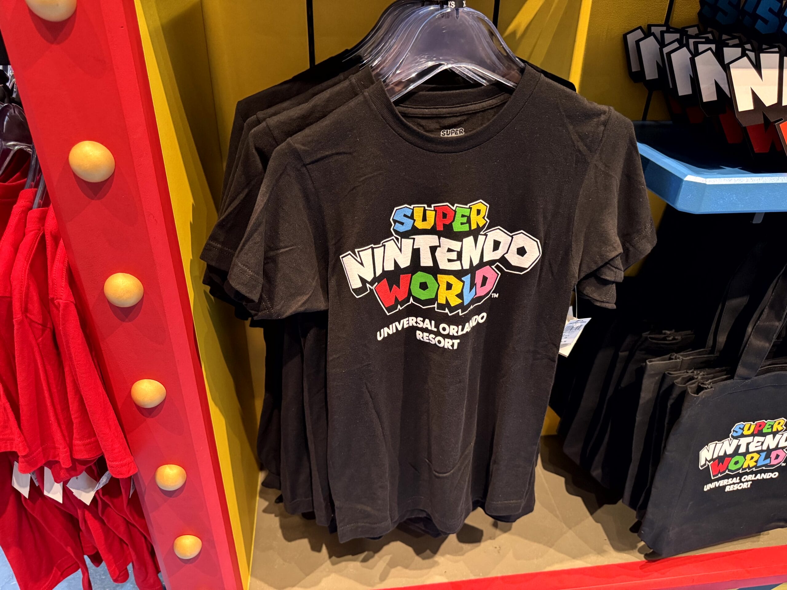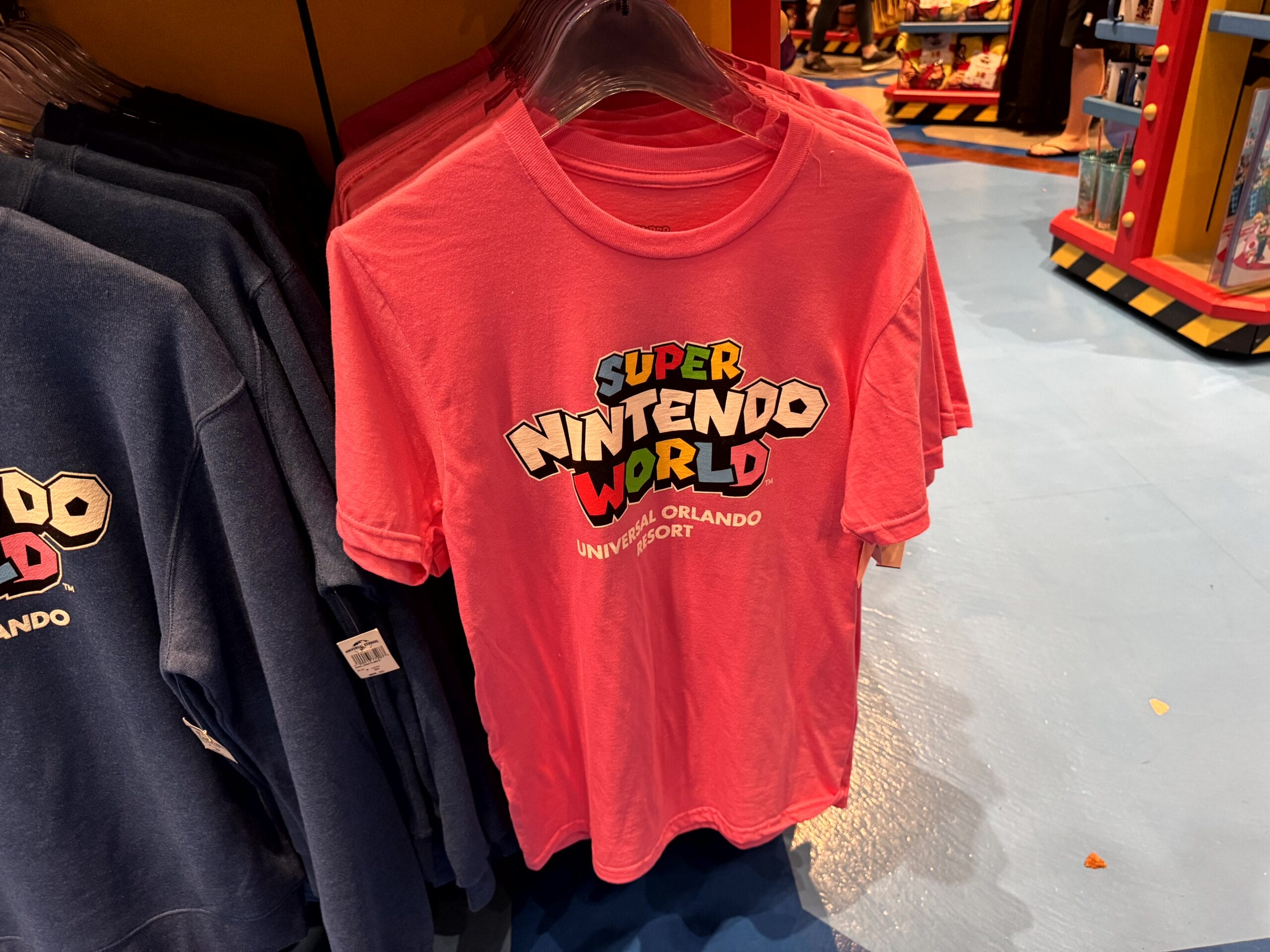 The pink t-shirt similarly has the Super Nintendo World and “Universal Orlando Resort.”