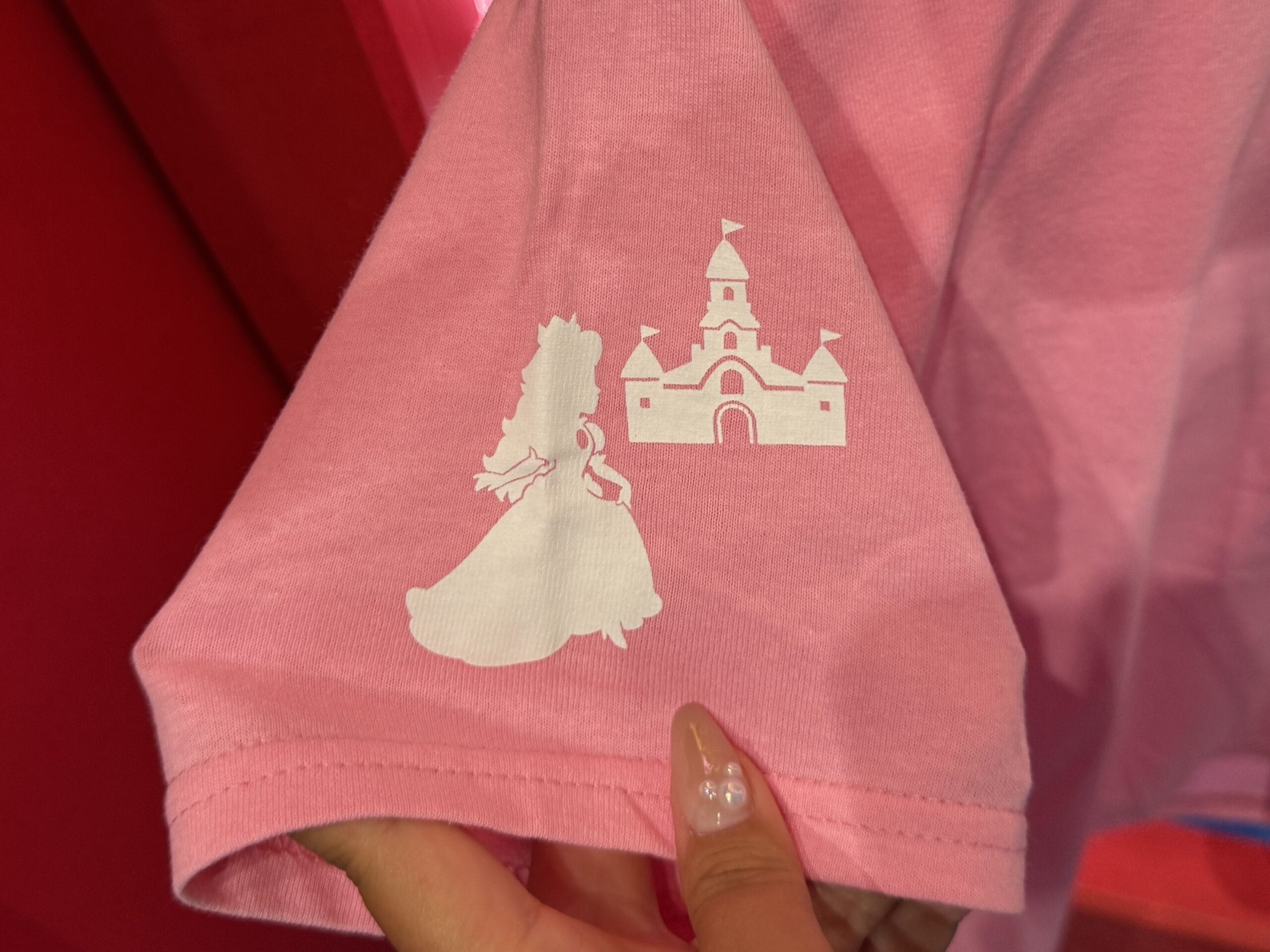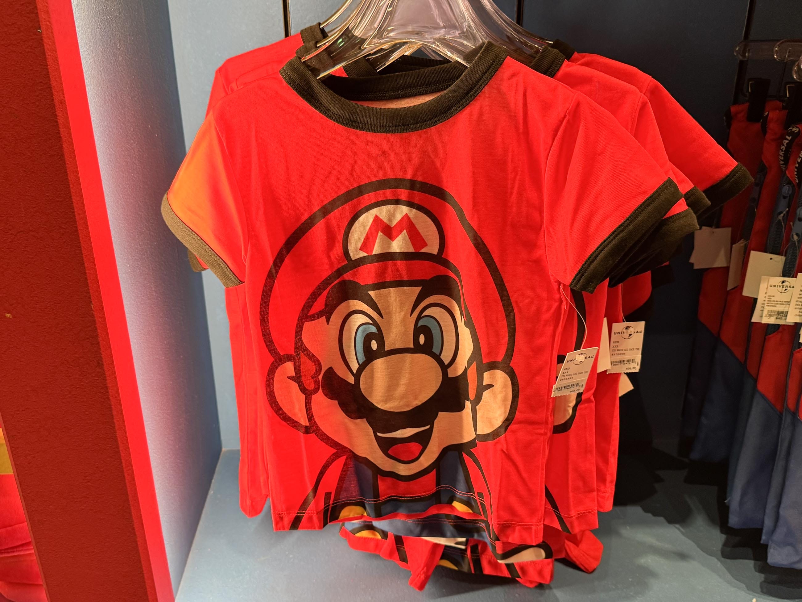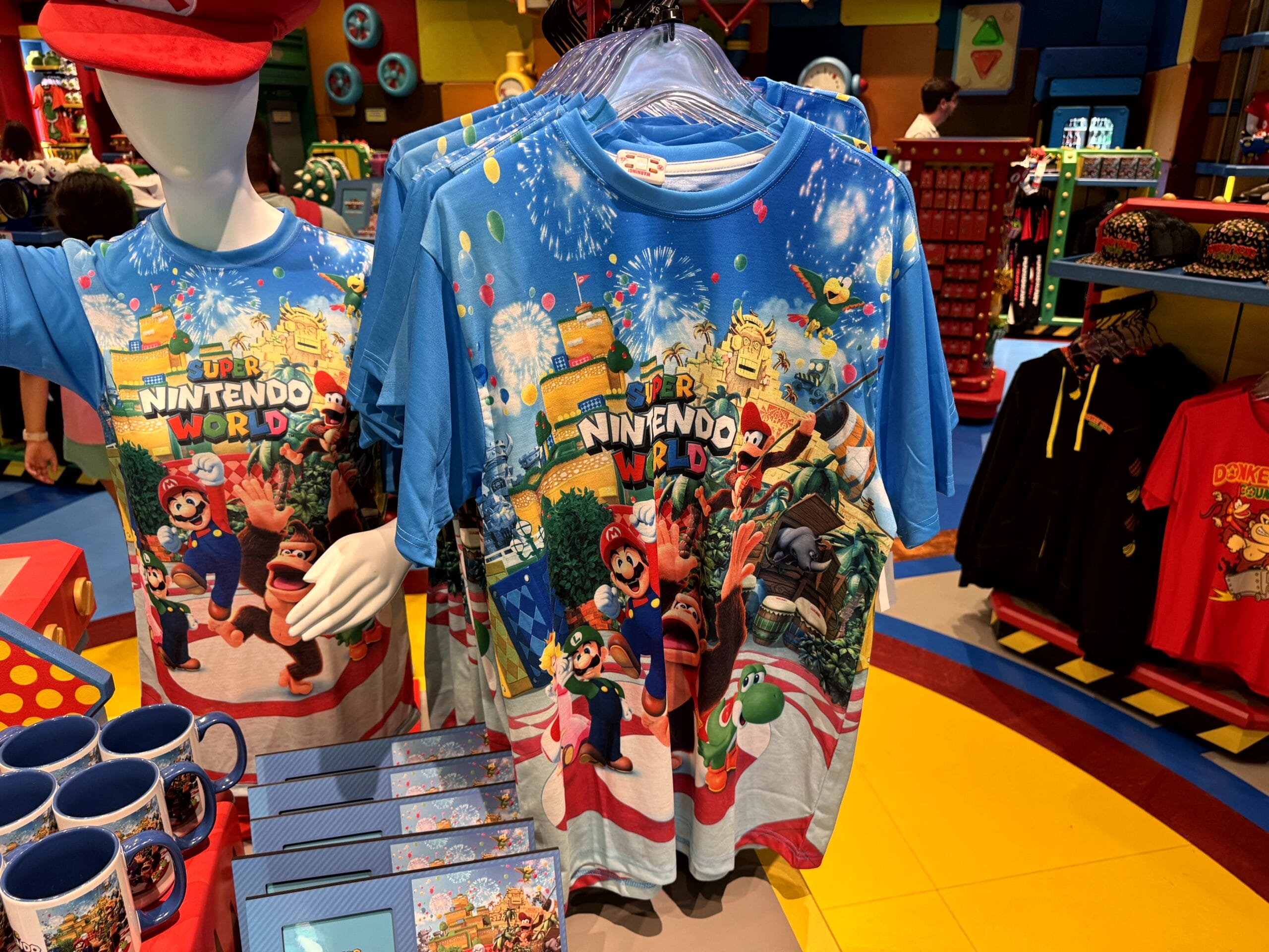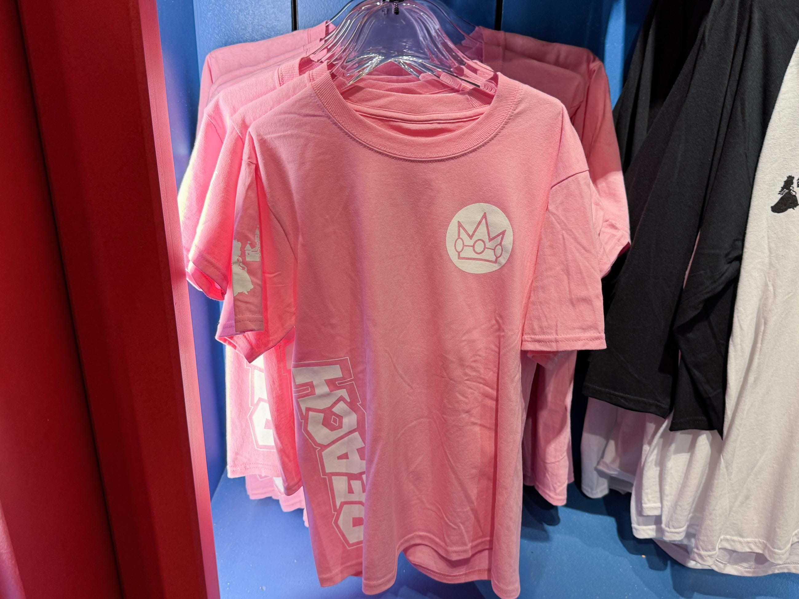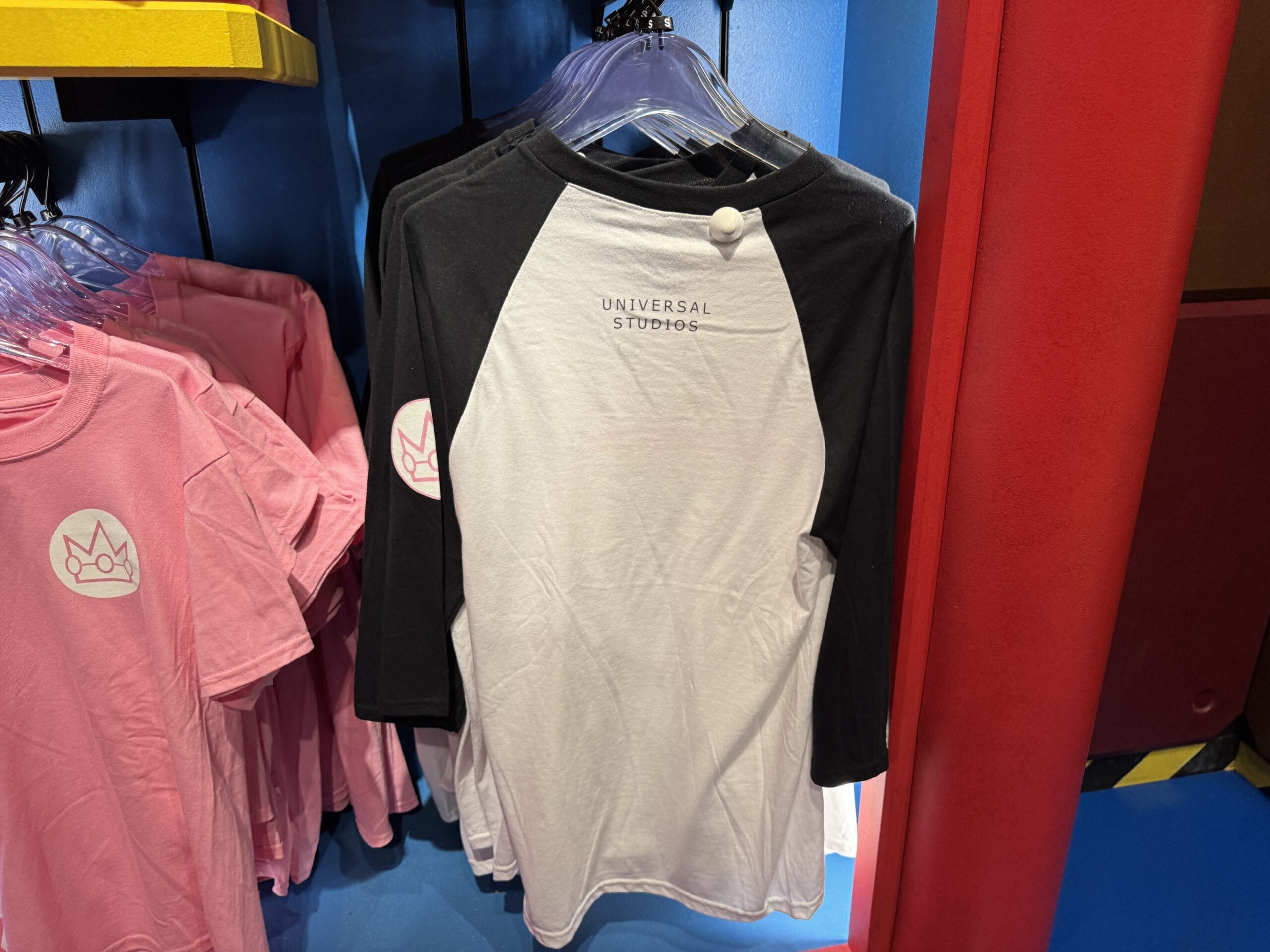 The pink t-shirt similarly has the Super Nintendo World and “Universal Orlando Resort.”